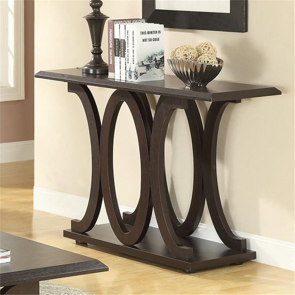 Includes: One (1) sofa table Finish: Cappuccino Materials: Wood, MDF, Particle Board, Hollow Board, Engineered Veneer Transitional styled occasional set designed to match with any decor Distinctive C-shaped base Beautiful beveled wood top Open bottom shelves add convenient storage space Leveler/ plastic glide: Plastic glide Shape: Rectangular
