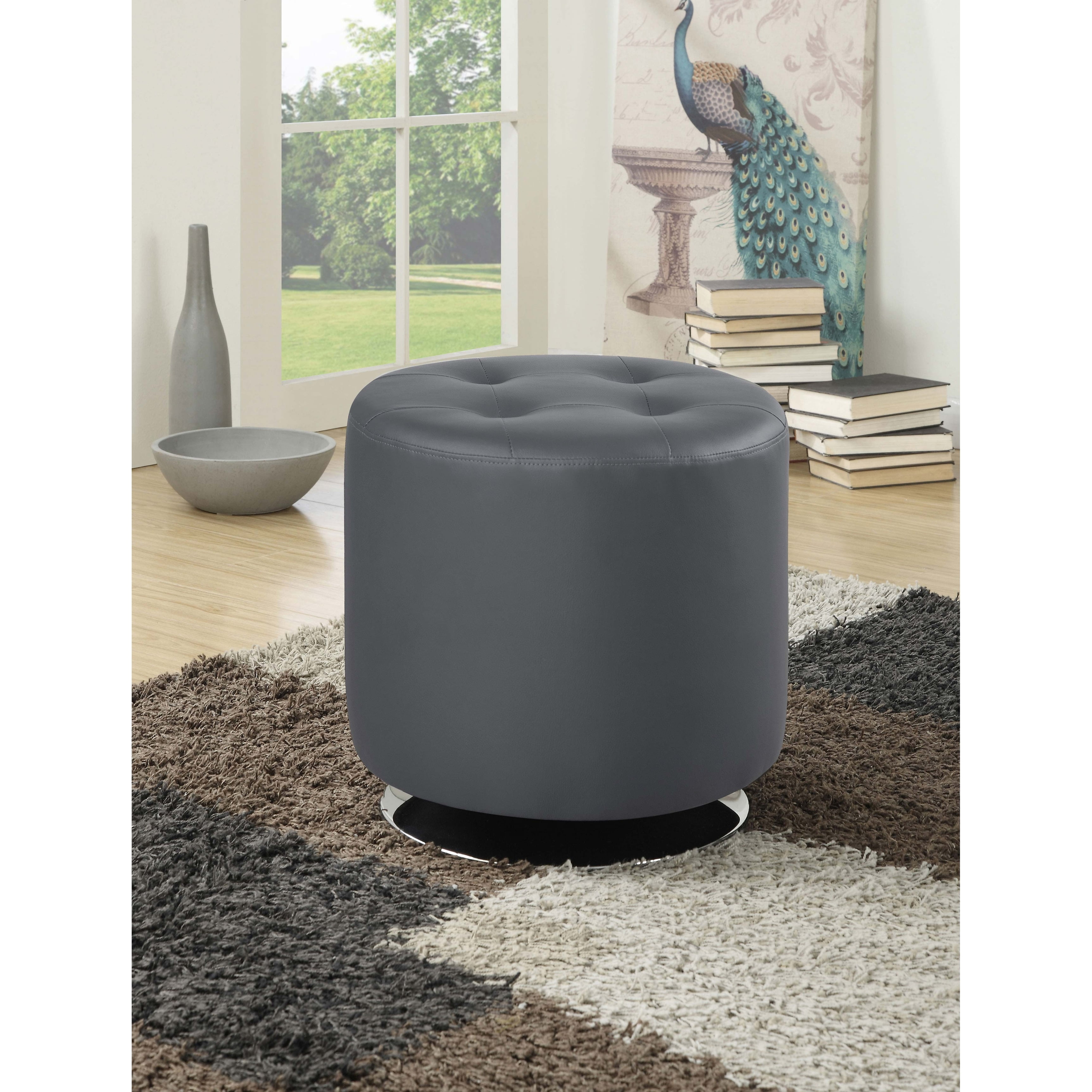Include: One (1) ottoman Upholstery: Gray Metal finish: Chrome Materials: Metal, Plywood, Faux Leather Material content: 15% polyurethane, 85% polyester Cleaning code: S Modern round ottoman makes a bold, striking statement Trendy tufted seat High-shine chrome base Convenient swivel mobility Type of swivel plate: 360 degree Seat construction: S – elastic band Shape: Round
