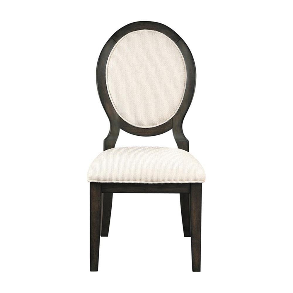 Elegant curves and contrasted finishes collide in this transitional side chair. A lovely addition to a dining space, this stunning chair can be slid up to a table for a comfortable place to sit over a long dinner, inviting you to lean back against its padded oval back and padded seats, each wrapped in a cream linen-like fabric with welt trim details. The timeless design of the Neoclassical oval backrest offers a wood trim that mirrors the rest of the wood frame. Encasing the padded elements is a rich, dark cocoa finish that lends a bold look. Square tapered legs in front and flared legs in back offer a subtle grace that completes this furniture piece. Features: Includes: Two (2) dining chairs Finish: Dark Cocoa Upholstery: Cream Materials: Asian Hardwood, Foam, Plywood, Fabric Material content: 100% polyester Cleaning code: W-S Casual dining can look elegant and still be functional for busy homes Neo classical oval back chairs Crafted from Asian hardwood and oak veneer Crafted from Asian hardwood and oak veneer Chairs have seat frame construction upholstered in a cream tone chenille fabric Leveler/ plastic glide: Plastic glide Seat construction: Seat frame Cushion seat base: Plywood (13mm) Specifications: Product Dimensions: 40.25″H x 20″W x 25.5″D Product Weight: 36.37 lbs Seat Dimensions: 19″H x 18″D Assembly Required: Yes Warranty: One (1) year limited manufacturer warranty