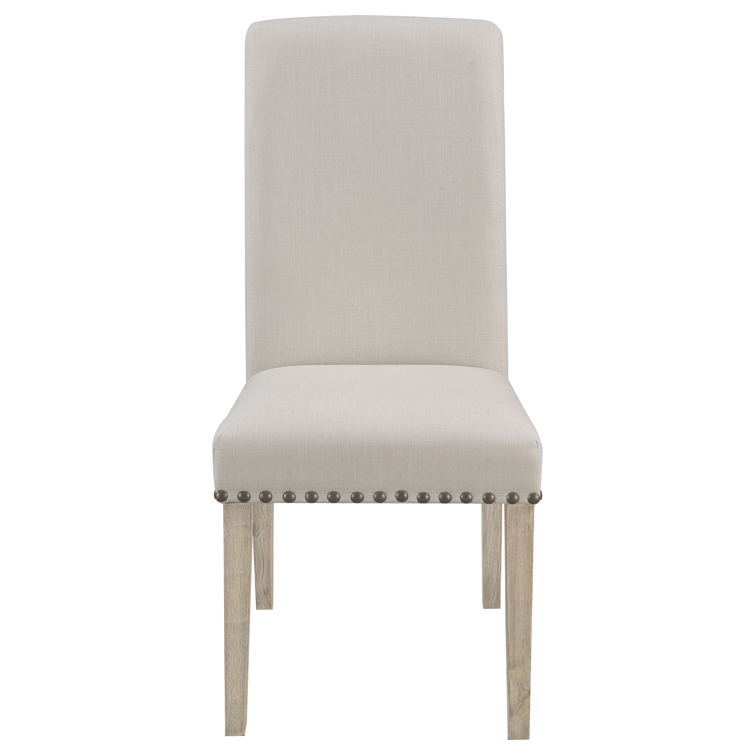 Includes: Two (2) dining chairs Finish: Rustic Smoke Upholstery: Beige Nailhead finish: Antique Brass Materials: Rubberwood, Linen-Like Fabric Material content: 100% polyester Cleaning code: W-S Nailhead type: Copper