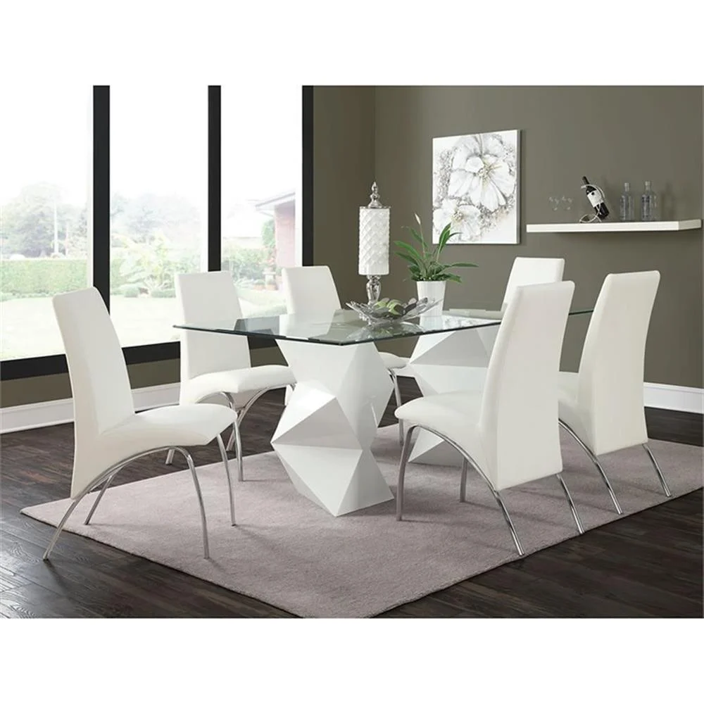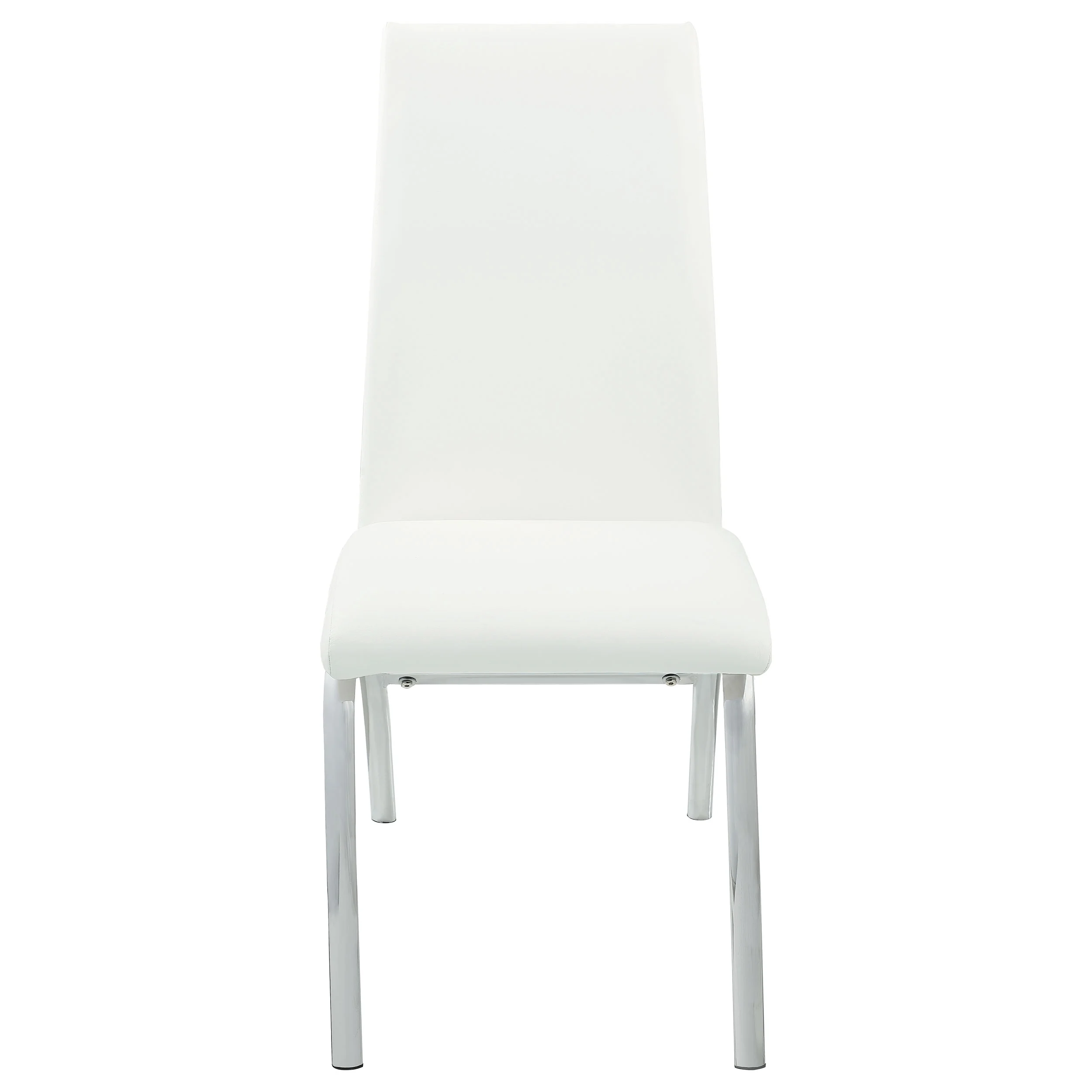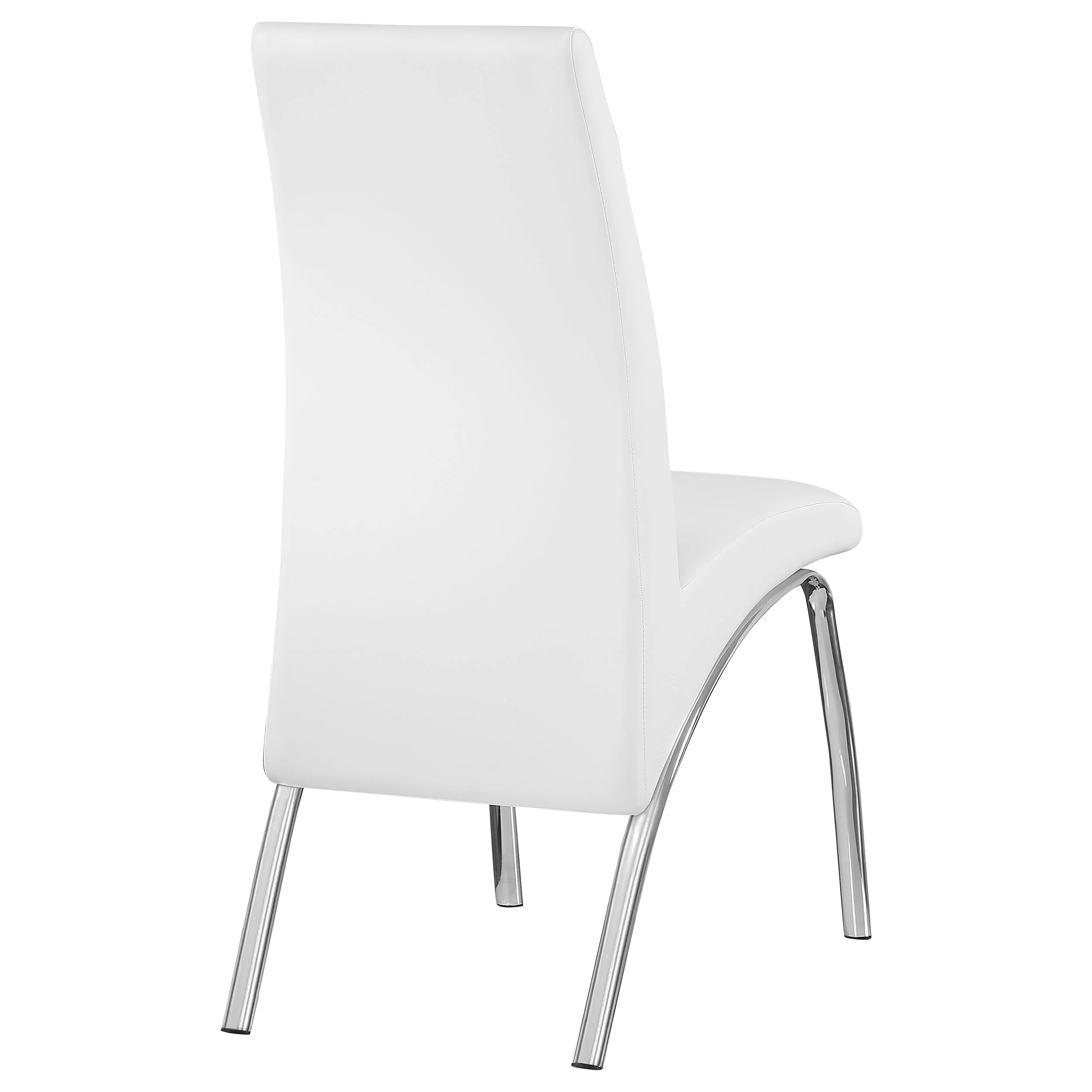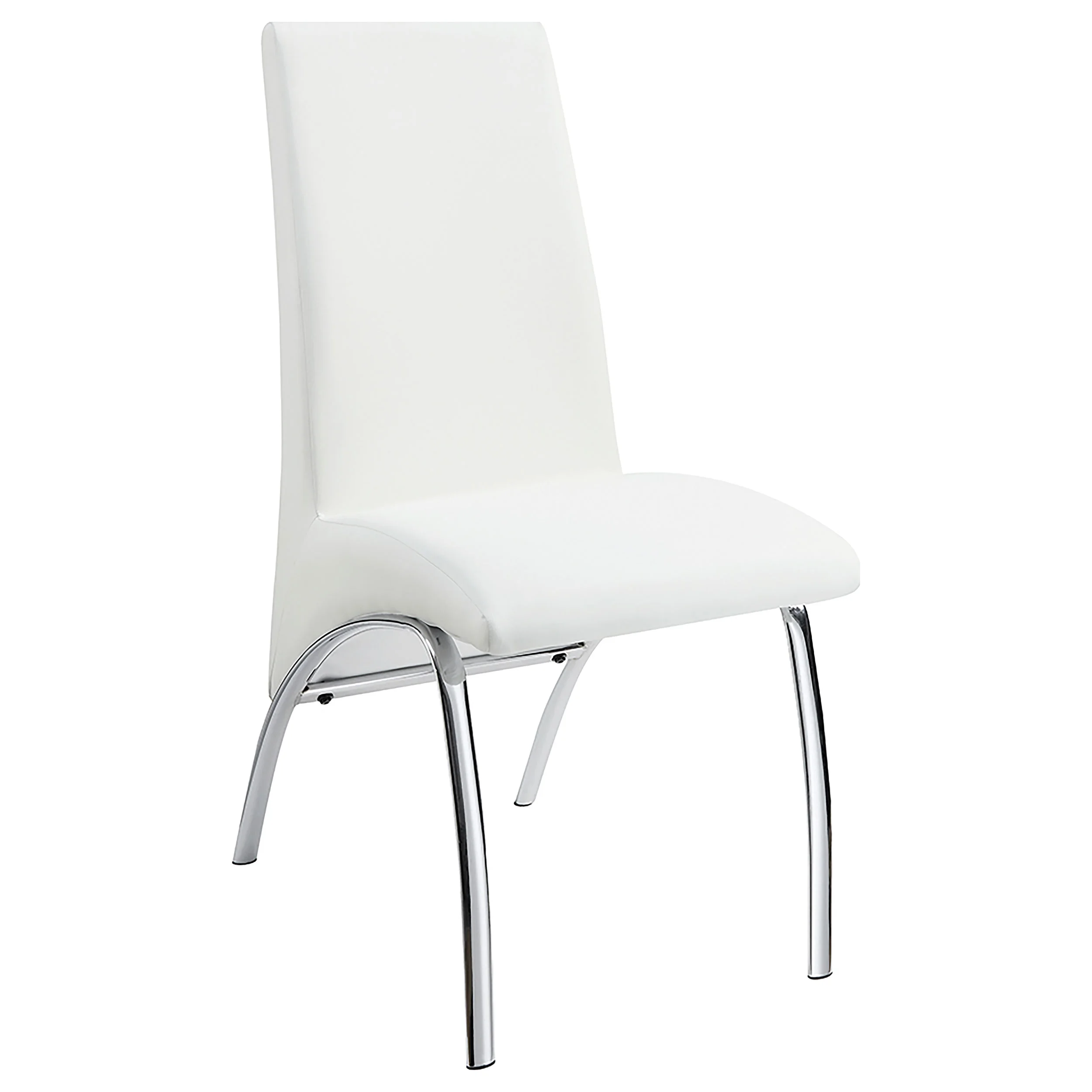 Includes: Two (2) dining chairs Metal finish: Chrome Upholstery: White Materials: Metal, Faux Leather Material content: 100% polyester Cleaning code: S Contemporary parson chairs in white faux leather feature dramatic curves and metal legs Leveler/ plastic glide: Plastic glide