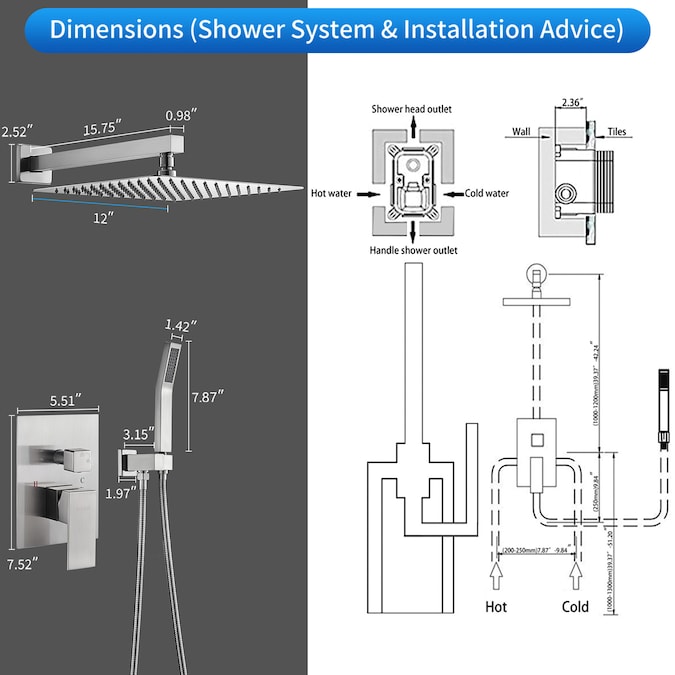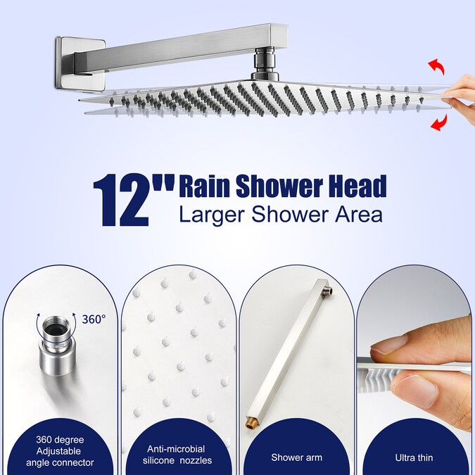 - Experience a luxurious rain shower with our innovative shower system featuring a 304 stainless steel 12-inch shower head and slim design for a sleek look.