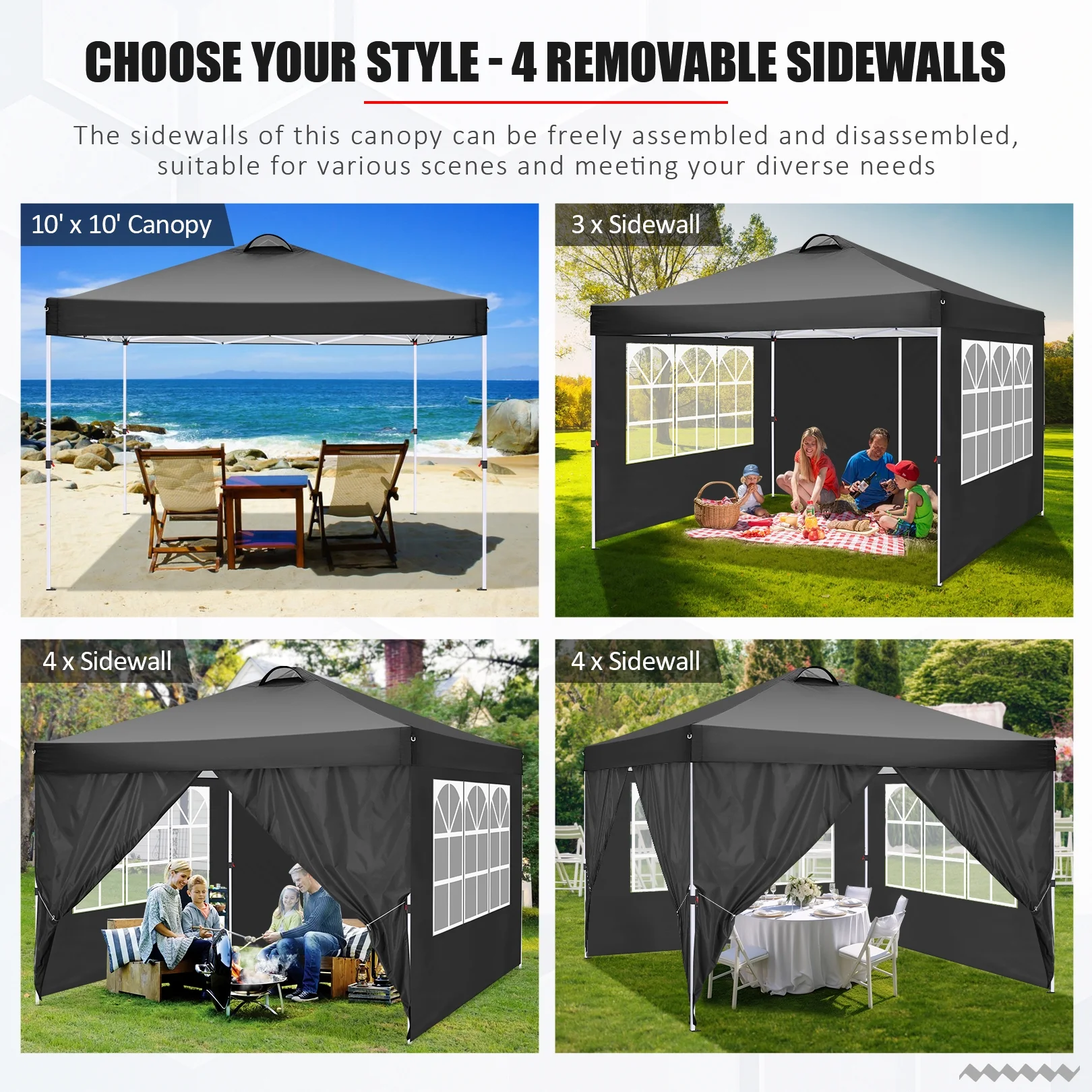 COBIZI 10×10 EZ Pop up Canopy Gazebo with Sidewalls,Pop up Canopy Tent Instant Shelter for Outdoor Party Camping Backyard Beach with Air Vent ,Carry Bag,Stakes,Ropes,Black Our COBIZI 10×10 EZ pop up canopy ,you can easy set up by 2 people. 4 sidewalls include 2 zippers and 2 windows,which makes you away from the rain,sun and wind.Multifunctional 10×10 canopy design allows you to use it for outdoor events anywhere,including party,camping,backyard,beach,family gathering and garden.
