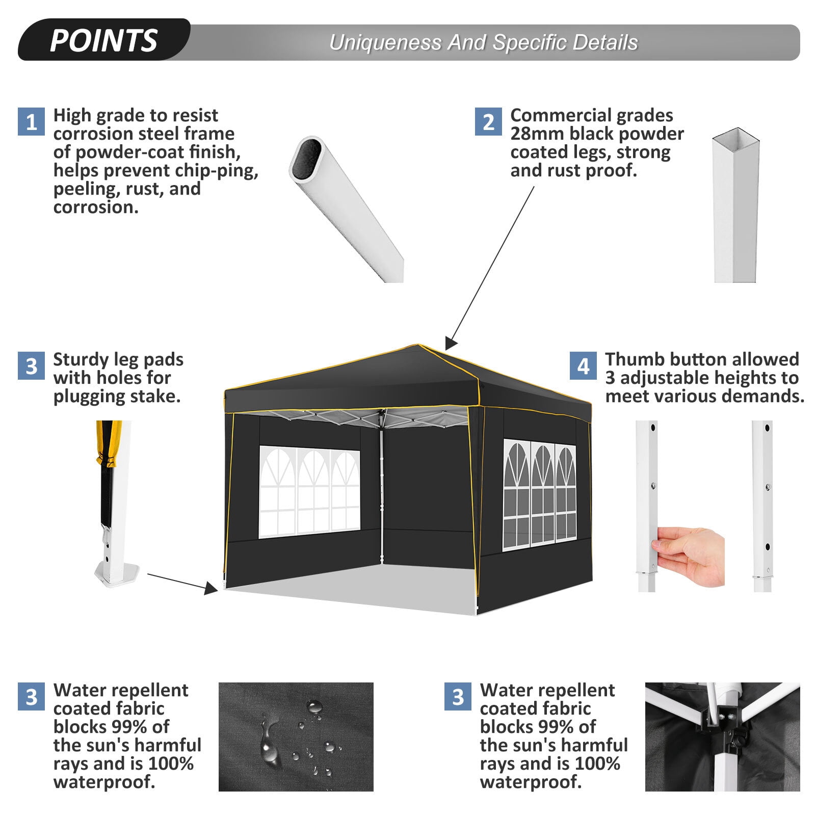 COBIZI is a leading manufacturer and exporter specializing in the design, development, and production of high quality outdoor canopy products. Our extensive range includes convenient pop up canopies, durable heavy duty canopy tents for outside, and versatile party tents, available in various sizes such as 6.6×6.6FT,10x10FT, 12X12FT, 10x15FT, 10x20FT, and 10x30FT. Each product is meticulously crafted and rigorously tested to ensure superior durability and top performance. With COBIZI, you can confidently enjoy your outdoor activities, knowing you have chosen the best in the industry. COBIZI Canopy Tent is the perfect solution for all your outdoor needs, whether for family gatherings, weddings, or events with friends. It is ideal for your patio, greenhouse, parties, flea markets, nurseries, plant displays, flower shows, camping trips, garden areas, pet shelters, storage solutions, barbecues, lawn and garden equipment, commercial fairs, picnics, social events, and various outdoor activities. Whether you need a 10×15 canopy with side walls for a weekend adventure, a 10×20 heavy duty tent for commercial purposes, or a versatile 10×12 pop up canopy gazebo with sidewalls for any outdoor occasion, the COBIZI Canopy Tent offers reliable protection and convenience. Crafted with high quality, durable materials, it ensures you stay comfortable and protected, no matter the weather. ????️ FAQ: Solve Your 10×10 Outdoor Canopy Problems ❓ 1. I’m concerned about complicated setups—can I really assemble this 10x10ft canopy quickly without tools? ???? Solution: Yes, you can! This 10x10ft pop up canopy is designed for easy assembly. With no tools required, just 1-2 people can set it up in a few minutes. The improved, thickened metal frame and thumb latch lock system ensure that once you attach the top cover and set the sidewalls, the canopy is securely in place. ???? Tech Highlights: ✅ Improved, thickened metal frame with legs reaching 25×25 mm with anti‑rust coating. ✅ Thumb latch lock system for fast, secure height adjustments. ✅ Quick assembly in minutes by 1-2 people. ❓ 2. Will the canopy effectively protect me from rain and harmful sunlight? ???? Solution: Absolutely. The outer fabric is made of waterproof, silver‑plated 210D Oxford cloth, which not only provides effective waterproofing but also blocks 99% of harmful UV rays (UPF 50+). This ensures that even during light rain and strong sun, you remain dry and well-protected. ???? Tech Highlights: ✅ Waterproof fabric that effectively repels water. ✅ UPF 50+ rating that blocks 99% of harmful UV rays. ❓ 3. Is the canopy’s height adjustable to suit different outdoor needs? ???? Solution: Yes. This 10x10ft canopy tent features three adjustable height settings (97.2″, 100.8″, and 104.4″) and removable sidewalls that allow you to customize your shelter. You can easily adjust the height for optimal headroom or stability while flexibly configuring the sidewalls to create either an open or enclosed space according to your needs. ???? Tech Highlights: ✅ Three adjustable heights: 97.2″, 100.8″, and 104.4″. ✅ Four detachable sidewalls, including 2 with zippers and 2 with windows, allow for excellent customization and personalization to meet both natural lighting and privacy needs. ❓ 4. Can I rely on this canopy for stability in windy conditions? ???? Solution: Yes, the canopy is built for stability. It comes with 4 sandbags, 4 pegs, and 4 ropes to secure the structure, ensuring enhanced stability even on windy days. This robust support system helps the canopy stay firmly in place during outdoor activities. ???? Tech Highlights: ✅ Comes with 4 sandbags, 4 pegs, and 4 ropes for enhanced stability. ✅ Sturdy frame design contributes to overall wind resistance. ❓ 5. Is the canopy portable and easy to transport for different outdoor events? ???? Solution: Definitely. The 10x10ft pop up canopy is designed for portability. It folds compactly and comes with a convenient carrying bag, making it easy to transport in most car trunks. This makes it ideal for various outdoor settings such as parties, camping trips, and trade fairs. ???? Tech Highlights: ✅ Compact foldable design for easy storage. ✅ Includes a carrying bag for effortless transport. ❓ 6. What does the package include, and how does it ensure a complete setup? ???? Solution: The package comes complete with a 10x10ft canopy foldable frame, waterproof outer fabric, 4 side panels (2 with zippers and 2 with windows), 4 sandbags, 4 pegs, 4 ropes, and a carrying bag. This full set of support parts ensures that you have everything you need for a secure, stable, and hassle‑free setup. ???? Tech Highlights: ✅ Complete accessory package for a reliable setup. ✅ 4 removable sidewalls offer flexible use for different scenarios. Key Features: ???? Sturdy Metal Frame & Upgraded Construction: Our 10x10ft pop up canopy features an improved, thickened metal frame with legs reaching a thickness of 25×25 mm and an anti‑rust coating, ensuring superior stability and long‑term durability. ⚡ Waterproof & UV Protection: The outer fabric is made of waterproof, silver‑plated 210D Oxford cloth that effectively repels water and blocks 99% of harmful UV rays (UPF 50+), keeping you protected from sun and rain. ???? Adjustable Heights: Enjoy three height settings – 97.2″, 100.8″, and 104.4″ – allowing you to tailor the canopy for various outdoor activities. ???? Removable Sidewalls for Versatility: Comes with 4 side panels (2 with zippers and 2 with windows) that can be removed or repositioned to suit different usage scenarios. ???? Easy Assembly & Portability: No tools are required – 1-2 people can assemble the canopy in minutes. The design allows for compact folding, and it comes with a carrying bag for effortless transport. Specifications: Installation Size: 10×10 ft Adjustable Heights: 97.2″, 100.8″, 104.4″ Top Fabric: Waterproof, silver‑plated 