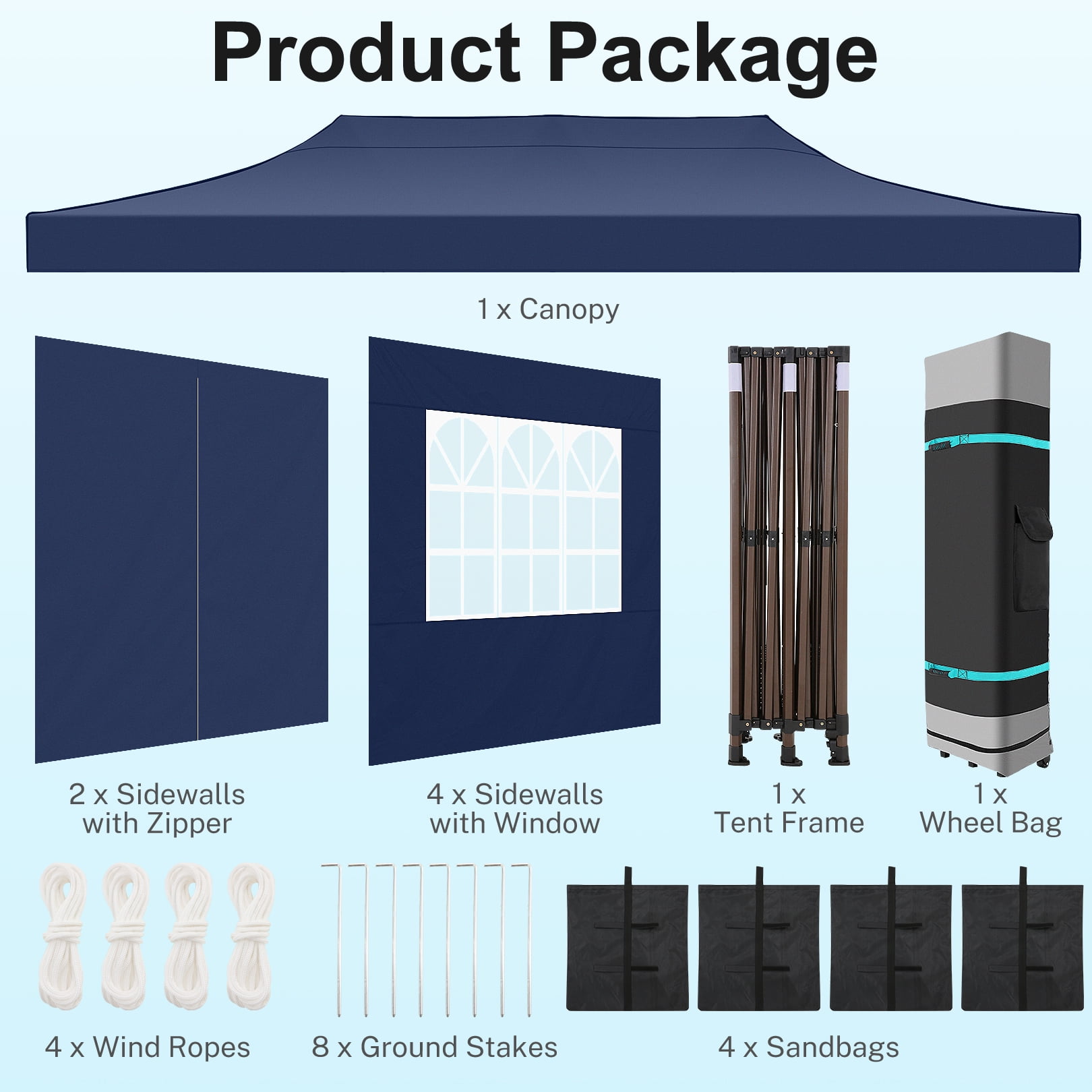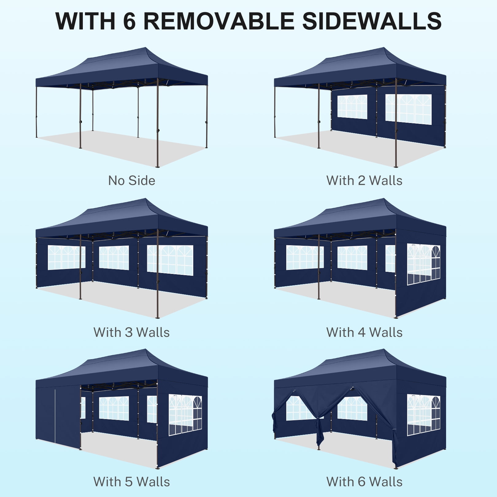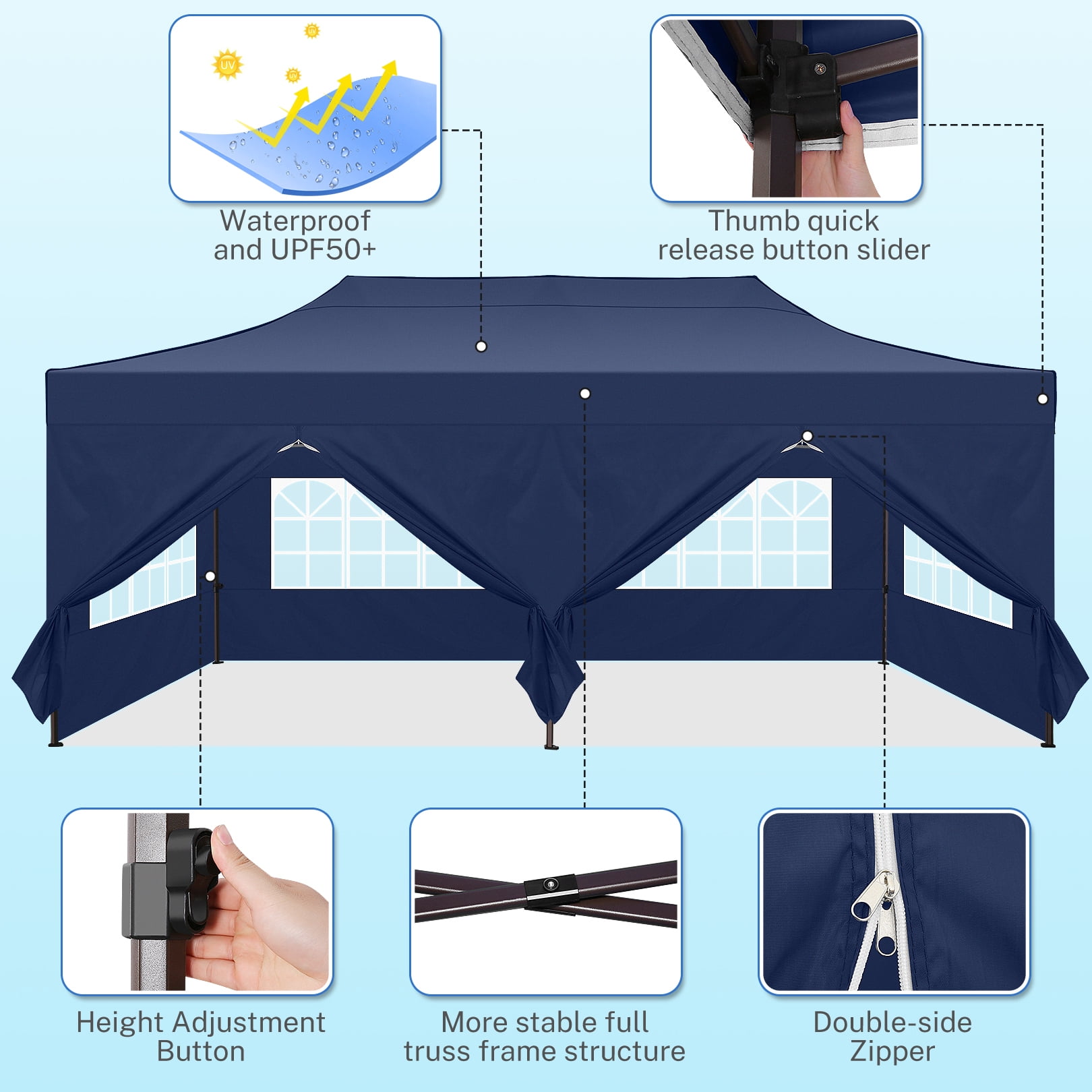 【Upgrade Heavy Duty Canopy】 The COBIZI 10×20 Heavy Duty Canopy features a commercial-grade full truss structure constructed from durable powder-coated stainless steel. The thickness of the 1.77 inch (45mm) hexagonal legs has been increased to 0.7mm/0.03 inches, providing superior stability and durability. 【Premium Quality Fabric】 10 x 20 pop up canopy tent is made of 260g waterproof oxford fabric. The top fabric is coated with two layers of PVC with heat-sealed seams waterproof strip technology, 100% waterproof and blocks 99% UV rays. 【Easy to Set Up, Large Space】10 x 20 Party Tent with sidewall provides a 200 sq. ft. of shade area, large enough to accommodate 15-20 people. 2-3 people can set it up in minutes without carrying any tools. Height is adjustable to 118 inches, 122 inches or 126 inches. The waterproof canopy can be used in commercial areas, playgrounds, courtyards, beaches, farms, gyms,parties, weddings, barbecues, trade shows, sports events, disaster relief, or any outdoor activities. 【Portable Wheeled Bag, Versatile Applications】We provide a solid and tear-resistant 600D Oxford fabric wheeled bag capable of carrying the 10×20 heavy duty Canopy, weighing up to 100 pounds. It features three large standing wheels and reinforced handles for easy mobility and transportation. 【Included Accessories, Warranty Service】 1x Commercial Grade 10×20 Pop Up Tent Frame, 1x Top Cover, 6x PU Coated Panels (4 x Sidewalls with Windows and 2x Sidewalls with Zippers), 4x 420D Oxford Fabric PVC Coated Sandbags, 8 x Ground Pegs, 4x Windproof Ropes, 1x Rolling Bags, 1x Manual. We provide 1 year warranty service.