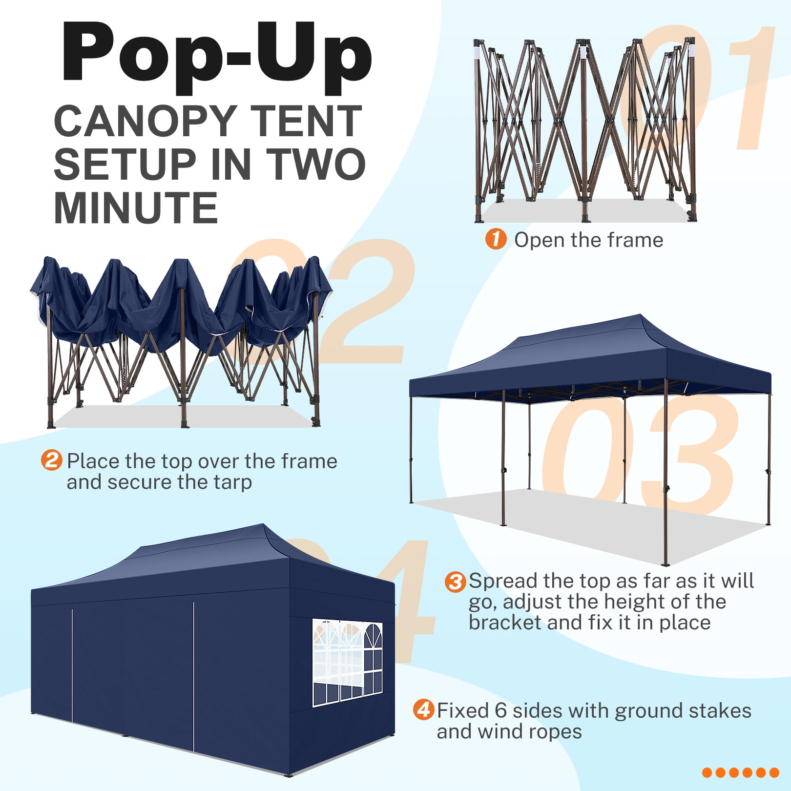 Specifications: Material: 420D Oxford PVC of Top Cover; Oxford Cloth of Wheeled Carrying Bag. Steel Pipe: 1.6” hexagonal legs tube Canopy Size: 10 x 20 ft. Top Height: 118”/122″/126″, Three Height Settings Side Height: 82.6″ 86.6″ 90.5″,Three Height Settings Product Size: 240″L x 120″W x 122″H. Product Weight: 115 lbs Package size: 65.75”x16.7”x12.6” Package Content: 1 x Canopy Tent Top Cover 6 x Side Wall 1 x Foldable Steel frame 1 x Top plastic parts 1 x Foot tube plastic parts 8 x Ground Nail Stakes 4 x Ropes 1 x Wheeled Carrying Bag 1 x User Manual(If you have any questions or problems, please contact us by email, and we will reply as soon as possible and find a solution.) Note: Store the canopy tent in a dry place. Do not use this party tent in heavy stormy weather, to extend its service life