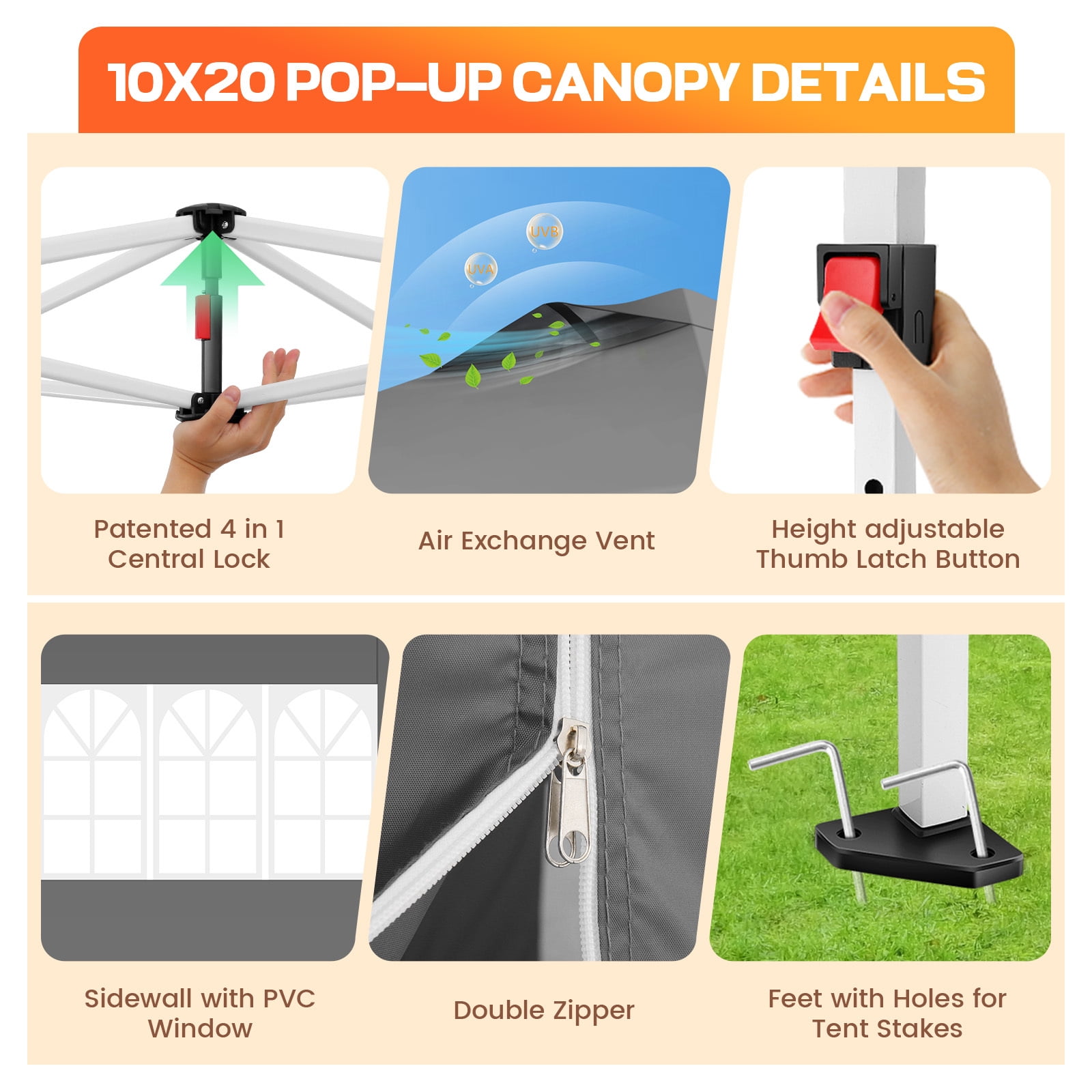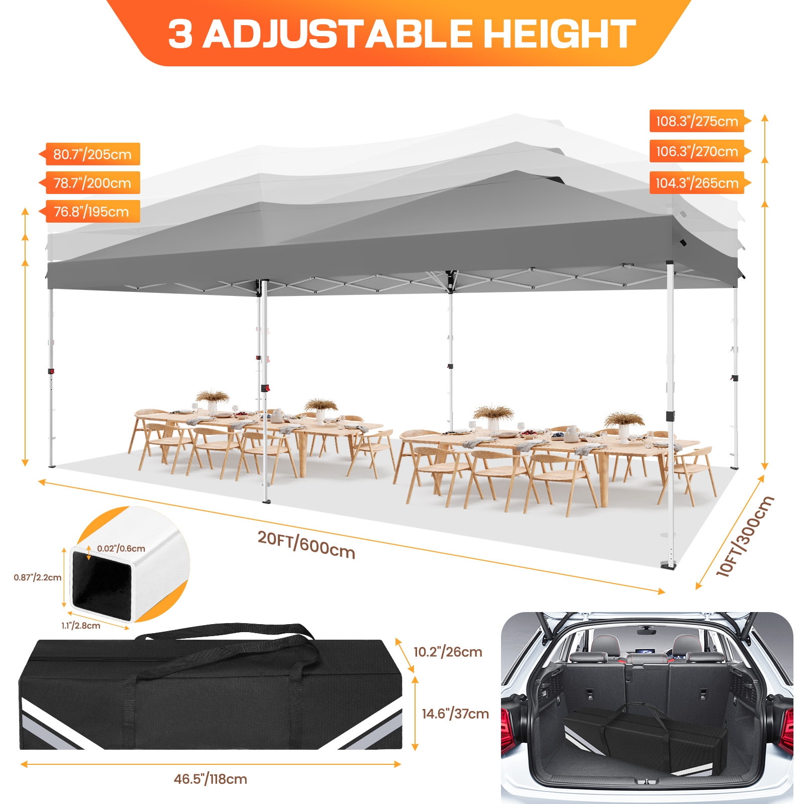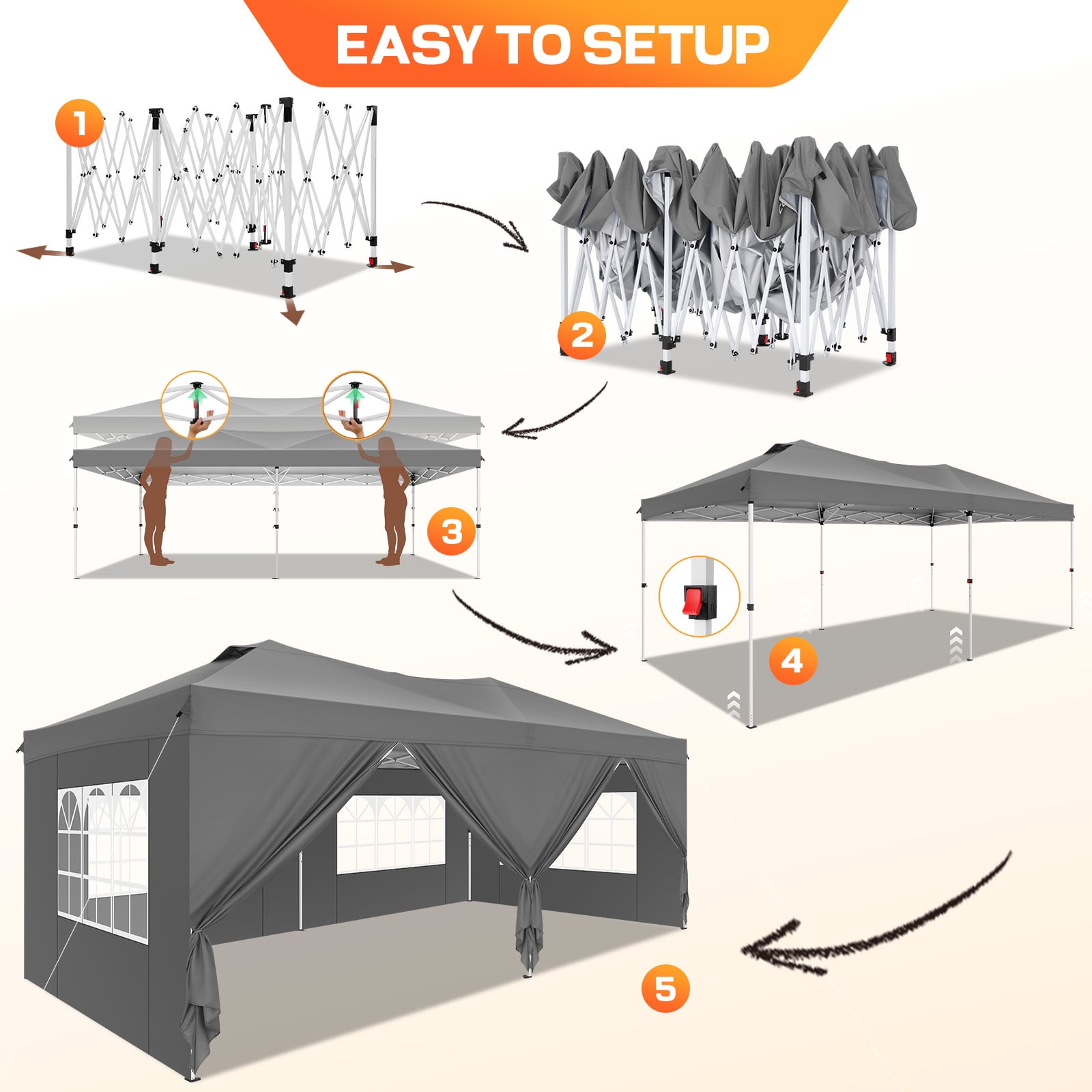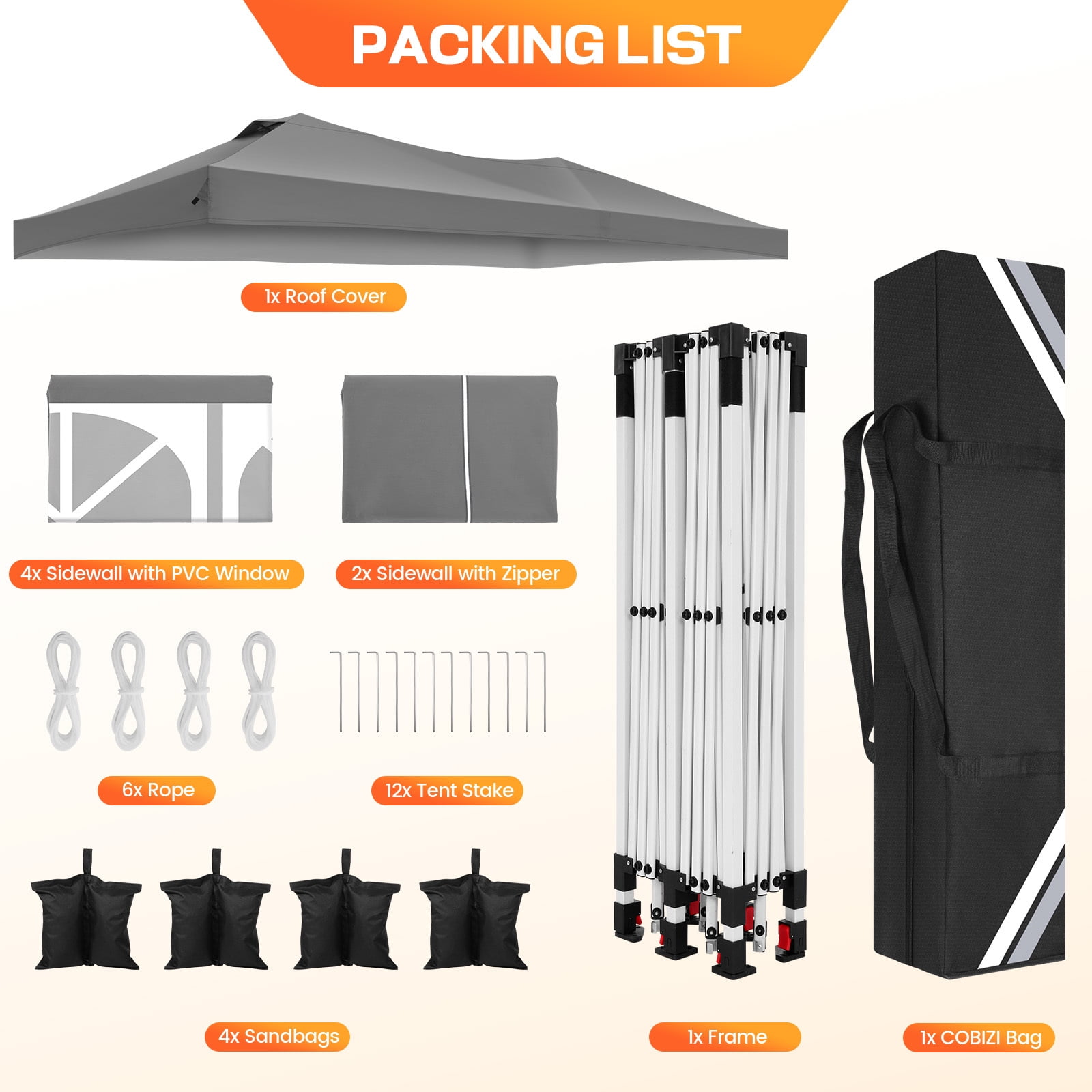 COBIZI is a leading manufacturer and exporter specializing in the design, development, and production of high-quality outdoor canopy products. Our extensive range includes convenient pop-up canopies, durable heavy-duty canopy tents for outside, and versatile party tents, available in various sizes such as 10x10FT, 12X12FT, 10x15FT, 10x20FT, and 10x30FT. Each product is meticulously crafted and rigorously tested to ensure superior durability and top performance. With COBIZI, you can confidently enjoy your outdoor activities, knowing you have chosen the best in the industry. COBIZI Canopy Tent is the perfect solution for all your outdoor needs, whether for family gatherings, weddings, or events with friends. It is ideal for your patio, greenhouse, parties, flea markets, nurseries, plant displays, flower shows, camping trips, garden areas, pet shelters, storage solutions, barbecues, lawn and garden equipment, commercial fairs, picnics, social events, and various outdoor activities. Whether you need a 10×15 canopy with side walls for a weekend adventure, a heavy-duty tent for commercial purposes, or a versatile pop-up canopy with sidewalls for any outdoor occasion, the COBIZI Canopy Tent offers reliable protection and convenience. Crafted with high-quality, durable materials, it ensures you stay comfortable and protected, no matter the weather. ????️ FAQ: Solve Your Outdoor Canopy Problems Once and for All! ❓ 1. Is it difficult to set up? Do I need a team to assemble it? ???? Solution: Not at all! The 10×20 ft pop-up canopy with sidewalls is designed for an easy 3-minute setup with just two people—no tools required. Thanks to the innovative quick thumb-lock system and a pre-assembled one-piece frame, setting it up is as simple as unfolding, extending, and securing the frame. Additionally, the four-corner push-pull mechanism ensures an effortless opening process. Imagine arriving at an outdoor event while others struggle with poles; you can have your canopy ready and enjoy the shade immediately. ???? Tech Highlights: ✅ One-piece foldable steel frame—no complicated assembly. ✅ Four-corner push-pull opening for fast setup and takedown. ✅ Thumb-lock system for quick height adjustments (118″, 122″, 126″). ✅ Diagonal folding design for compact storage and easy transport. ❓ 2. Will it protect me from the sun? Will I still feel hot underneath? ???? Solution: Absolutely! The 210D silver-coated Oxford fabric blocks 98% of harmful UV rays and offers UPF 50+ protection. It reduces heat buildup, keeping the shaded area 10-15°F cooler than direct sunlight—so you remain comfortable even on a scorching 90°F day. The fabric’s color fastness rating of 4-5 ensures that the shade remains vibrant, no matter how long you use it. Imagine enjoying a beach day or an outdoor wedding, all while staying cool and protected. ???? Tech Highlights: ✅ 210D silver-coated Oxford fabric with UPF 50+ for maximum sun protection. ✅ Color fastness rating of 4-5 ensures long-lasting vibrant colors. ✅ Silver-coated fabric reduces heat accumulation by up to 15°F, keeping you cooler in direct sunlight. ❓ 3. What happens if it rains? Will the canopy leak? ???? Solution: No worries! The waterproof 210D Oxford fabric, combined with heat-sealed seams and double-stitched waterproof strips, guarantees 2000mm waterproof protection. The angled top design ensures efficient drainage, so you stay completely dry even during unexpected rain showers. The block-style Velcro connections at the top and around the walls also ensure a tight, secure fit to prevent leaks. ???? Tech Highlights: ✅ 100% waterproof Oxford fabric with 2000mm protection. ✅ Heat-sealed seams and double-stitched waterproof strips prevent leaks. ✅ Circumferential block-style Velcro connections ensure a secure fit for top and sidewalls. ❓ 4. How does the canopy hold up against the wind? ???? Solution: Our canopy is engineered for stability. The reinforced full-truss steel frame and 30x25mm thickened legs ensure it remains secure in winds up to 25-30 mph. Enhanced by 4 sandbags, 4 ropes, and 12 stakes, this canopy provides reliable shelter even on breezy days. The double-layered corner reinforcements also prevent wear and tear on the canopy, ensuring long-lasting durability. ???? Tech Highlights: ✅ Reinforced full-truss steel frame prevents bending or wobbling. ✅ Wind-resistant design holds up in 25-30 mph winds. ✅ Double-layered corner reinforcements protect against wear and tear. ✅ Includes sandbags, ropes, and stakes for maximum stability. ❓ 5. Is it heavy and hard to transport? Will it fit in my car? ???? Solution: Not at all! The compact foldable design fits into a 46.5″ x 7.9″ x 7.9″ wheeled storage bag made from 600D Oxford fabric, complete with two large detachable wheels and side handles for easy lifting. This ensures effortless transport and storage, so you can take it wherever you need. The heavy-duty bag is built to handle the weight while providing ease of movement. ???? Tech Highlights: ✅ 600D Oxford wheeled storage bag with 2 detachable wheels for effortless transport. ✅ Compact design fits in most car trunks for easy storage and transport. ❓ 6. How customizable is the canopy, and what about customer service? ???? Solution: The COBIZI canopy comes with 6 removable sidewalls—4 transparent church-style windows and 2 zipper doors—allowing you to tailor your shelter for privacy and ventilation. Additionally, we offer superior customer service with a 24-hour response guarantee and comprehensive warranty support, ensuring your satisfaction. ???? Tech Highlights: ✅ 6 removable sidewalls (4 with transparent windows, 2 with zipper doors) for customizable use. ✅ Warranty and 24-hour customer support for peace of mind. Key Features: ???? Heavy Duty Frame & Upgraded Durable Fabric: The 10×20 Pop-Up Canopy is built with a full-truss structure and a reinforced powder-coated steel frame, featuring 30x30m
