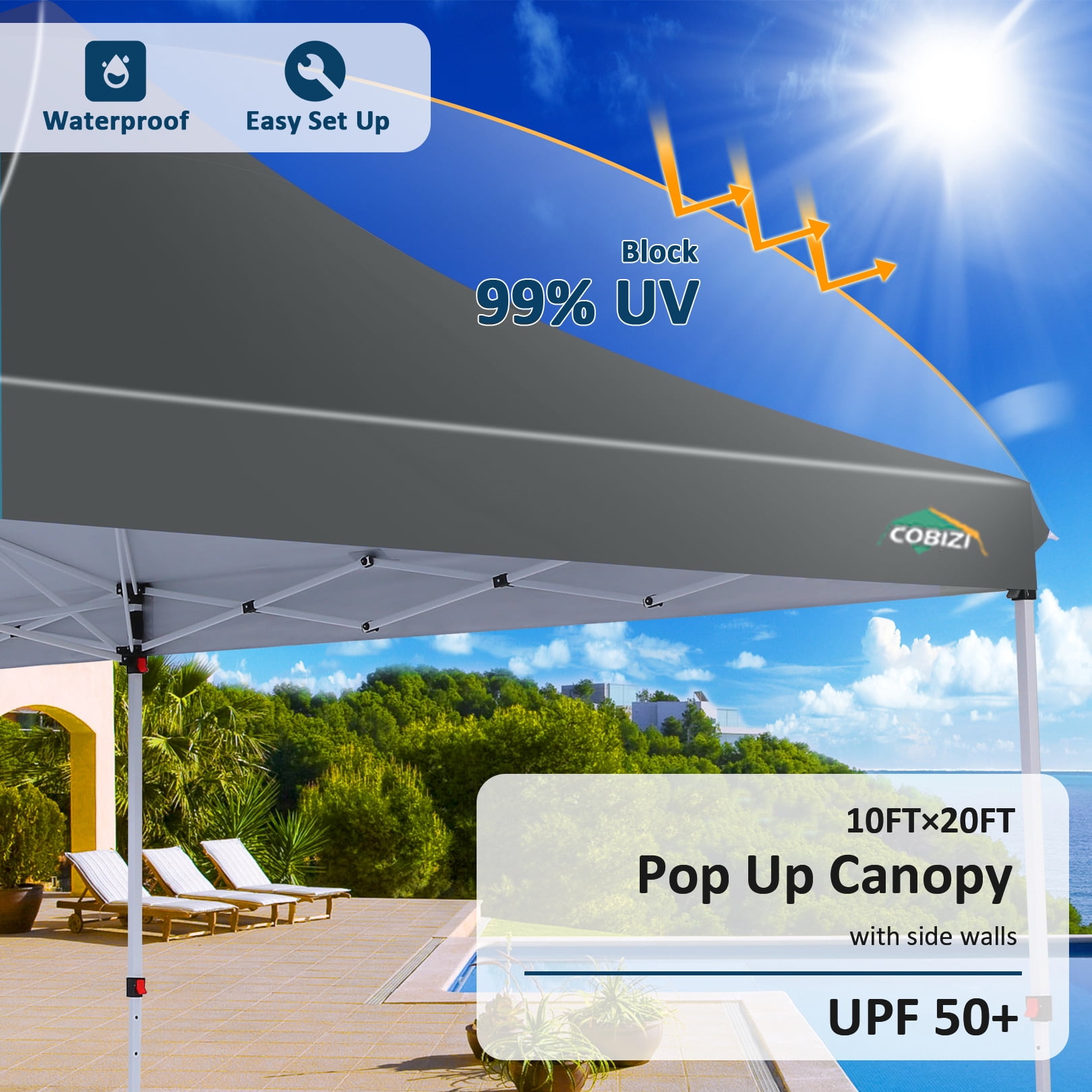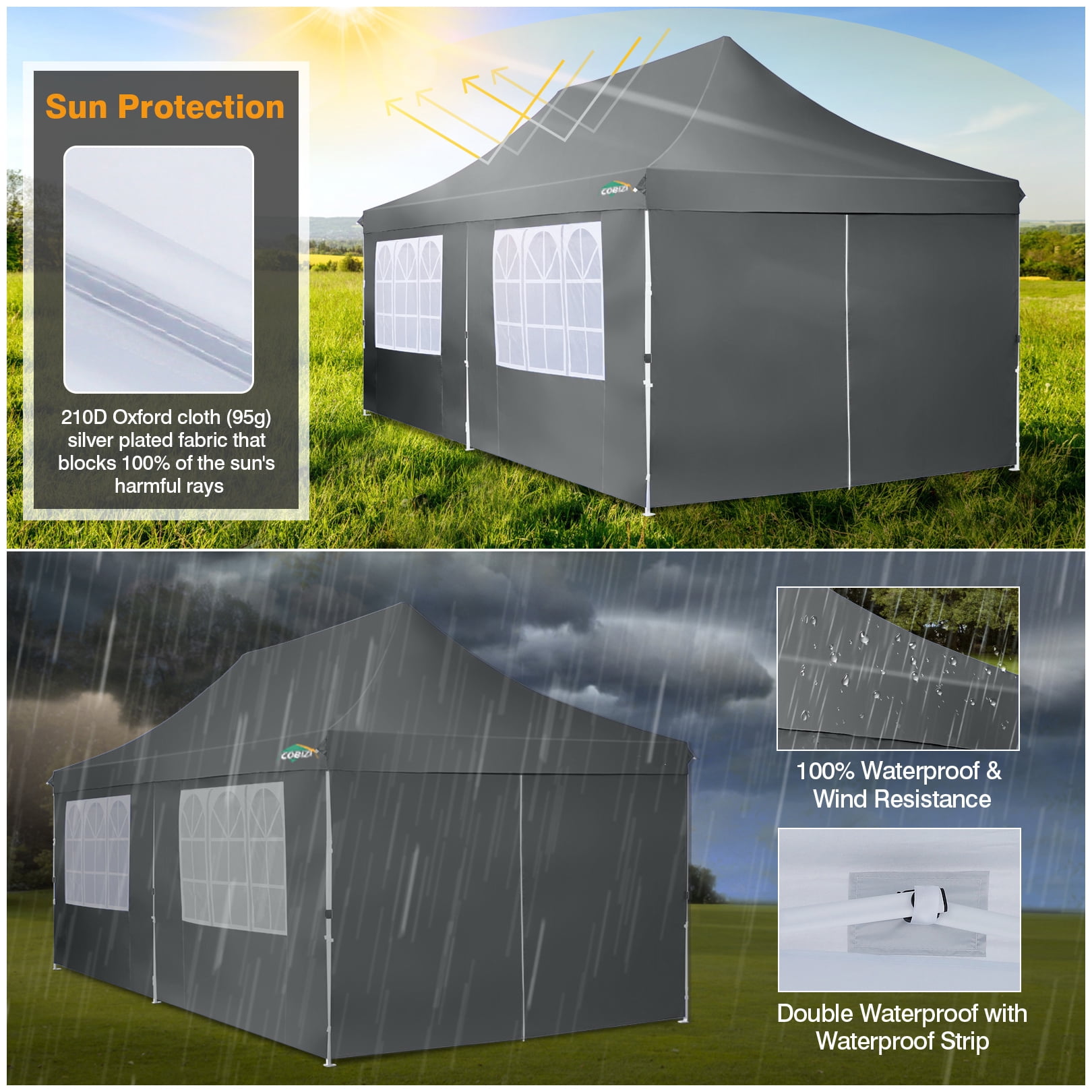 COBIZI is a leading manufacturer and exporter specializing in the design, development, and production of high-quality outdoor canopy products. Our extensive range includes convenient pop-up canopies, durable heavy-duty canopies, and versatile party tents, available in various sizes such as 10x10FT, 10x15FT, 10x20FT, and 10x30FT. Each product is meticulously crafted and rigorously tested to ensure durability and top performance. Whether you’re seeking a heavy-duty commercial canopy tent or a portable pop-up canopy for a weekend getaway, COBIZI ensures premium quality and unmatched performance. FAQ | Why Choose Our 10×20 ft Pop up Canopy Tent? ❓ 1. Is the traditional tent too complicated to set up and easy to get your hands caught? Does it always take multiple people and a lot of time? ✅ Solution: With our one-step Cobizi pop up canopy design, you can set it up with just 2 people in under 3 minutes—no tools or complicated steps. Imagine you’re at a family BBQ, the sun is setting, and within minutes, you have a sturdy, shady spot to relax. This is the kind of easy up canopy experience that sets our product apart. ???? Tech Highlights: Integrated Steel Frame: No assembly required, just unfold and lock it in place. Pinch-Proof Thumb-Lock Height Adjustment for Effortless Safety: Choose between 3 height options (9.84 ft, 10.17 ft, 10.5 ft), perfect for different events and space requirements. Folded Size: 46.46″ x 13.78″ x 9.06″—fits easily into most car trunks for effortless transport, making it one of the best portable canopies available. ❓ 2. Are normal tents not enough to block UV rays? The sun’s harsh and leaves me burned? ✅ Solution: Our 210D silver-coated Oxford fabric with UPF 50+ protection blocks out 99% of harmful UV rays, ensuring you stay cool even under the hottest sun. Whether you need a canopy for beach outings or an outdoor shelter for a wedding, our product delivers effective sun protection. ???? Tech Highlights: 210D Silver-Coated Oxford Fabric: Reflects heat and lowers the temperature underneath, keeping you cool and comfortable. Large Coverage Area (200 sq. ft.): Enjoy uninterrupted shade, no matter the sun’s position. Removable Sidewalls: Customize airflow and protection—making it a versatile canopy with sidewalls. ❓ 3. What if it rains? Will a regular canopy just let the rain in? ✅ Solution: Our canopy isn’t just for sunny days—it’s completely waterproof! The taped seams and waterproof strips keep rain out, so you can continue your event even when the weather turns. Cobizi can also provide a variety of outdoor shelters, from small gazebo to larger tents. ???? Tech Highlights: Waterproof 210D Oxford Fabric: Keeps you dry by preventing water seepage. Sloped Design: Ensures efficient water runoff, preventing pooling and sagging. Full Enclosure Option: With removable sidewalls, you can easily close it off to block wind and rain completely. ❓ 4. Does the tent fall over in strong winds? Is stability a concern with most tents? ✅ Solution: We designed our canopy with stability in mind. With thickened 28x28mm metal legs and an enhanced frame, our canopy stands strong against wind gusts of up to 35 mph. Whether you’re setting up for an outdoor event or a beach party, you can rely on Cobizi for a sturdy and stable shelter. ???? Tech Highlights: 28x28mm Reinforced Metal Legs: Far sturdier than traditional models, offering superior wind resistance. Cross-Frame Truss System: Provides extra support to prevent warping or collapse. Complete Anchor Kit: Comes with 4 sandbags, 12 stakes, and 6 ropes, ensuring the canopy stays put even in stormy weather. ❓ 5. Is it hard to carry? Doesn’t work for all scenarios? ✅ Solution: Our portable pop up canopy is designed for both portability and versatility. Whether it’s a family gathering in your backyard or a vendor booth at a market, it’s easy to transport and set up for a variety of events. Cobizi also offers other canopy sizes, such as the 10×10 canopy, the 10×30 pop up canopy, and a folding pop up canopy. ???? Portable Design: Folded Size: Only 46.46″ x 13.78″ x 9.06”, making it easy to store in most car trunks. Storage Bag: Provides effortless transport without heavy lifting. ???? Versatile Use Cases: Family Gatherings & Backyard Activities: Ideal for BBQs, birthday parties, and other intimate events. Outdoor Travel & Camping: Perfect for beach trips and forest camping, delivering an excellent camping canopy experience. Commercial Events & Booths: Functions as a professional event tent and outdoor shelter at markets or fairs. Weddings & Celebrations: Provides a lovely setting for weddings, festivals, and other special events. Emergency Shelters & Relief Stations: Quickly set up a temporary canopy, providing cover for first-aid stations or emergency relief needs. Key Features: ???? Heavy Duty Frame & Upgraded Durable Fabric: The 10×20 Pop-Up Canopy is built with a full-truss structure and a reinforced aluminum frame, featuring 28x28mm metal legs that provide superior stability. Constructed from 210D silver-coated Oxford fabric, it offers excellent UV protection (UPF 50+) and waterproofing—making it an ideal outdoor tent for various applications. ⚡ Easy to Set Up & Take Down: With its innovative pop-up design, this easy up canopy can be assembled in minutes by 1-2 people. No tools required—just unfold and lock. The included accessories (4 sandbags, 6 ropes, and 12 stakes) ensure a secure setup even in windy conditions. ???? Adjustable Heights: Choose from 3 height settings (118.08 in, 122.04 in, 126 in) to accommodate different environments. The thumb-lock system makes it easy to adjust, making it a perfect adjustable height tent for everything from family gatherings to commercial events. ???? Customizable Sidewalls: The tent includes 6 removable sidewalls, with 4 featuring transparent PE church windows for natural light and 2 with zippers for easy access. Set it up as an open 