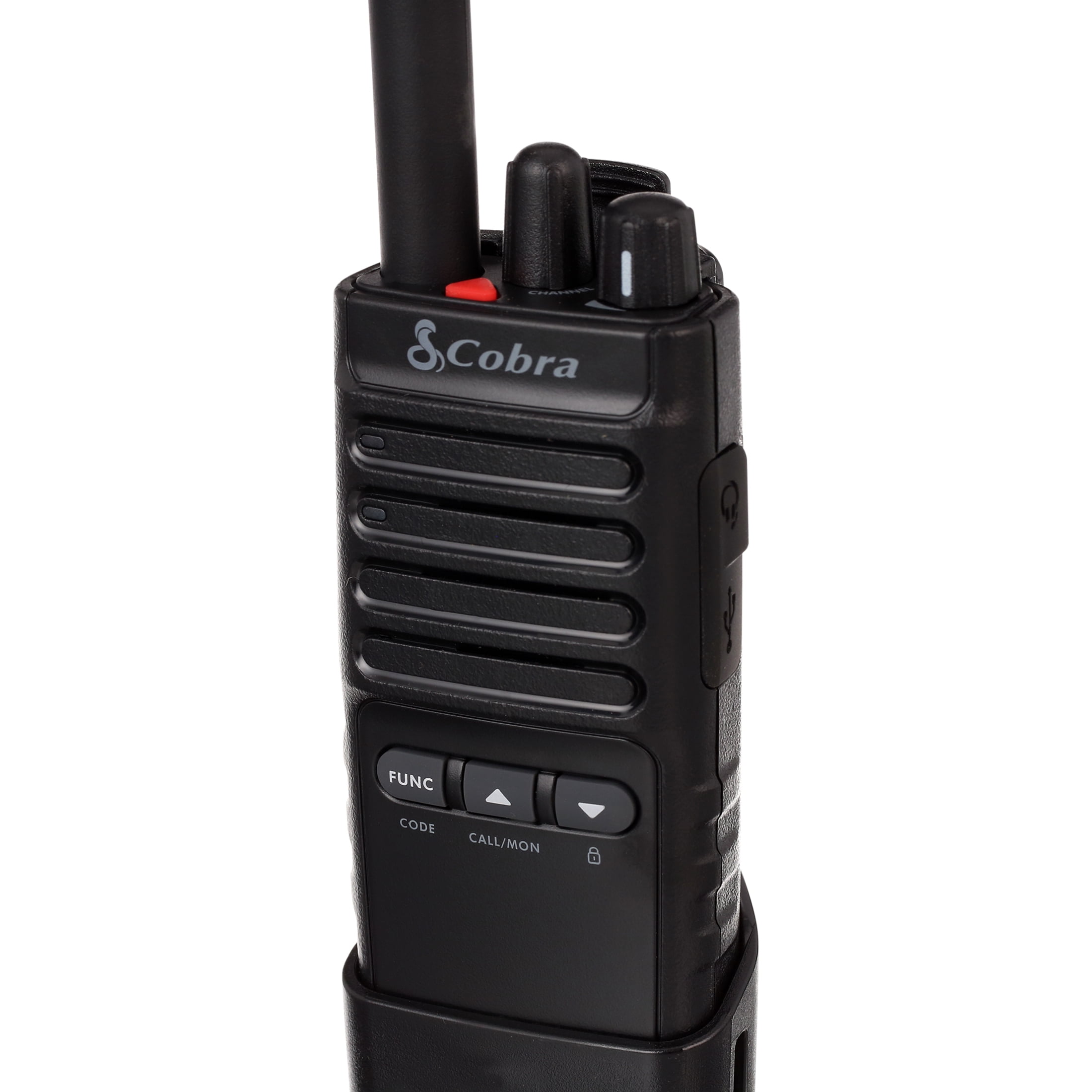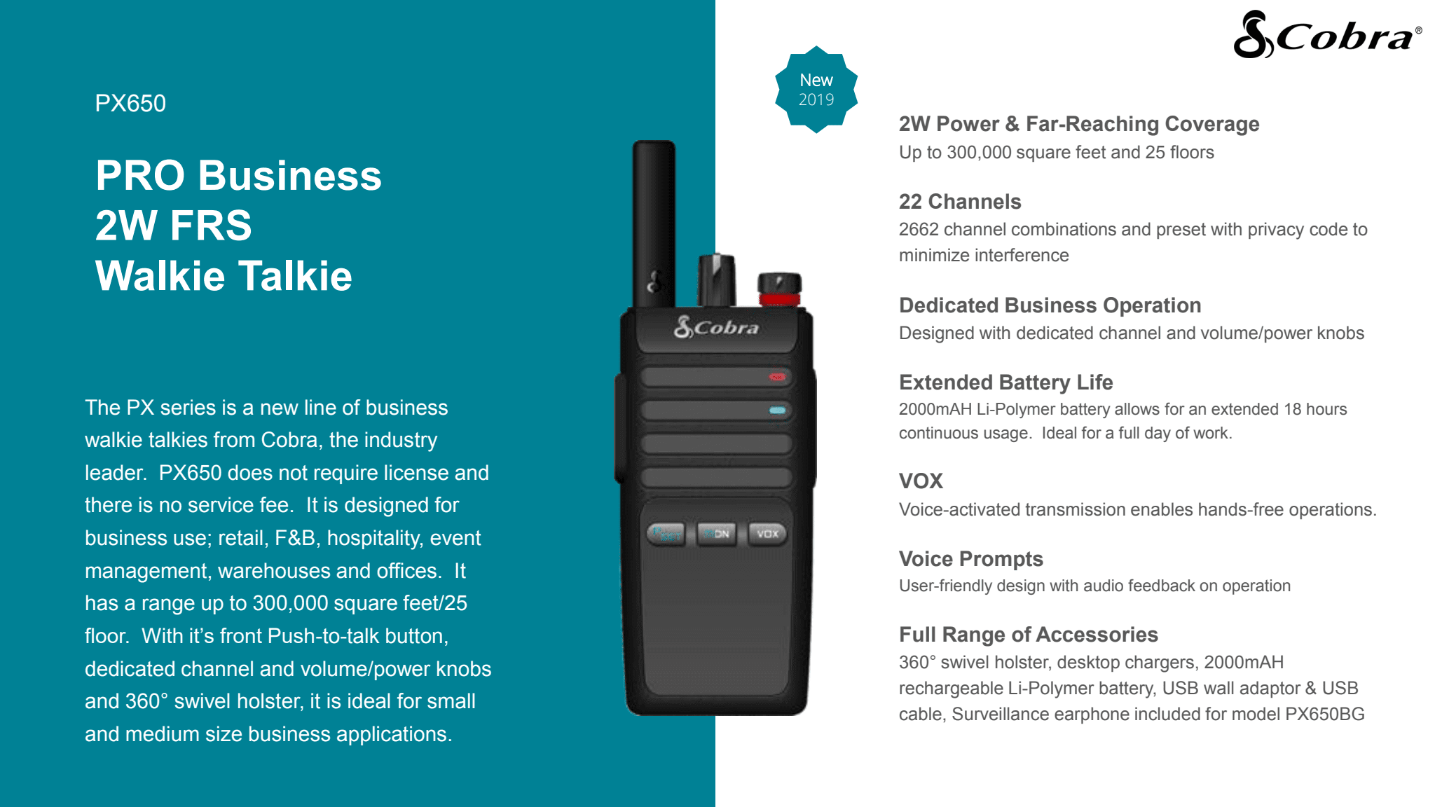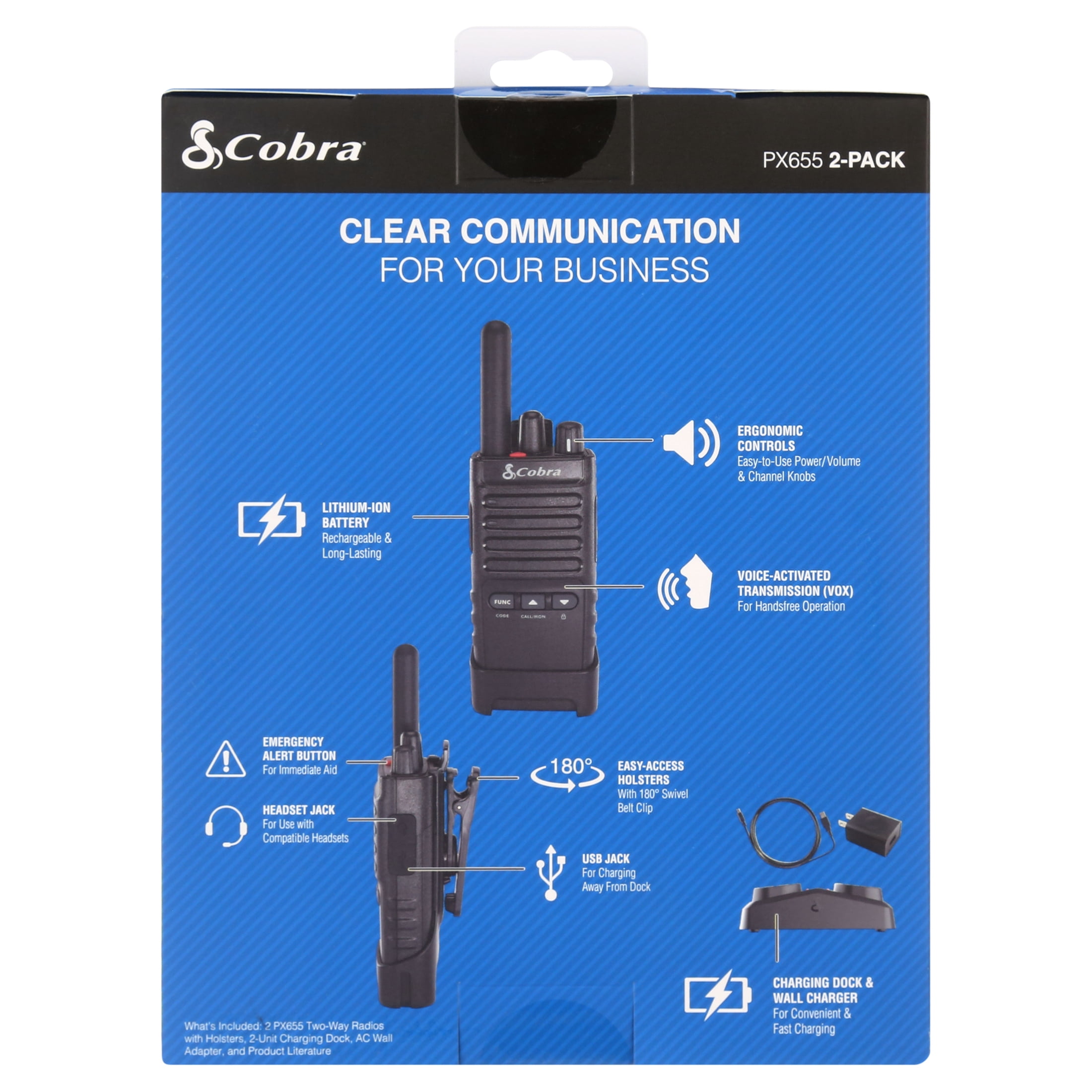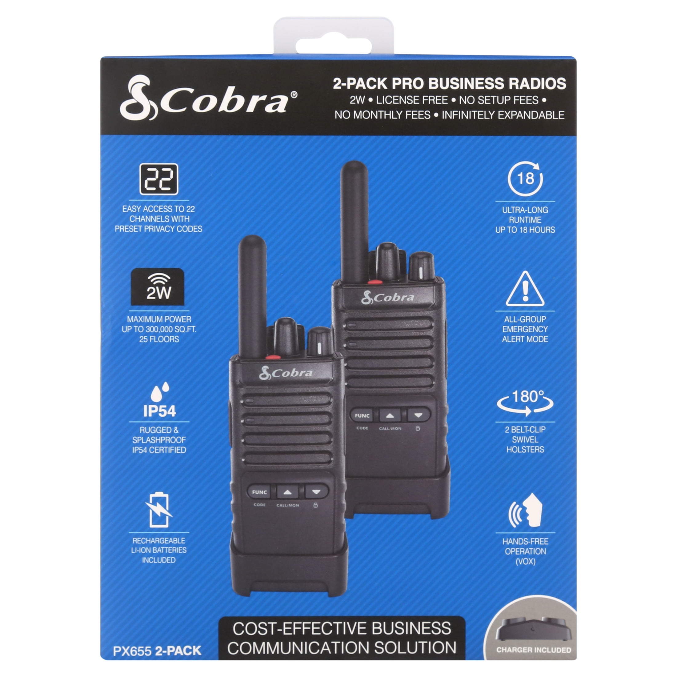 Cobra PX655 PRO Business 2W FRS Walkie-Talkies: 2-Pack Introducing the new Cobra PX655 PRO Business 2W FRS Walkie-Talkies, a top-tier communication solution designed to elevate your business operations. The PX series, Cobra’s latest innovation, offers seamless communication without the hassle of licensing or service fees, making it perfect for retail, food and beverage, hospitality, event management, warehouses, and offices. With a robust range of up to 300,000 square feet or 25 floors, and an extended range of up to 42 miles, the PX655 PRO ensures reliable connectivity in diverse environments. The radios feature 22 channels and 2662 channel combinations with preset privacy codes to minimize interference, providing clear and secure communication. Designed for ease of use, they include dedicated channel and volume/power knobs, a front Push-to-Talk button, and a 360-degree swivel holster. Enjoy hands-free operation, up to 18 hours of continuous usage, and waterproof IPX4 certification, making these walkie-talkies durable and user-friendly. Plus, they’re expandable to an unlimited number of users, offering unparalleled flexibility for your growing business needs. Cobra Electronics is a 50-year-old global brand that focuses on mobile communication and navigation products. #1 in US Consumer Market with majority market share.