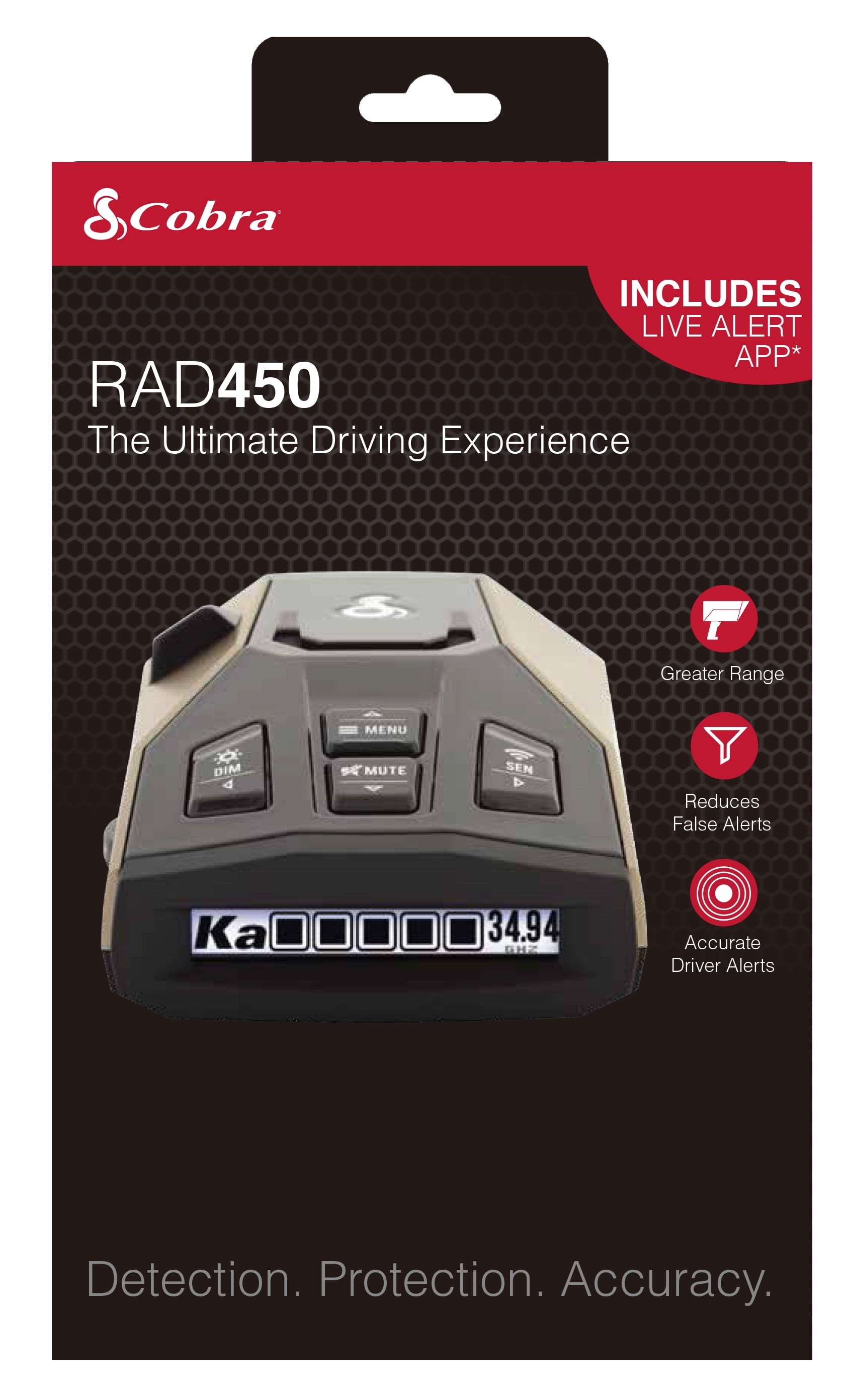 The Rad 450 keeps you aware of your surroundings by providing long range protection from radar and laser guns and eliminating false alerts with advanced IVT filtering. Never settle for the limited reach and low quality protection that most radar and laser detector provide. Detect laser and radar signals from a distance with this Cobra radar detector. Adjust the detector’s sensitivity at the touch of a button, and filter out unwanted alerts so you only get the information you need. Premium circuitry in this Cobra radar detector lets you eliminate false alerts from other radar detectors, fixed traffic-flow monitors and other systems. The advanced anti-falsing circuitry in the Rad 450 combined with the updatable IVT filter reduces false alerts from blind spot systems, traffic flow monitoring devices, and collision avoidance systems so you just hear what you need to hear. Updateable IVT Filter and advanced anti-falsing circuitry reduces false alerts from blind spot systems and other vehicle avoidance systems. Anti-Falsing Technology automatically reduces false alerts so you can hear just what you need to hear and stay focused on the road. Mute your Rad 450 with QuietDrive™ mode for when you want less audible alerts. The RAD450 is one of the top-rated radar detectors from the industry leader, Cobra Electronics. With best-in-class patented technology and audible band identification and signal strength, you can focus on enjoying the drive. This long-range unit comes with everything you need to get started and is pre-programmed for both English & Spanish. Choose Cobra for unparalleled radar detection!