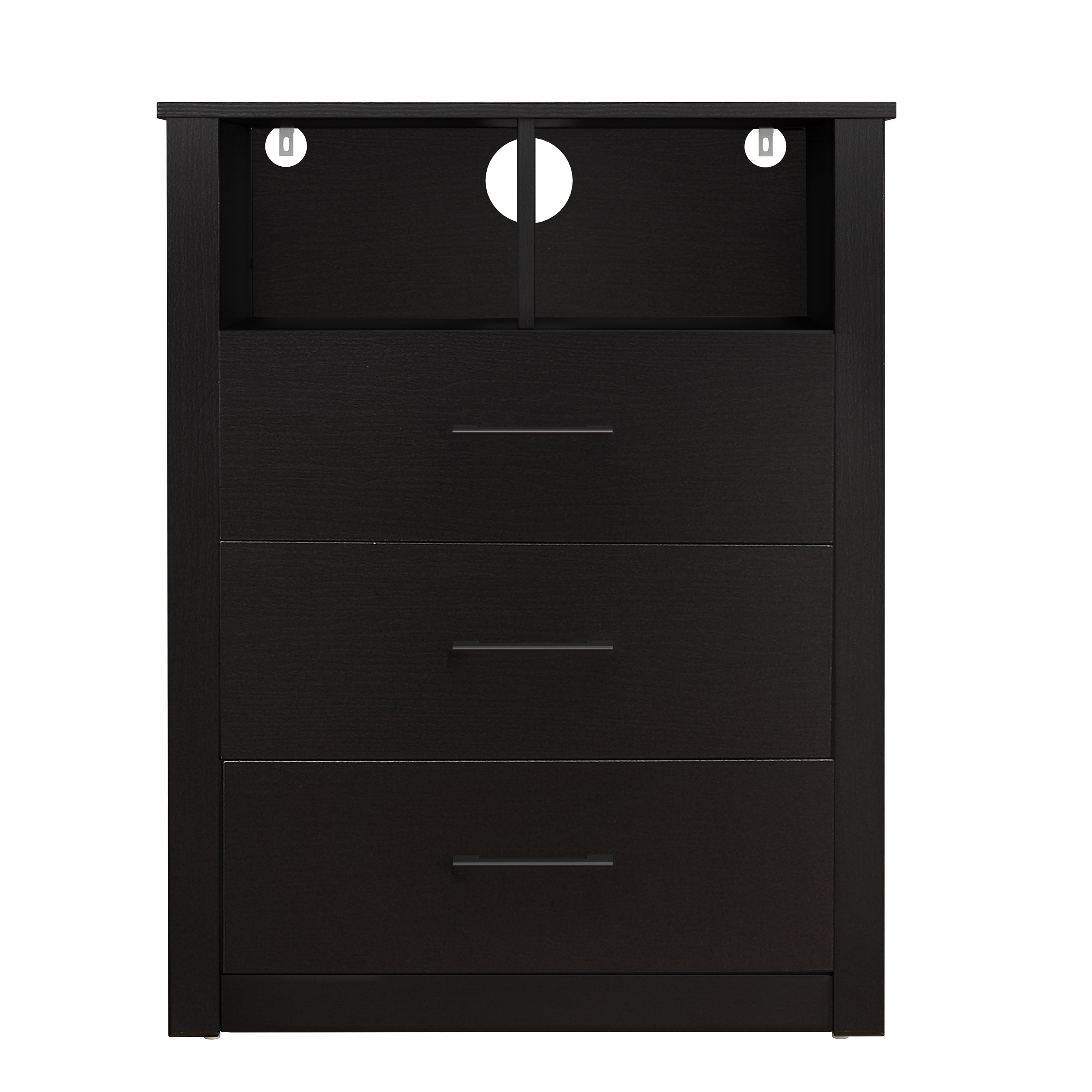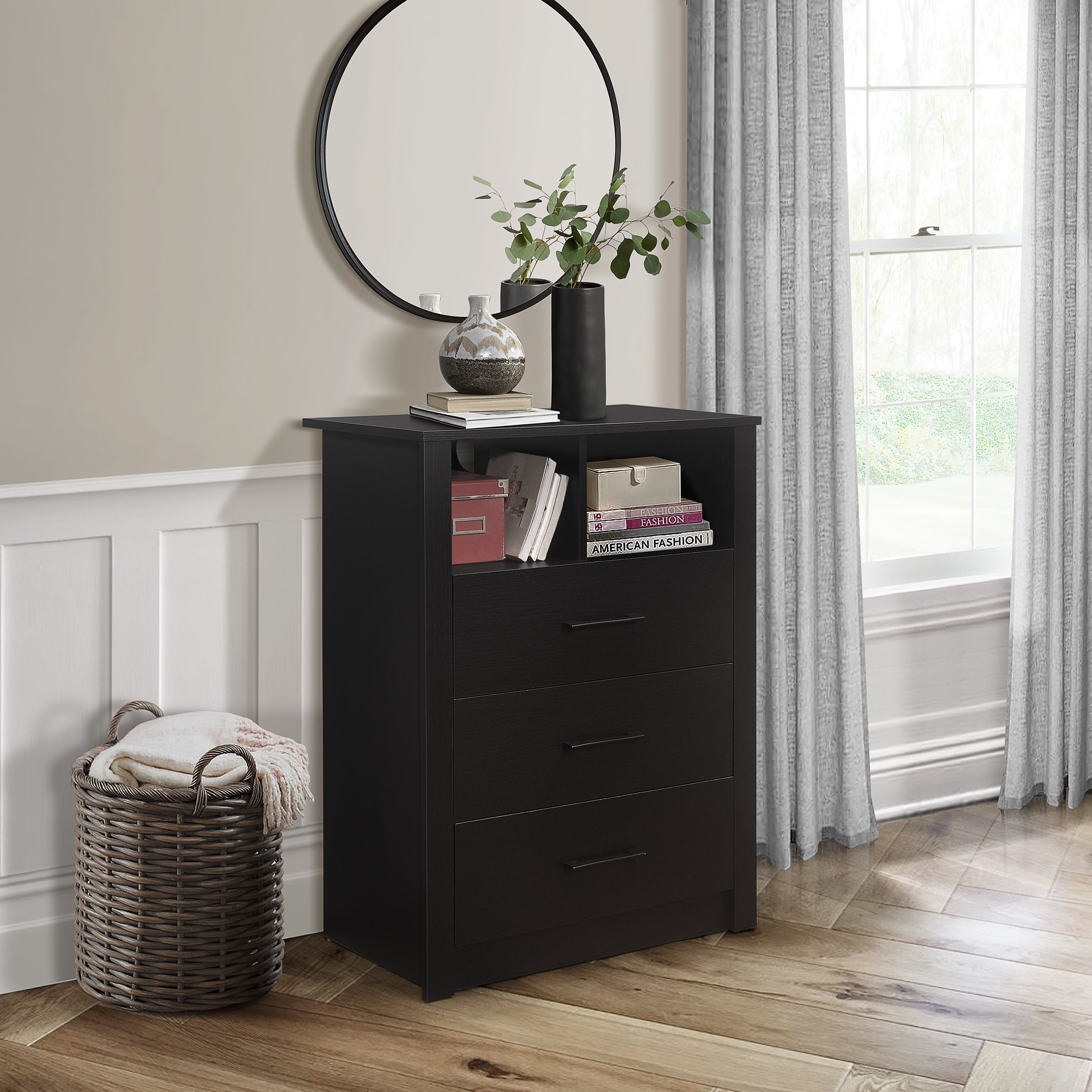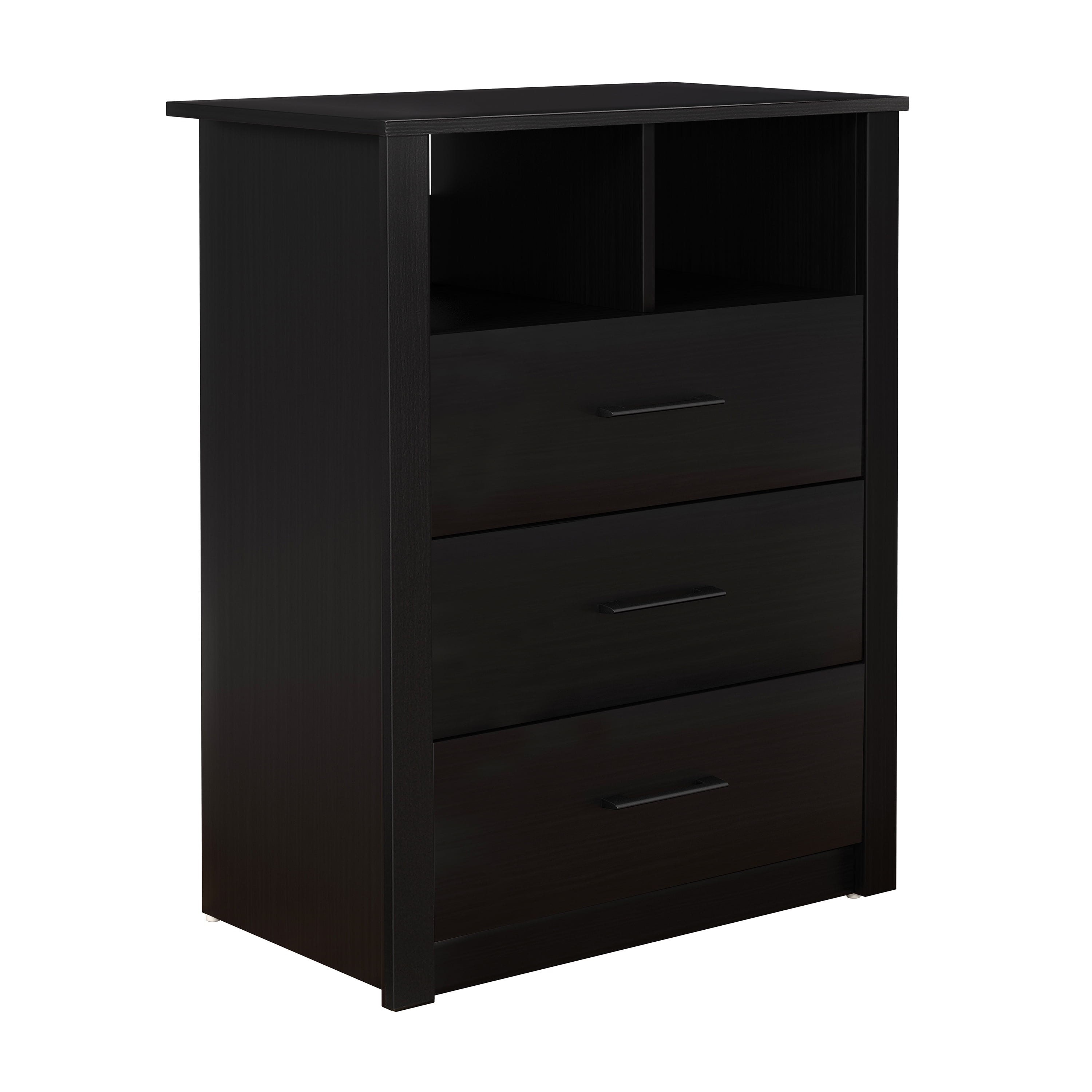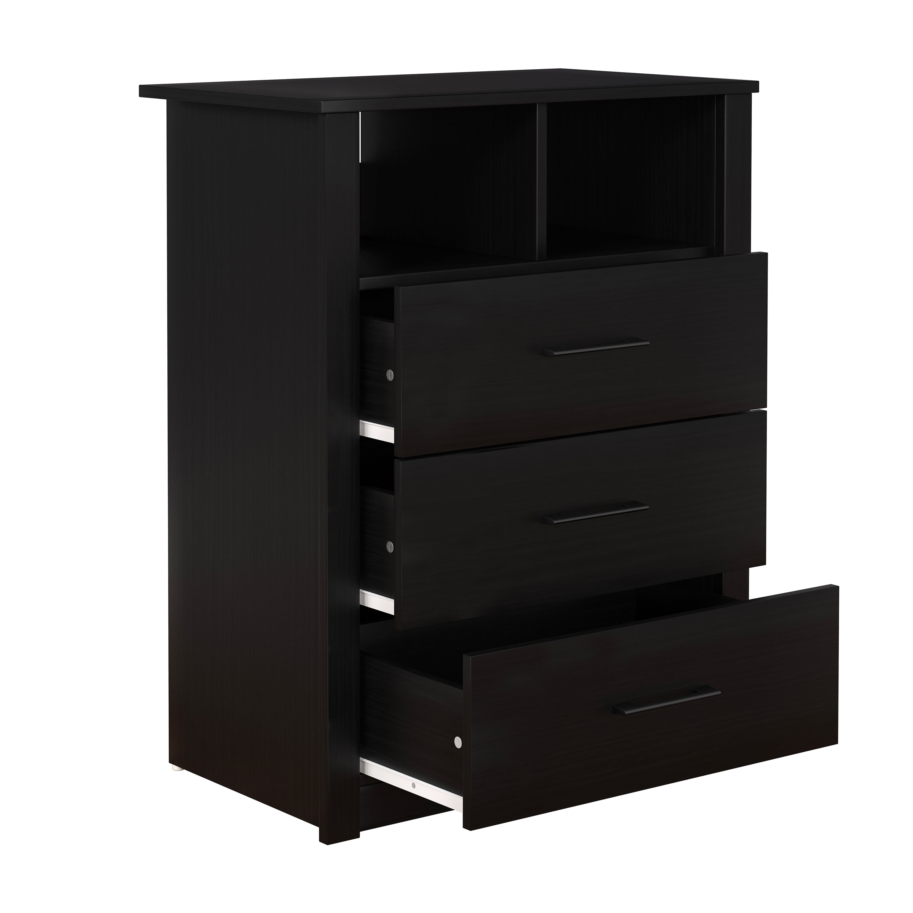 So what if you don’t have space for a massive entertainment console? We can help! Solve your space conundrums with our Coby 3 Drawer Media Dresser. This transitional vertical piece is specially designed to solve both space and media issues. The multi-functional Coby Media Dresser with an Black Oak Finish by Hillsdale Living Essentials offers multiple possibilities: Use the 3 drawers to store clothing or keep extra blankets organized, while the two open shelves 2 open storage shelves with cord management at the back can be home to a cable box, DVR and remote. Or, if you prefer, use the shelves to display your favorite treasures or things you want easily accessible. Or for even more options, wall mount your TV screen above the chest, use the compartments for your media components and decorate the top of the chest any way you want!