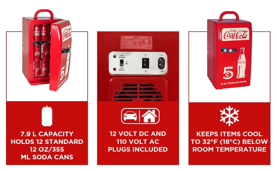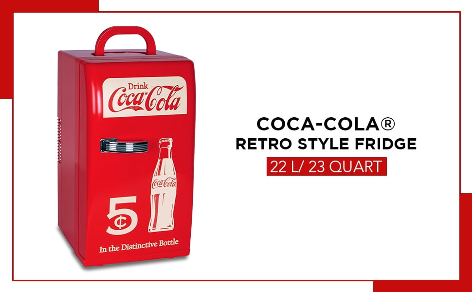 Celebrate your favorite pop in cool vintage style! This retro 1950s refrigerator-style mini fridge featuring vintage Coca-Cola graphics and eye-catching red exterior with polished chrome door handle is the perfect gift for everyone from students to memorabilia enthusiasts. Efficient, reliable thermoelectric cooling technology makes this 22L (23 qt) mini fridge a unique and practical addition to your office, dorm, or games room. It is AC and DC capable and comes with both cords so you can plug it into any standard household outlet or use it in your car, boat or RV. With 2 removable shelves and amm 18 can capacity, you can easily keep your favorite drinks and snacks cold or safely store items such as yogurt, cheese, milk, and infant formula.