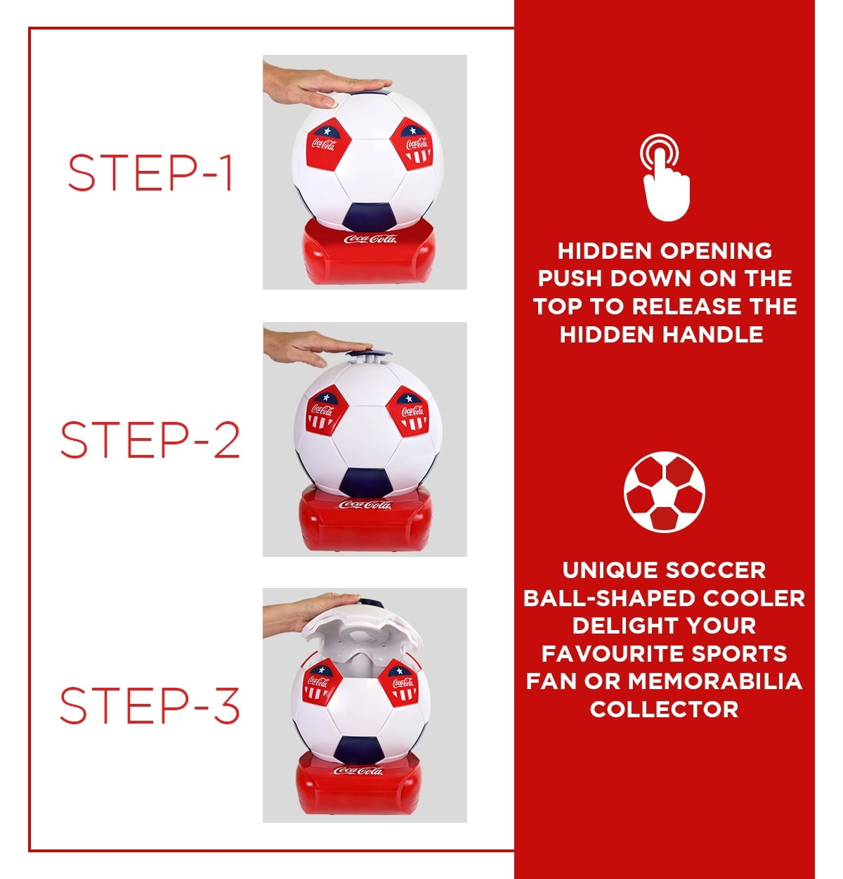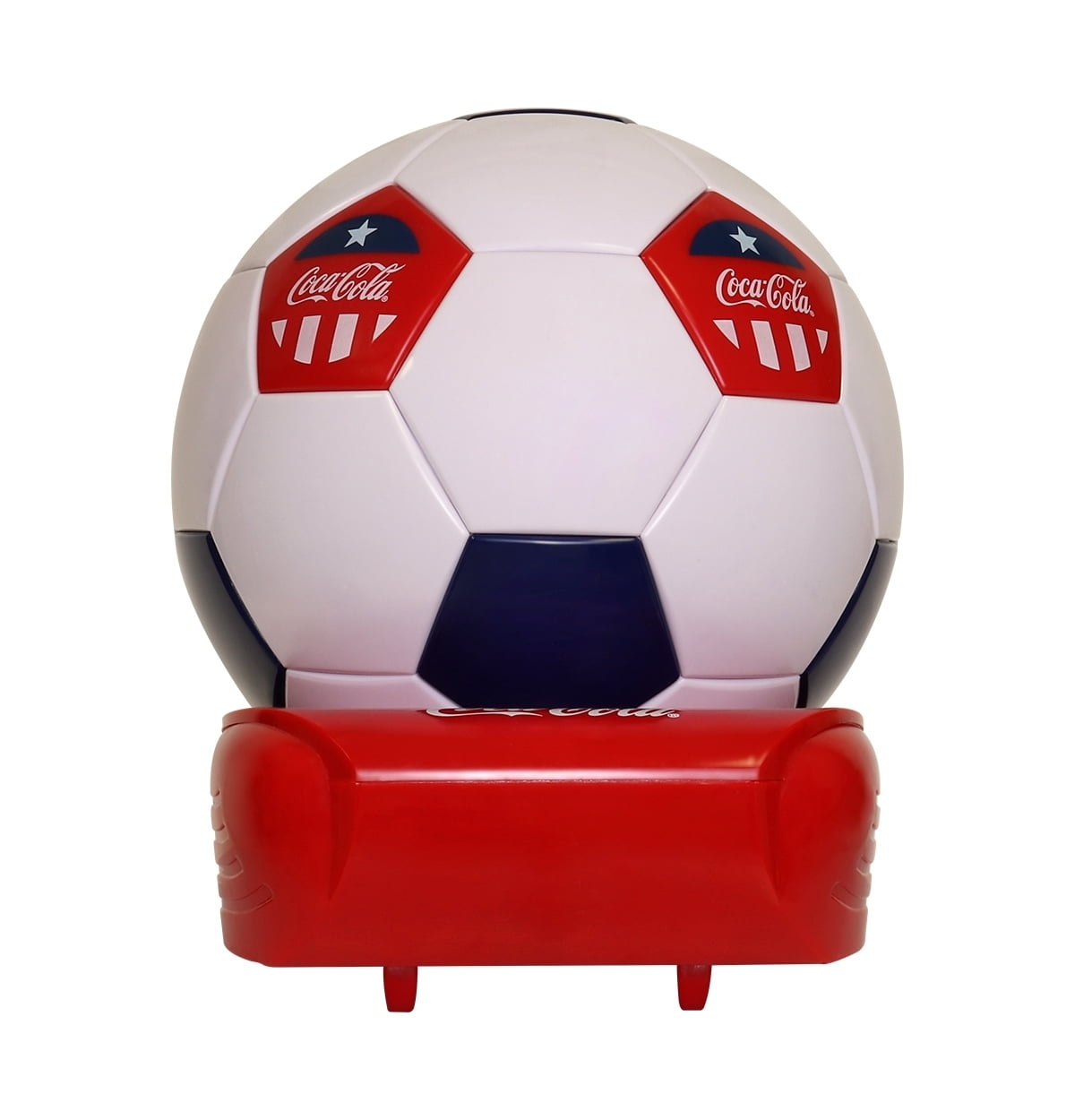 Delight your favorite sports fan or Coke memorabilia collector with this unique soccer ball-shaped cooler featuring official Coca-Cola Black Red White graphics. Efficient, reliable thermoelectric cooling technology with no CFCs or harmful chemicals makes this fun and functional 5-can Beverage Cooler an ideal conversation piece for home, office, dorm, games room, or RV, and its compact size is perfectly suited to keeping chilled beverages, snacks, or medication on a desk, shelf or side table. The best part is when you surprise your friends by pushing down on the top of the mini fridge to reveal the hidden handle and chilled beverages inside! , Unique Accessory for Den, Games Room, Man-Cave, Dorm, Perfect Gift for Dad, Sports Fans & Students