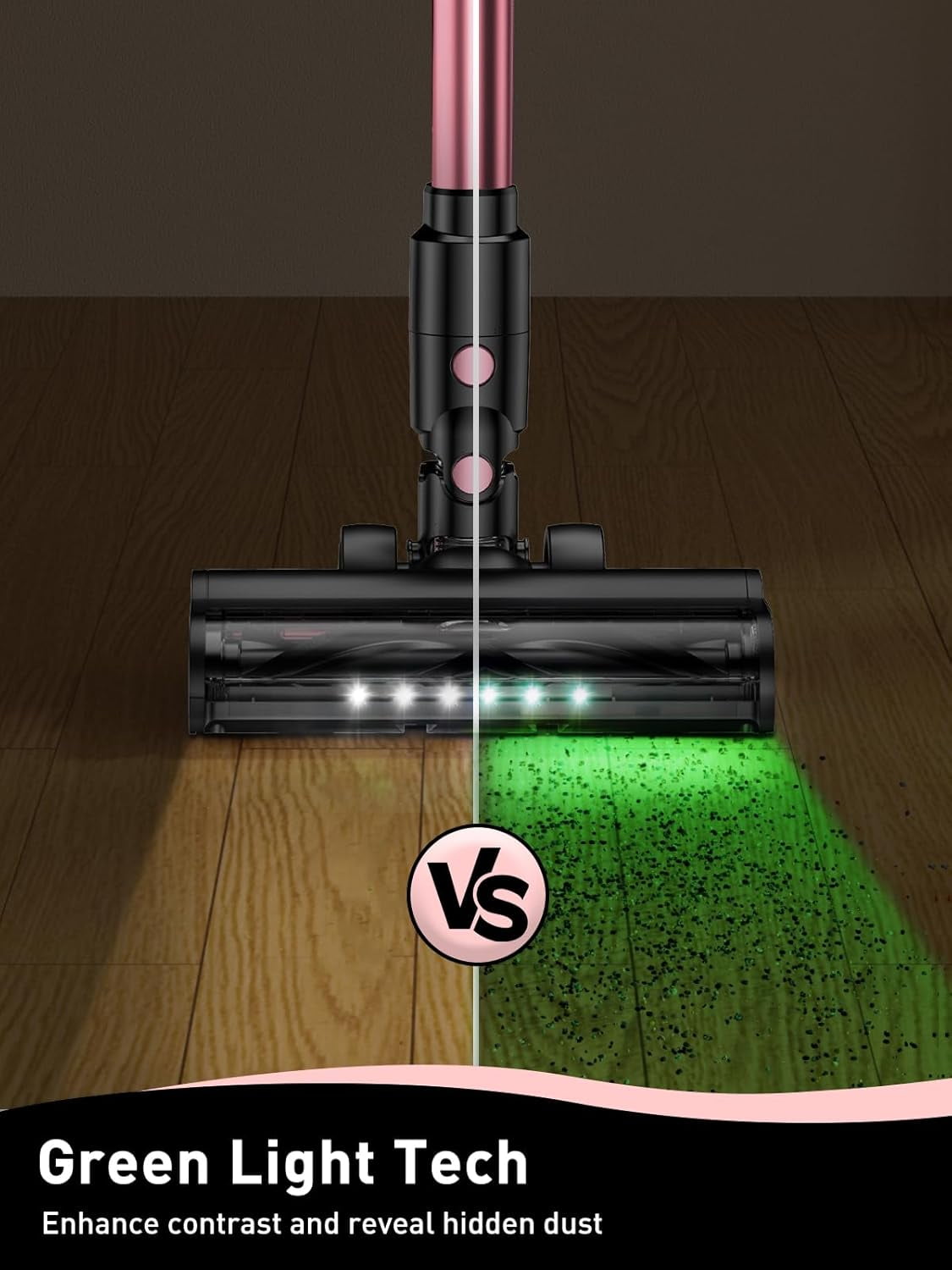 Smart LED Display:Stick vacuum stay informed with the real-time LED display that shows remaining power, suction mode, and blockage reminders. User-friendly physical button switches and suction adjustments prevent accidental touches, making your cleaning tasks simpler and more convenient. Upgraded Green Light & Anti-Winding Floor Brush:The cordless vacuum with a V-shaped anti-tangle floor brush lifts embedded dirt and pet hair from carpets and hard floors, reducing hair tangles and cleaning time. The brush head supports 270° rotation and green LED light can detect dirt more accurately than the traditional white LED light, thus performing a thorough cleaning. Multiple High-Efficiency Filtration:Vacuun cleaner benefit from the 6-layer filtration system featuring new cyclone technology and a high-density mesh design. This system removes up to 99.97% of tiny dust particles as small as 0.1 microns, protecting the engine and keeping indoor air clean, Let your family feel like they are always breathing forest air. Versatile, Lightweight, and Portable:Assemble the lightweight vacuum cleaner into 8 different combinations to meet all your cleaning needs. Weighing only 2.93 pounds (main body), this lightweight design is perfect for one-handed cleaning and comes with a range of accessories for versatile use, for example: sofas, cars, curtains, gaps, stairs, ground. Detachable Battery & Long-Lasting Runtime:Powered by a 6*2200mAh high-capacity, rechargeable battery, enjoy up to 45 minutes of runtime in standard mode. The removable battery can be charged separately, you can confidently complete your cleaning tasks without interruption. Say goodbye to the hassle of constantly charging your home vacuum mid-clean! Worry-Free After Sales: We prioritize service with a lifetime customer service guarantee and a 2-year return and exchange service. Enjoy a long-term warranty to maximize your satisfaction. For any issues with the vacuum cleaner, we are here to assist you.