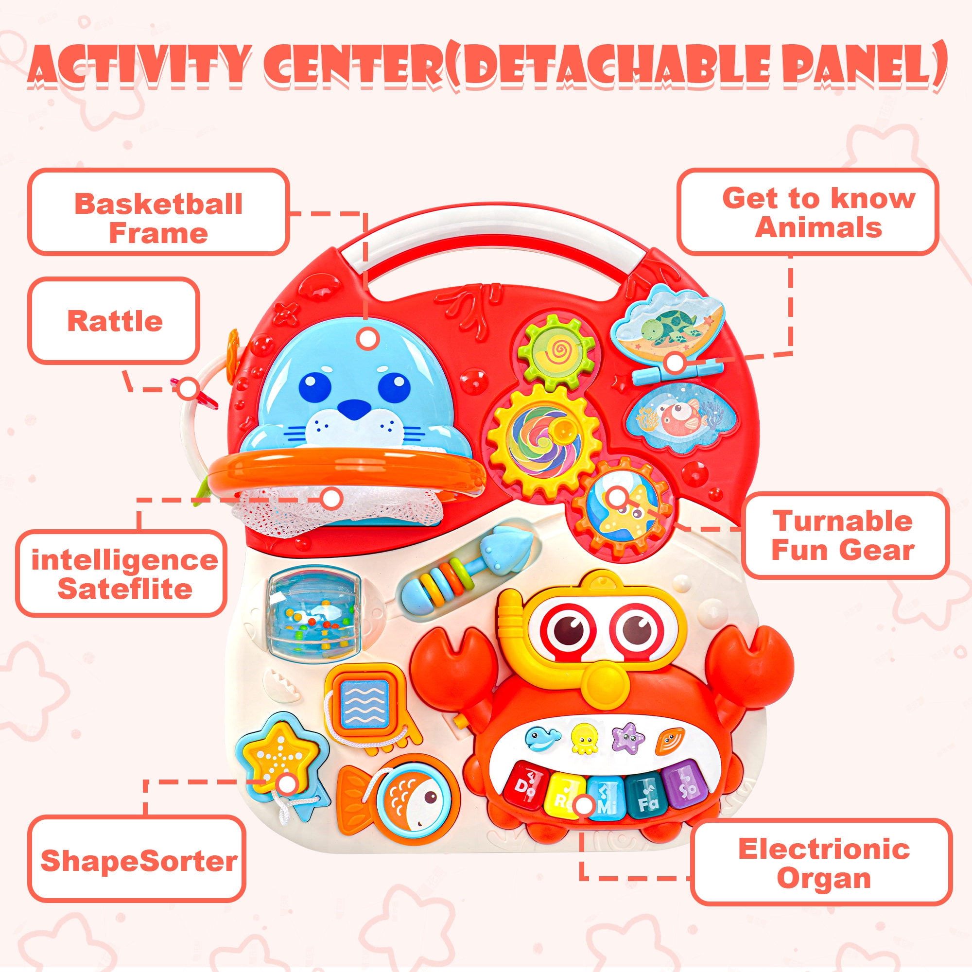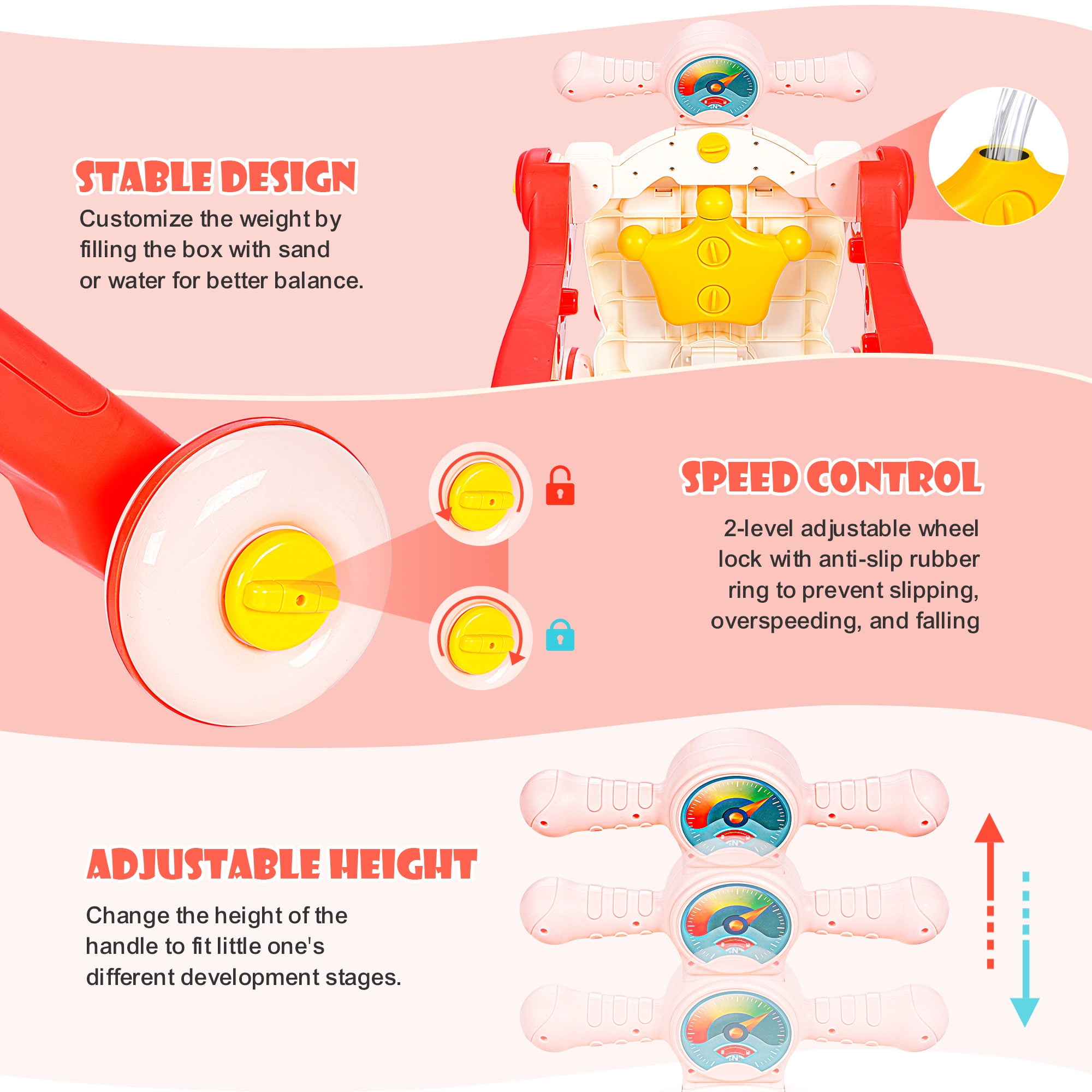 COCLUB 5-IN-1 MULTIFUNCTIONAL DESIGN – MORE THAN A WALKER! Unique 5 modes: baby walker, ride-on scooter, activity table, music piano, & basketball game! Perfect for baby boys and girls 6-12 months to learn walking while playing. EARLY LEARNING TOYS ¡Andadera para bebés segura! Detachable game board with Spanish/English labels, 3 shape blocks, piano keyboard, and basketball hoop – boosts color/shape recognition & motor skills. ADJUSTABLE SPEED & ANTI-SLIP CONTROL Safety-first design! Push walker with anti-slip rubber wheels + 3-speed modes (adjust via rear button). Add water to the tank for heavier babies – prevents tipping! HEALTHY BONE DEVELOPMENT & SAFE MATERIALS Meets ASTM safety standards ABS plastic + triangular leg support design. Pediatrician-approved to encourage natural walking posture, NOT medical claims. EASY-GIFT READY WITH WARRANTY Includes gift box & “To/From” tag! Backed by a 1-year warranty – the best Christmas/birthday gift for baby push walker lovers! COCLUB 5-IN-1 MULTIFUNCTIONAL DESIGN – MORE THAN A WALKER! Unique 5 modes: baby walker, ride-on scooter, activity table, music piano, & basketball game! Perfect for baby boys and girls 6-12 months to learn walking while playing. EARLY LEARNING TOYS ¡Andadera para bebés segura! Detachable game board with Spanish/English labels, 3 shape blocks, piano keyboard, and basketball hoop – boosts color/shape recognition & motor skills. ADJUSTABLE SPEED & ANTI-SLIP CONTROL Safety-first design! Push walker with anti-slip rubber wheels + 3-speed modes (adjust via rear button). Add water to the tank for heavier babies – prevents tipping! HEALTHY BONE DEVELOPMENT & SAFE MATERIALS Meets ASTM safety standards ABS plastic + triangular leg support design. Pediatrician-approved to encourage natural walking posture, NOT medical claims. EASY-GIFT READY WITH WARRANTY Includes gift box & “To/From” tag! Backed by a 1-year warranty – the best Christmas/birthday gift for baby push walker lovers!