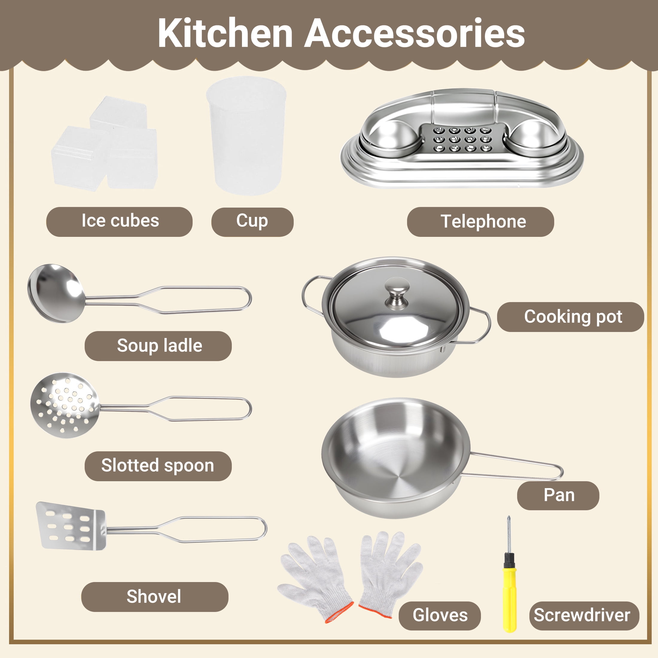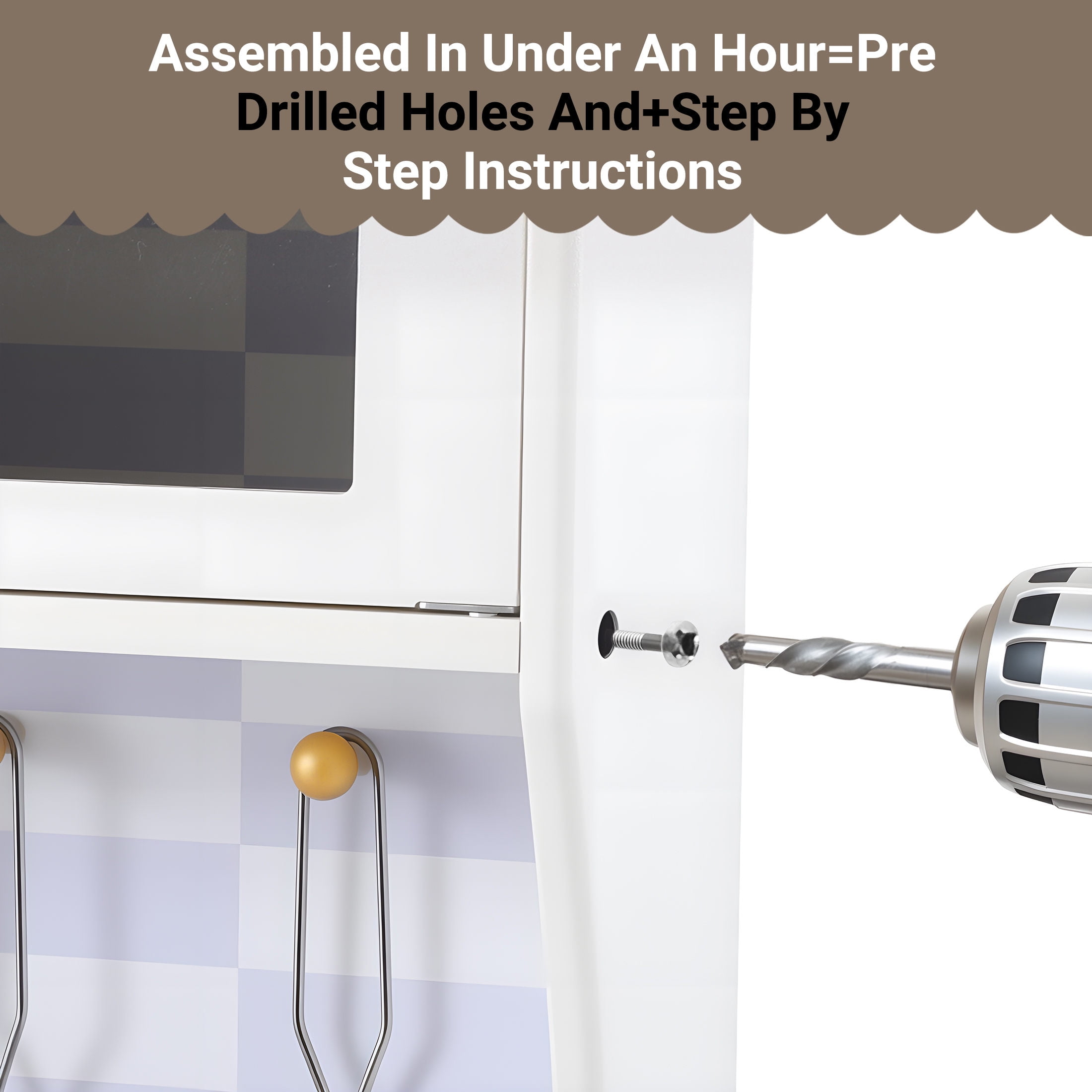 Our wooden play kitchen is filled with lots of fun features. First, boys and girls can use the blackboard to write down the delicacies that the caller wants, then turn on the stove switch that makes a sound, use food-grade kitchen utensils to cook delicacies, and even use the ice machine to make ice cubes, all the functions of a real kitchen We all have it: faucets that open and close, sinks, cupboards, microwaves, towel rails. Give children the most realistic experience. Our children’s kitchen toy set is made of high-quality wood for durability, and the back is treated to prevent moisture and mold. Almost as sturdy as furniture, it will last for years in your pretend play kitchen. The overall dimensions (33.07 inches long, 10.62 inches wide, 31.5 inches tall) are large enough for multiple children to play at the same time. This toy kitchen makes a great Christmas and birthday gift for boys and girls ages 3-8! Enjoy peace of mind as your children play with this sturdy and entertaining kitchen playset. Durably constructed from sturdy wood and Food grade stainless steel material, And passed CPC certification, The corners have also been processed to ensure the safety of children. While we strive to minimize assembly time during product manufacturing, assembling durable toys can still take some time. By following the attached instruction manual carefully, you can set up your virtual kitchen and complete the assembly in approximately 60 minutes. (Installation Tips: Pay attention to distinguish the size of the screws during installation to avoid using the wrong screws and causing damage to the board) Our kids kitchen playset is designed to the highest quality standards, and to nurture minds and hearts. If your child is not completely satisfied, please do contact us, We stand behind our product with a money-back guarantee, warranty, and lifetime customer service. If you encounter any issues, feel free to contact us without hesitation.
