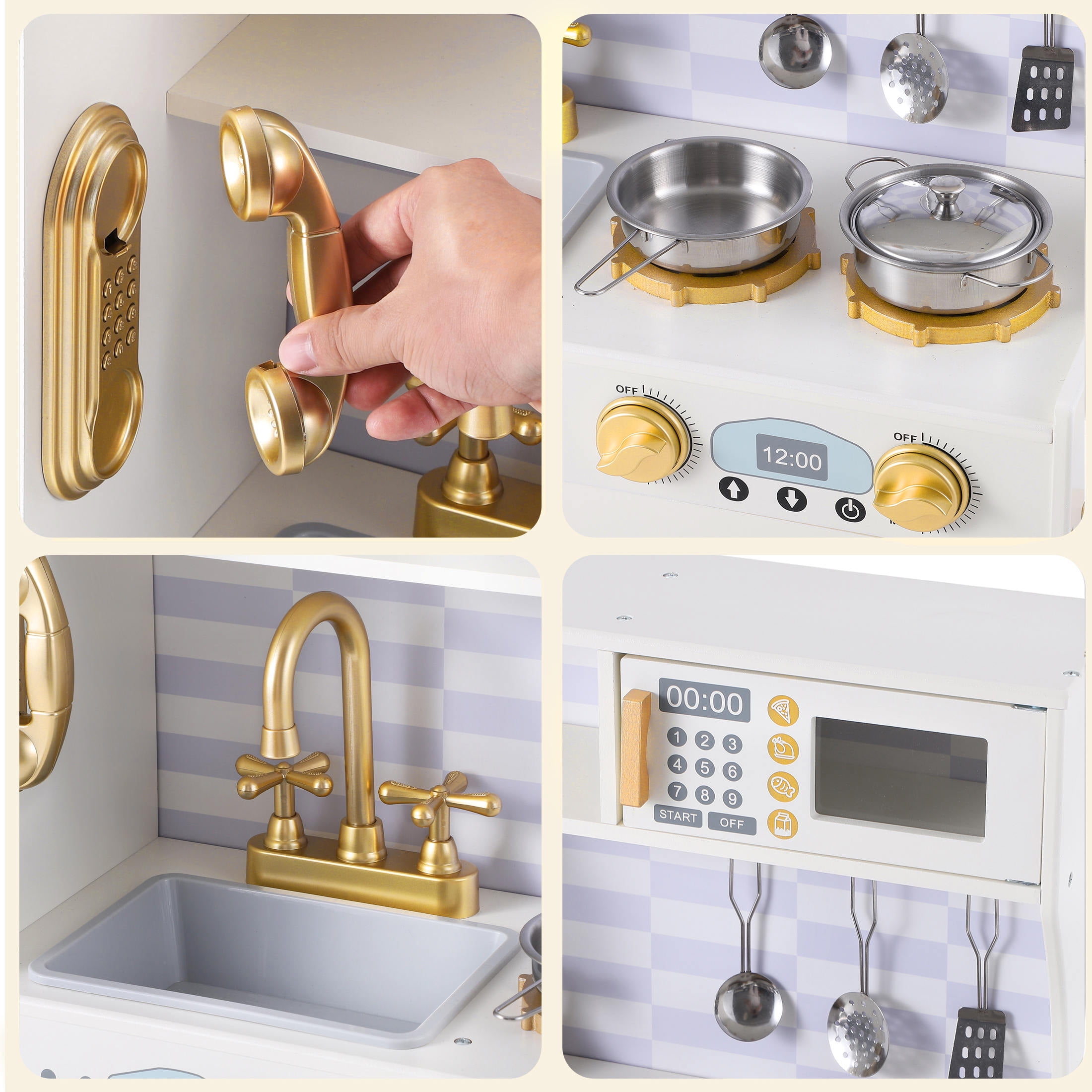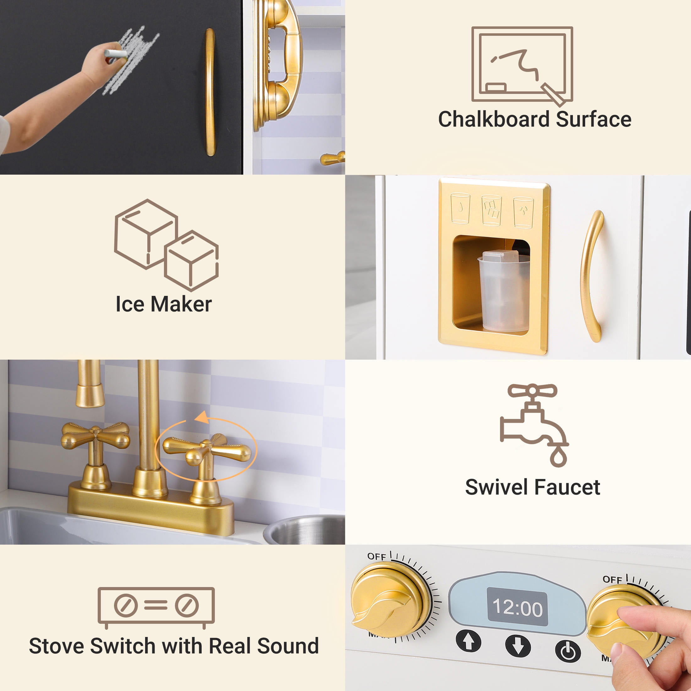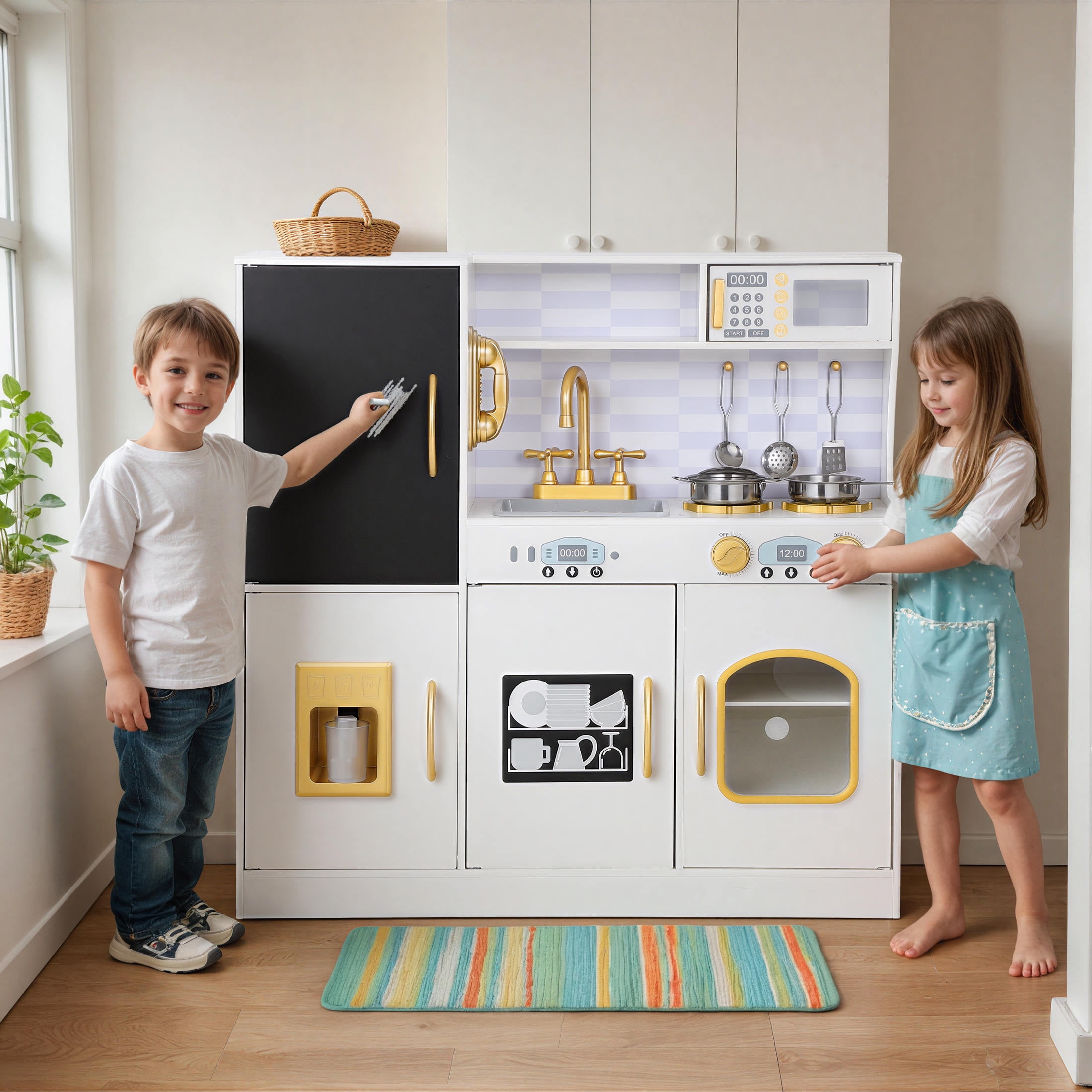 COCLUB Play Kitchen, Wooden Kids Kitchen Playset with Chalkboard, Ice Maker, Play Phone, Cookware Accessories, Microwave Toy Kitchen Gift for Boys Girls Age 3-8 White