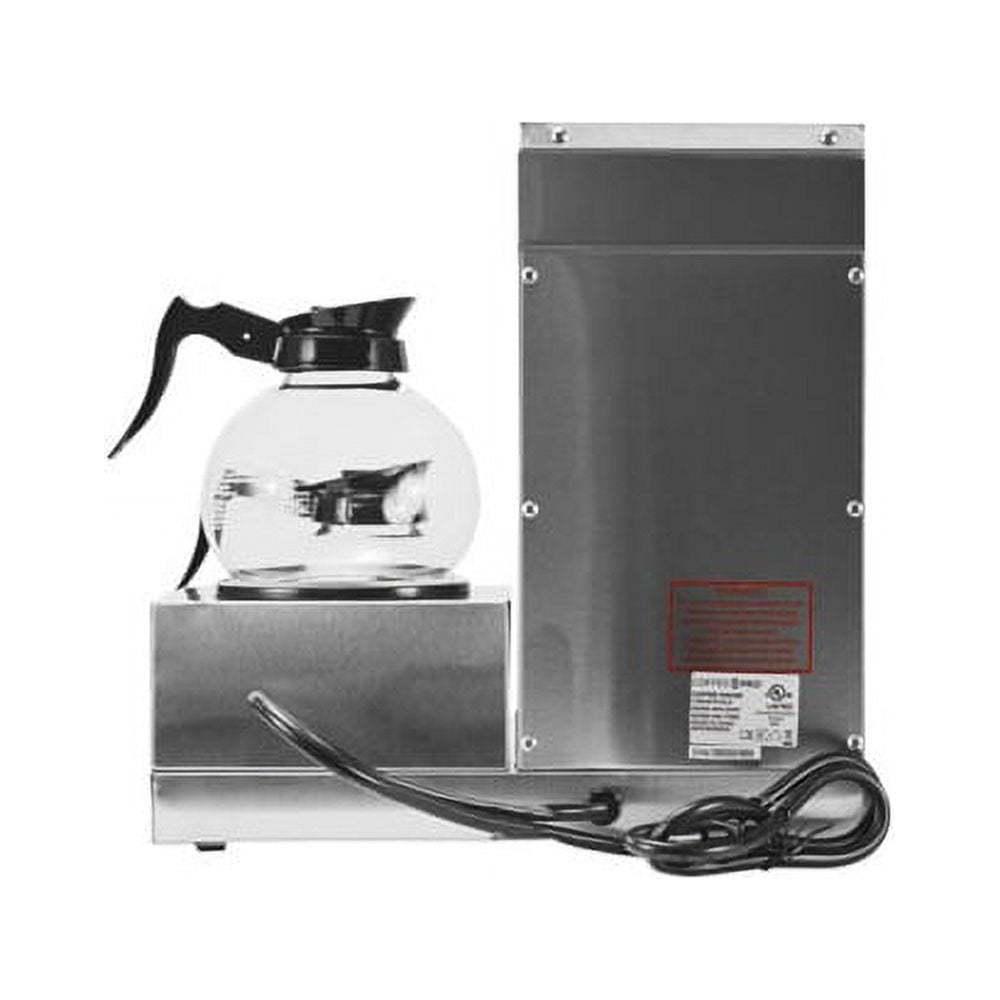 Independent warmers. High energy efficiency. Designed for fresh water pour-over. Grounded cord with three prongs. High capacity service. Decanters sold separately.