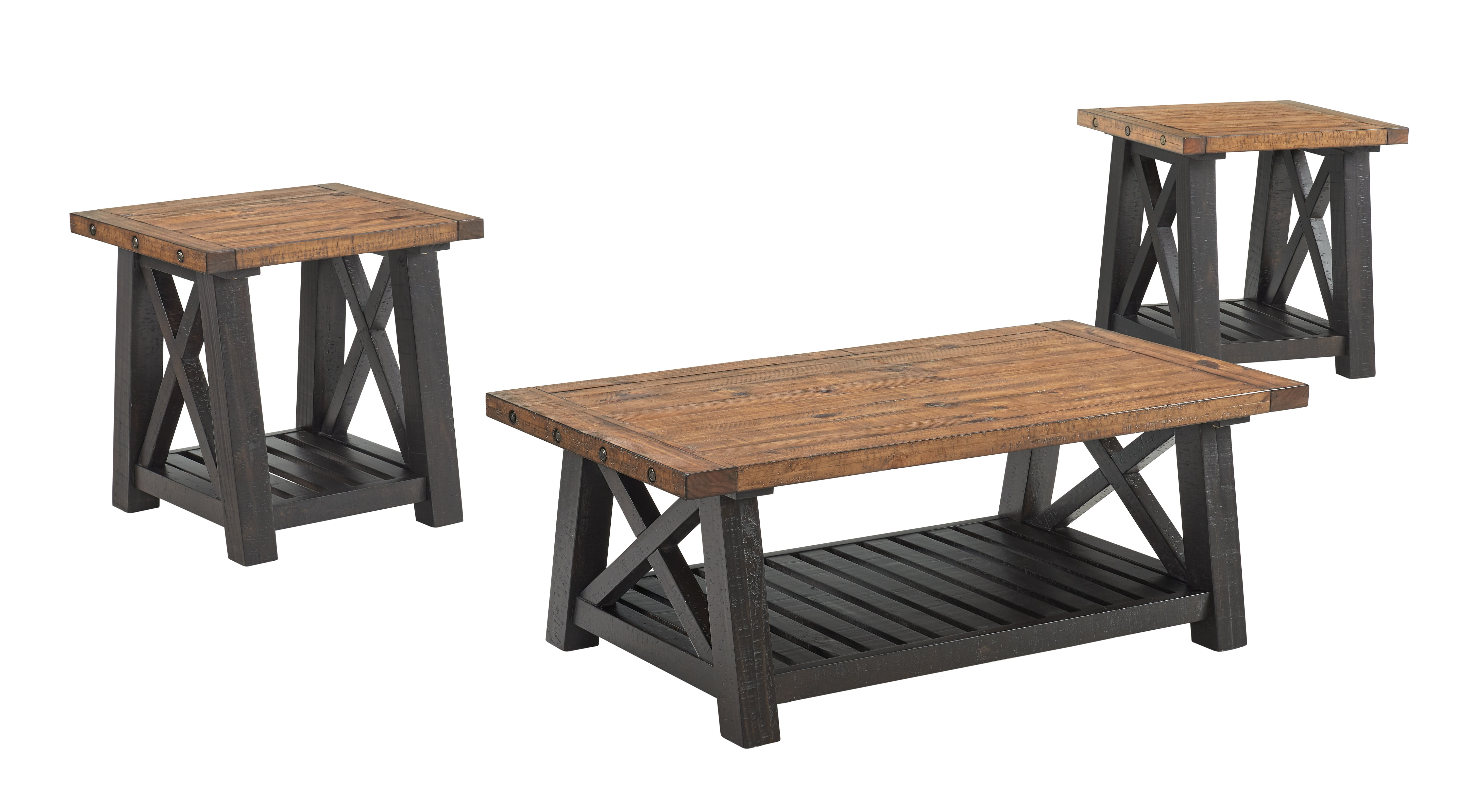 Coffee Table with Slatted Shelf and X Legs, Brown and Black- Saltoro Sherpi Quality craftsmanship meets transitional style with this Coffee Table that comes with a slatted bottom shelf and a rectangular tabletop. Constructed sturdily from pinewood frame, it is accented with a dual tone finish. Warning: This product can expose you to chemicals including Formaldehyde, which is known to the State of California to cause cancer or birth defects or other reproductive harm. For more information, go to Specifications: Product Type-Coffee Table Upholstered-No Recycled Content-No Level of Assembly-Full Assembly Needed Additional Tools Required-All Tools Included Gloss Finish-No Cabinets-No Number of Shelves-1 Drawers-No Top Color-Brown Base Color-Black Storage Included-Yes Scratch Resistant-No Pieces Included-One Coffee Table Base Type-Frame Top Shape-Rectangular Queen Anne Legs-No Number of Tables Included-1 Lift Top-No Extendable-No Contains 1 Coffee Table only Incorporates a wide rectangular tabletop Comes with slatted bottom shelf X Shape legs Aesthetically pleasing grain details Bolt accent on the side edges Hidden casters for mobility Dual tone finish