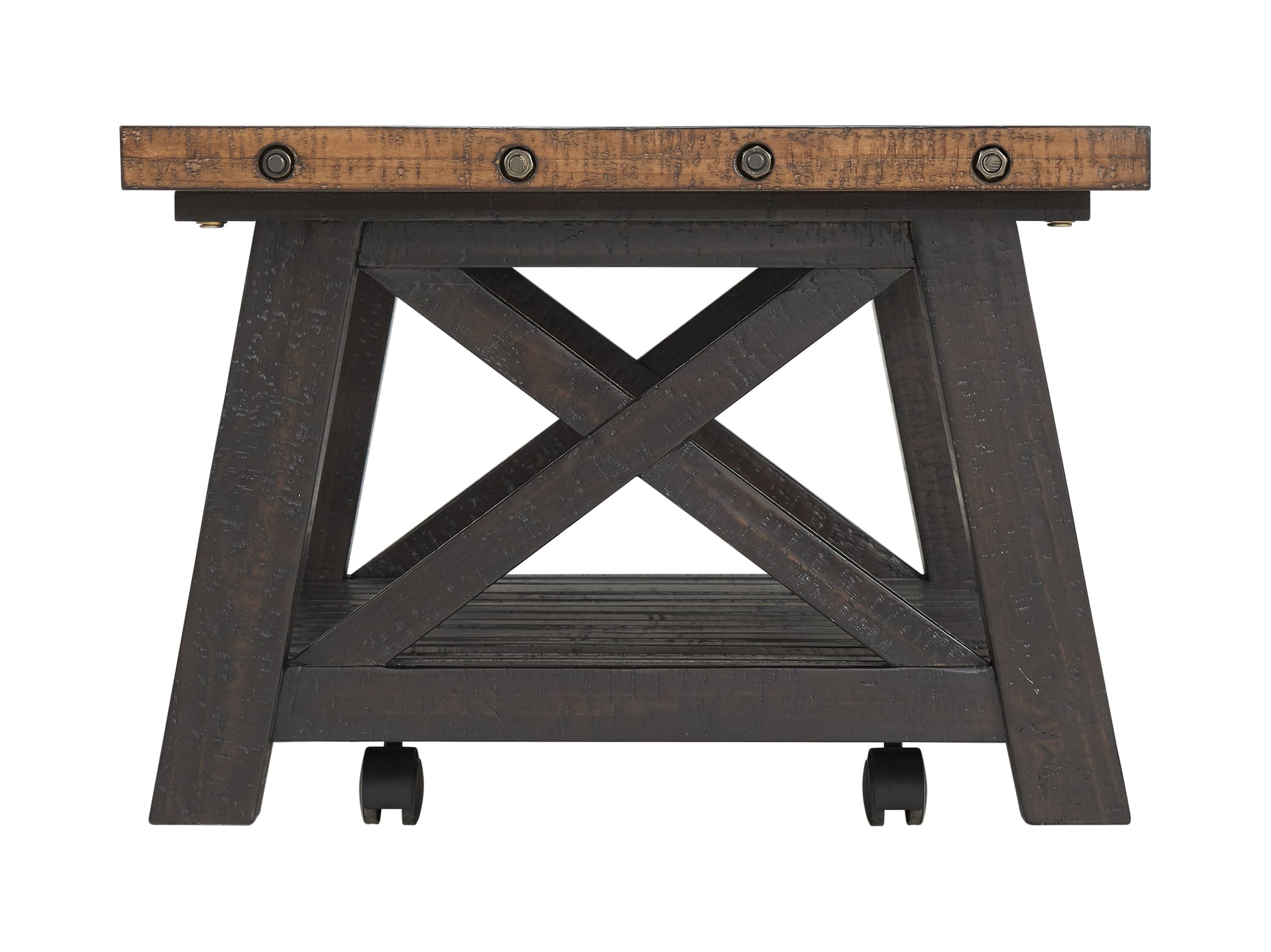 Finish: Black Stain with Natural Top Constructed of solid New Zealand Pine Industrial bolts are finished in a dark aged bronze and span across each end of the table; Includes hidden casters to easily move the table around the room 1.5″ thick tops and X-Framed legs add to the industrial style One bottom shelf for extra storage space Easy assembly