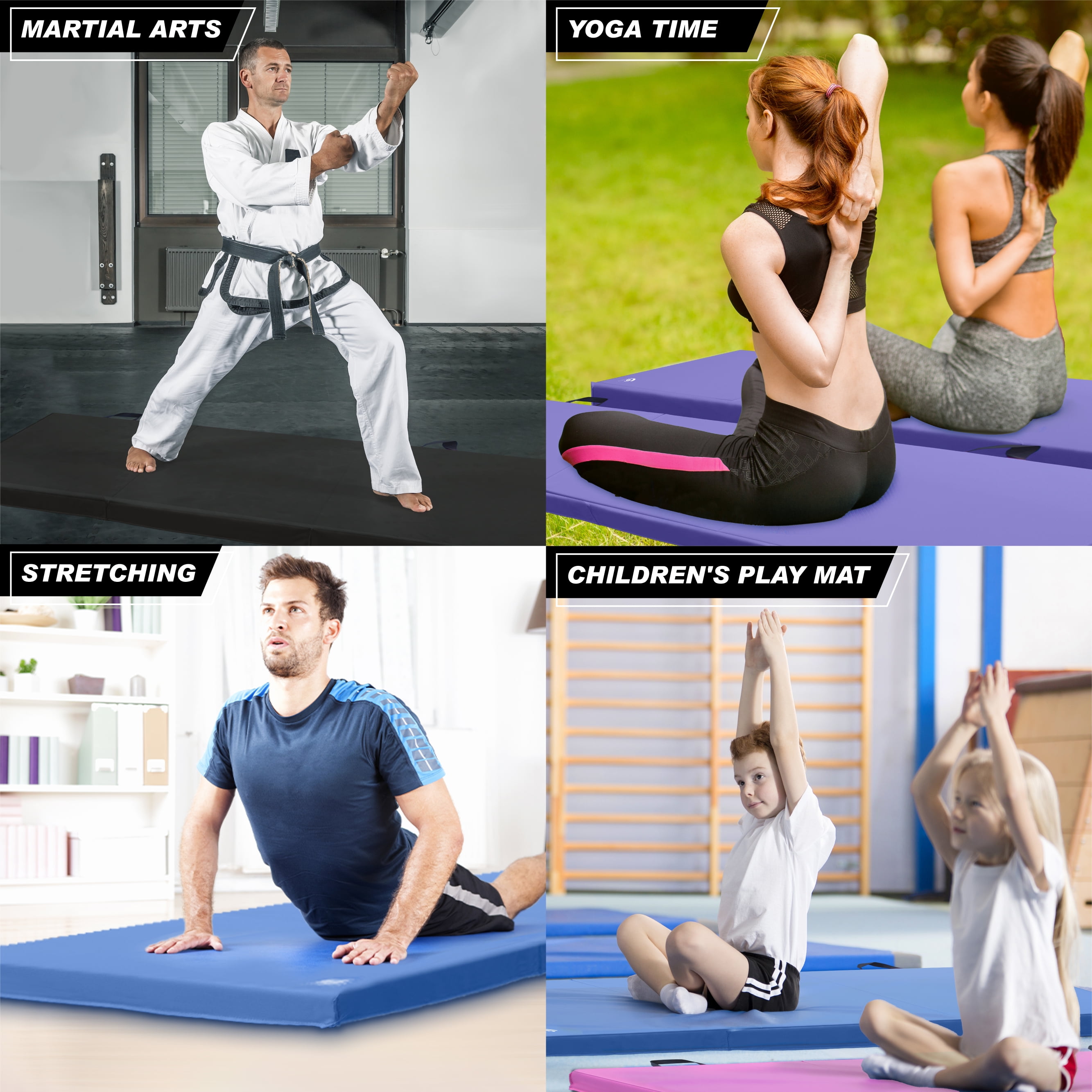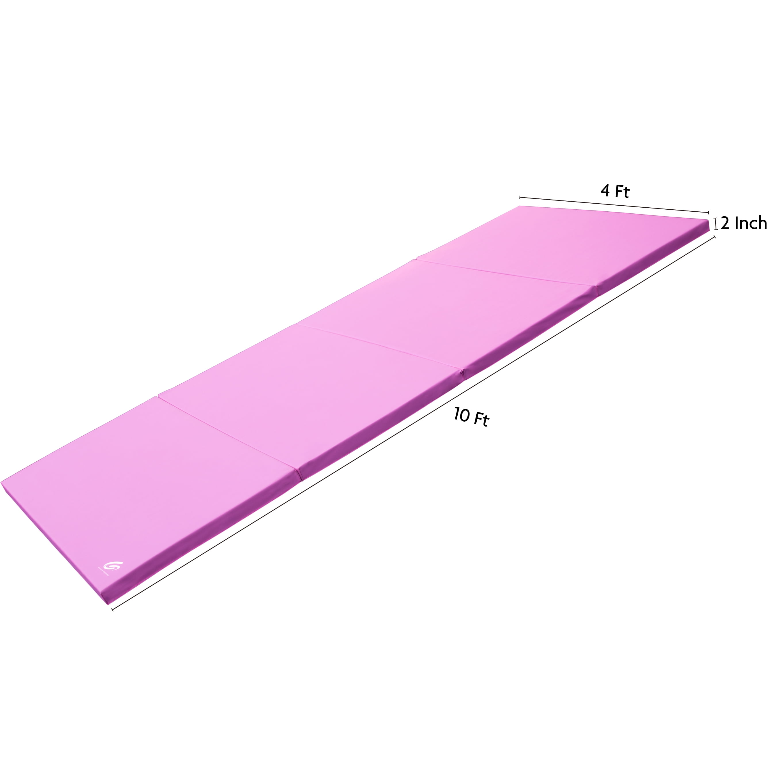 Great for stretching, gymnastics, workout routines, yoga, and more 4-fold design and attached handles for easy portability Thick 2″ PVC and polyethylene foam supports your lands and softens your falls Folded profile offers neat, compact storage after use Expanded dimensions: 4′ x 10′ x 2″ Available in Black, Pink, Blue, and Purple