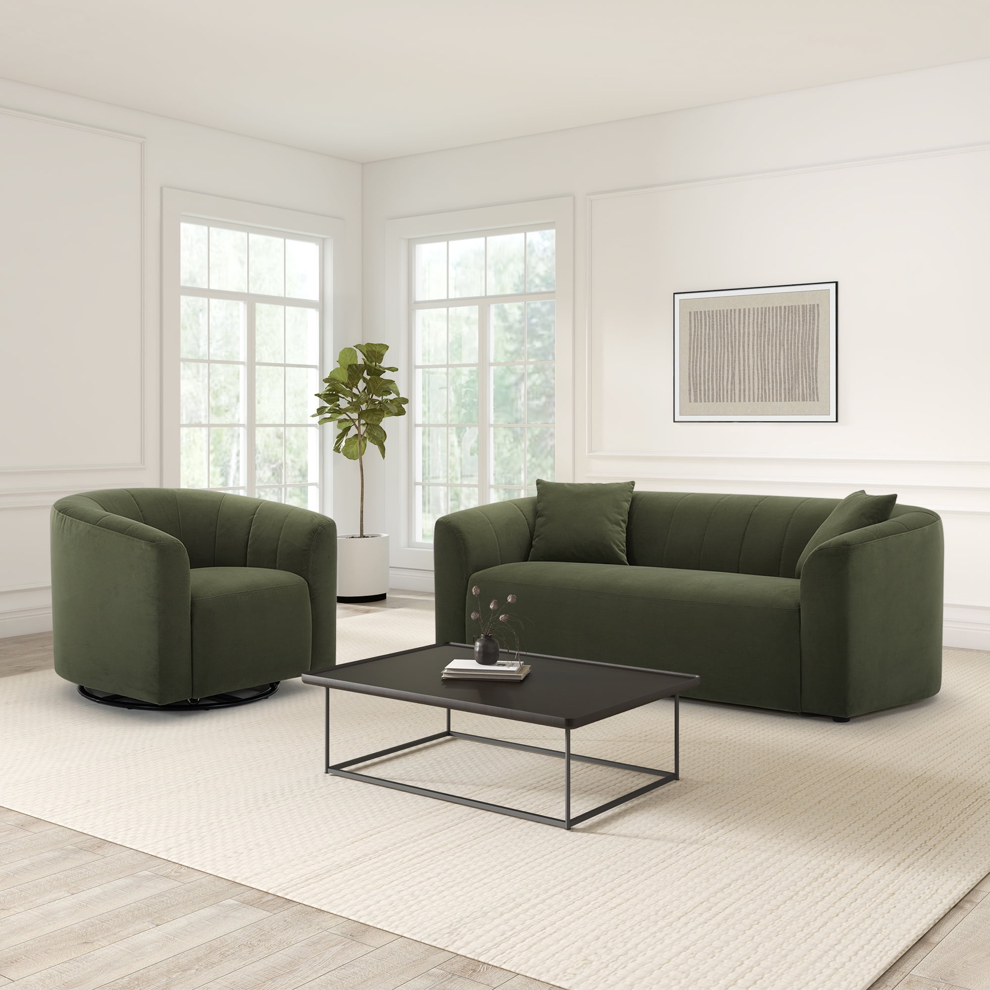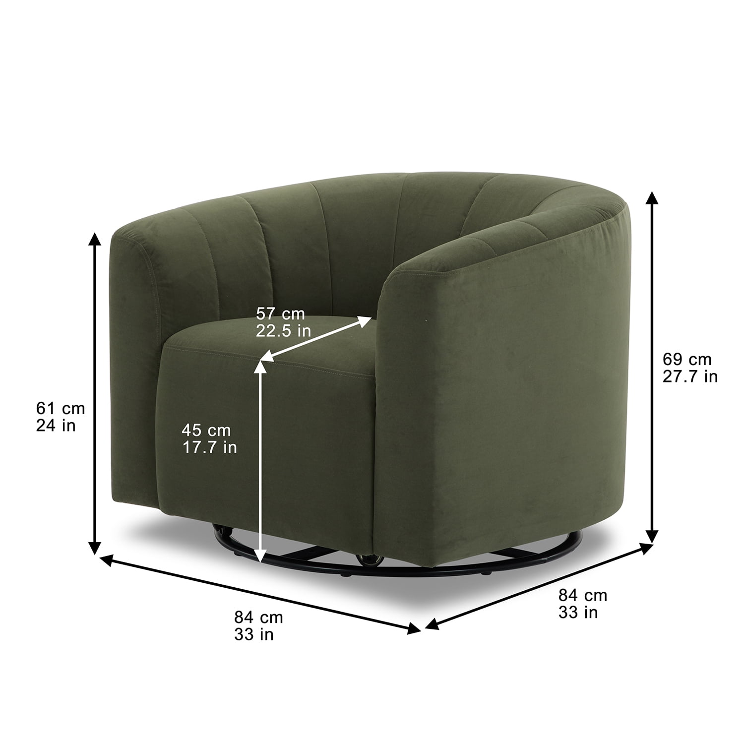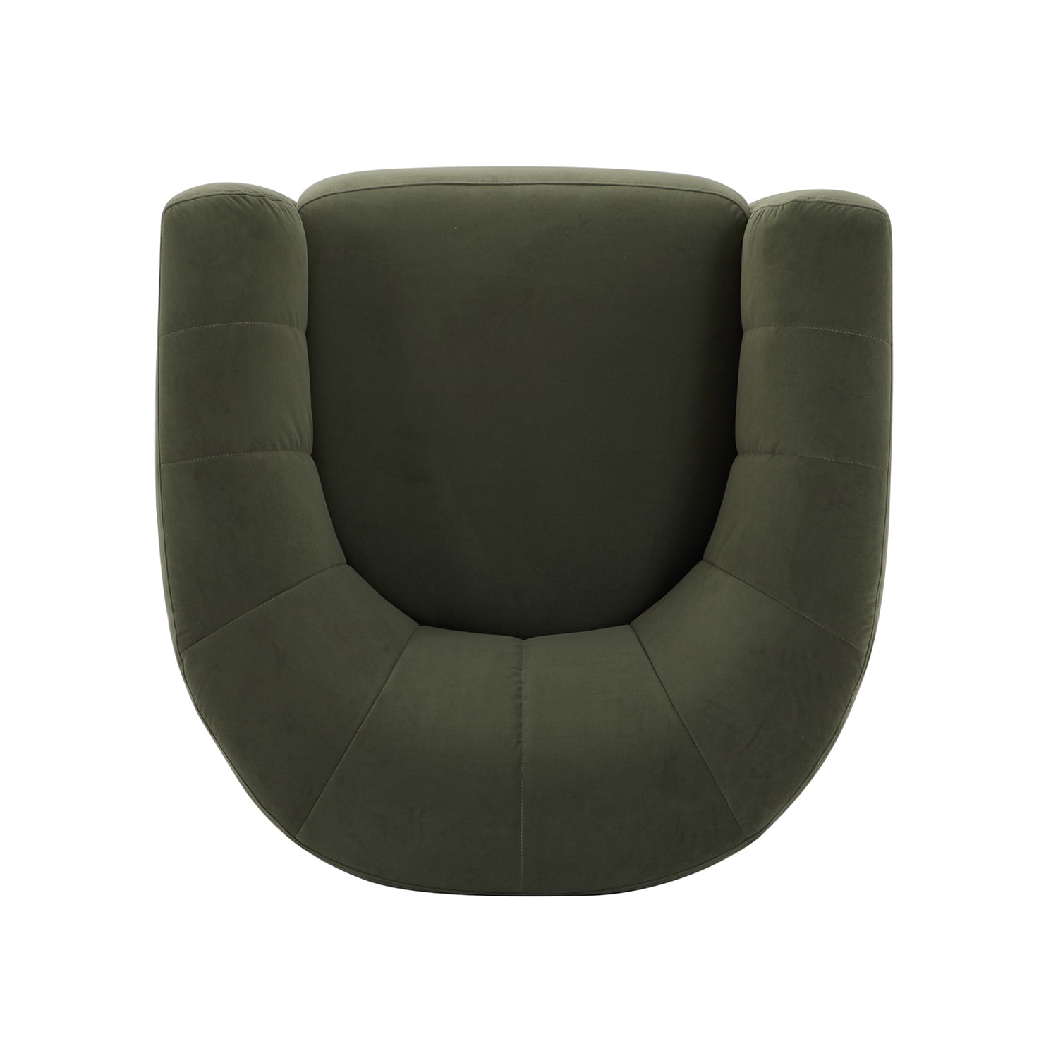 The Cole & Rye Swivel Chair, Olive, is perfect for any contemporary living space. Its curved arm and welt trim emphasize its shape and add to its sophisticated appearance. The olive velvet upholstery and its plush feel and soft texture enhance the overall aesthetic of the chair, making it an ideal choice for relaxing and unwinding after a long day. The channel tufted back adds comfort and style to the design, making it functional yet elegant. With the 360-Degree Swivel Base, you have added versatility and extra lounging comfort. The chair features sturdy solid, engineered wood construction that ensures longevity so you can enjoy your contemporary accent chair for years to come. The Dacron and high-density foam make for a comfortable seat, and the webbed seat suspension adds to its stability. Best of all, no assembly is necessary for this chair, so you can sit back and relax in no time!
