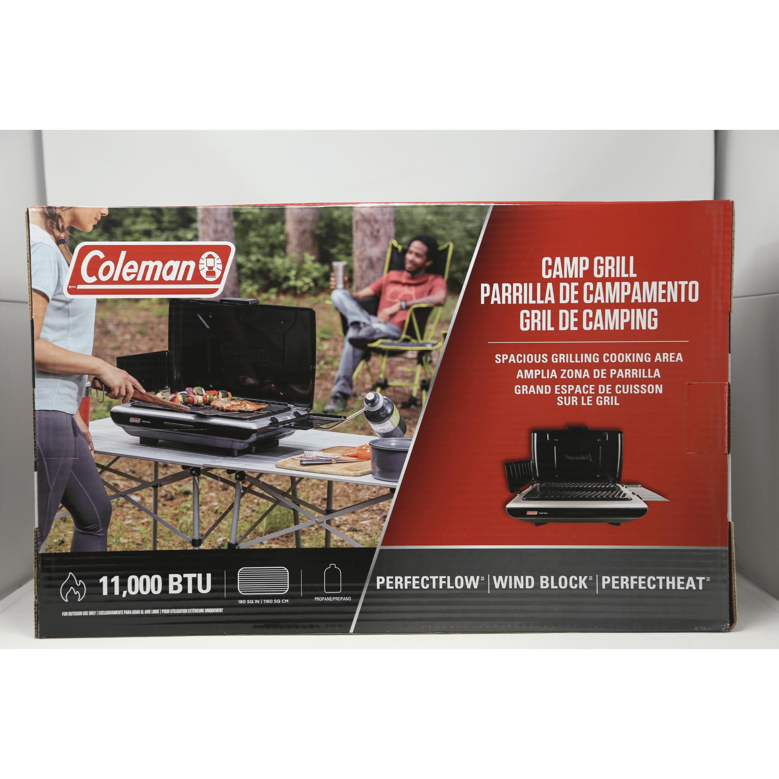 Enjoy easy outdoor grilling at the campsite or tailgate party with the Coleman Camp Propane Grill. With a heat intensity of 11,000 BTUs, this durable, steel-crafted grill gives you the cooking power to prepare a wide range of foods. Perfect Flow technology helps keep the heat steady even in extreme conditions, while Perfect Heat technology allows for more fuel-efficient cooking. Wind Block panels help shield your flame from the wind and fold down for use as side tables on calm days. With its 180-square-inch cooktop, this portable BBQ grill offers a large cooking surface area that is perfect for grilling meals for families or groups. And thanks to its porcelain-coated surface and removable grease tray, this propane grill is easy to clean. The Coleman Camp Propane Grill lasts up to 2 hours on high with one 16.4-ounce propane cylinder (sold separately).