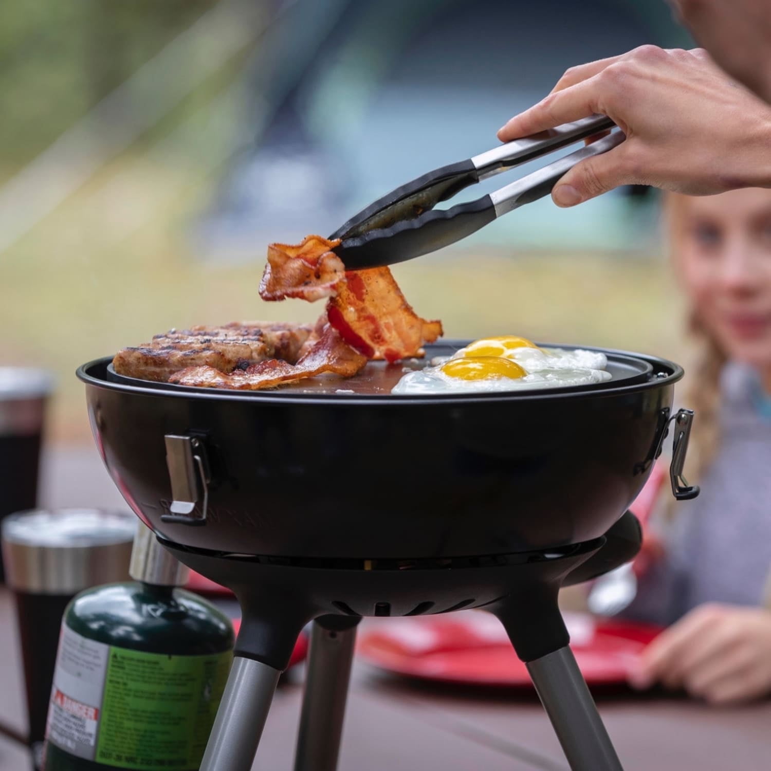 Coleman 4-in-1 Portable Propane Gas Camping Stove, 1 Burner 4-IN-1: Includes 3 inserts (stove, wok, and reversible griddle/grill) for multiple cooking options Cooking Power: Up to 7,000 total BTUs Cooking Area: 100 sq. in. Portable Design With Easy Setup: Removable legs and cooktop inserts fit inside inverted wok for easy storage, locking latches secure contents in transit Easy to Clean: Water tray catches cooking grease Push-Button Ignition: For matchless lighting Fuel: 16.4 oz. propane cylinder (sold separately)