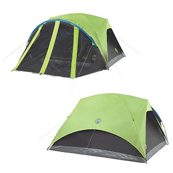Coleman® 4-Person Carlsbad™ Dark Room™ Dome Camping Tent with Screen Room, 2 Rooms, Green DARK ROOM TECHNOLOGY: Blocks 90% of sunlight (vs. a comparable Coleman tent) so you can sleep in past sunrise REDUCES HEAT: For a more comfortable rest anytime of day WEATHERPROOF: Welded corners and inverted seams keep water from getting in; included rainfly offers extra weather protection; strong frame withstands 35+ mph winds STAY CONNECTED: E-Port makes it easy to bring electrical power inside CONVENTIONAL PITCH: Sets up in 10 minutes DIMENSIONS: 9 x 7 ft. with 4 ft. 11 in. center height; fits 1 queen-size air bed 1-YEAR LIMITED WARRANTY