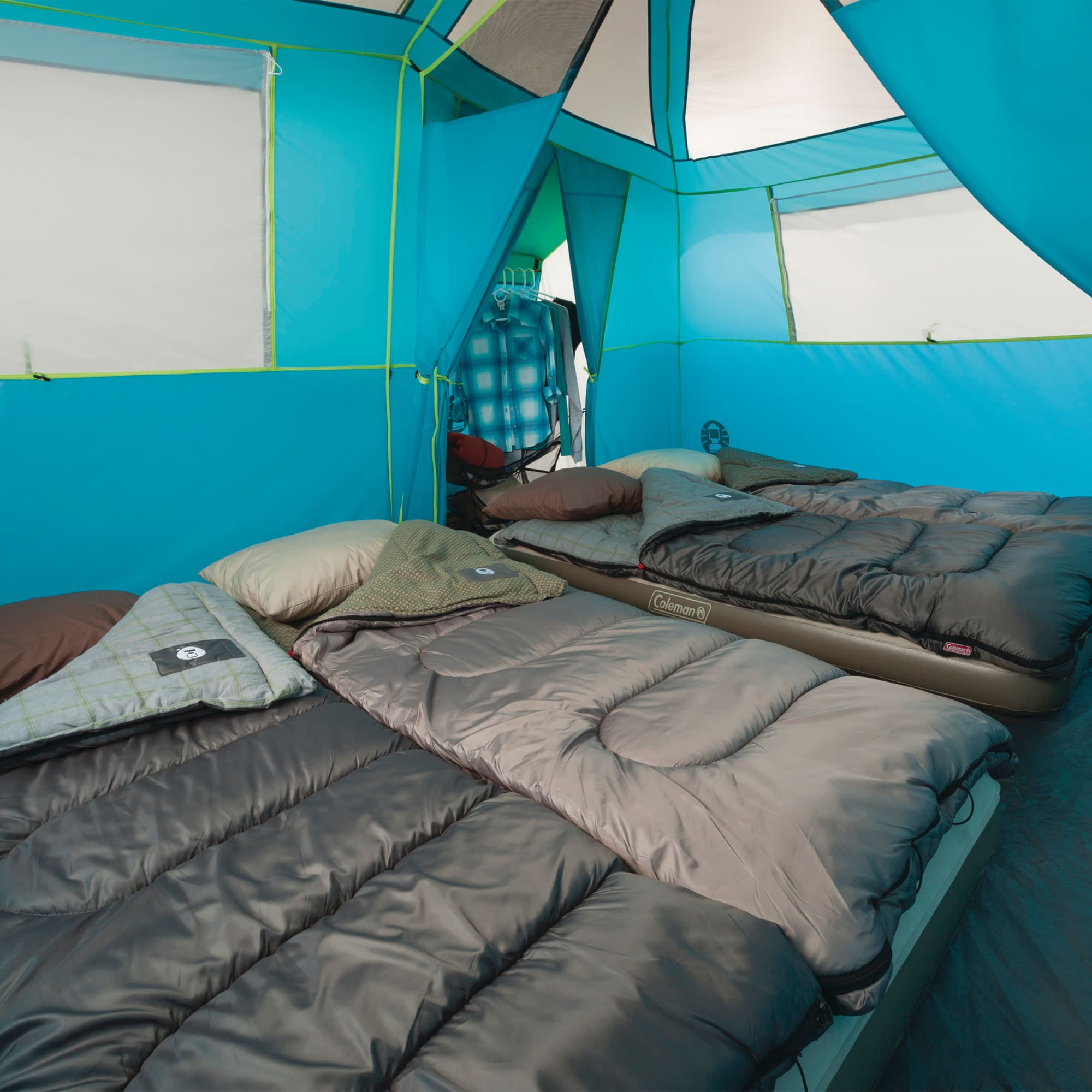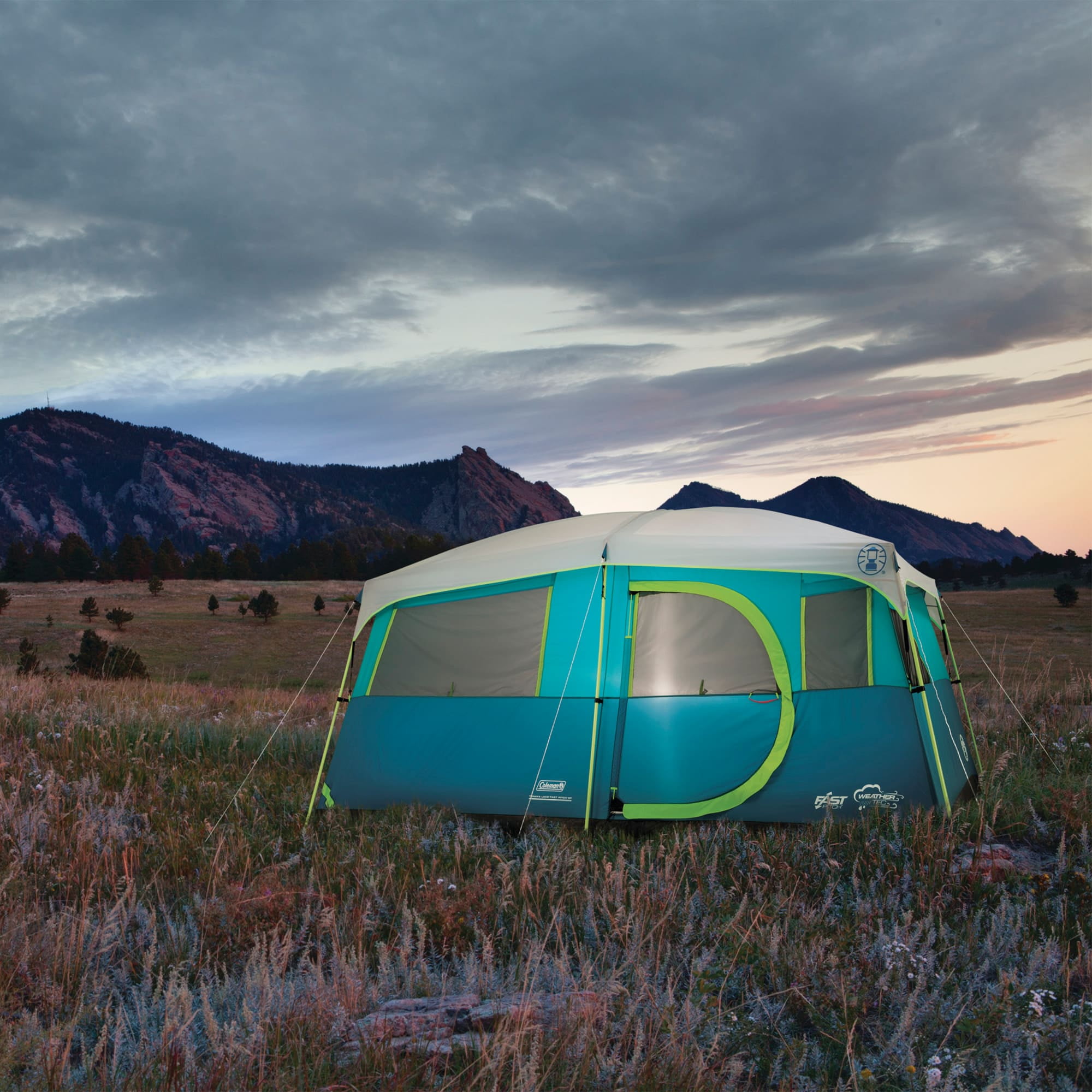WeatherTec™ system’s welded corners and inverted seams keep water from getting in Included rainfly offers extra weather protection Built-in closet with shelves and hanger bar to organize clothes and gear Room divider for added privacy Fast Pitch™ system sets up in minutes thanks to pre-attached, color-coded poles and hub Dimensions: 13 x 9 ft. with 2 x 2 ft. closet Fits 2 queen-size air beds 1-year limited warranty