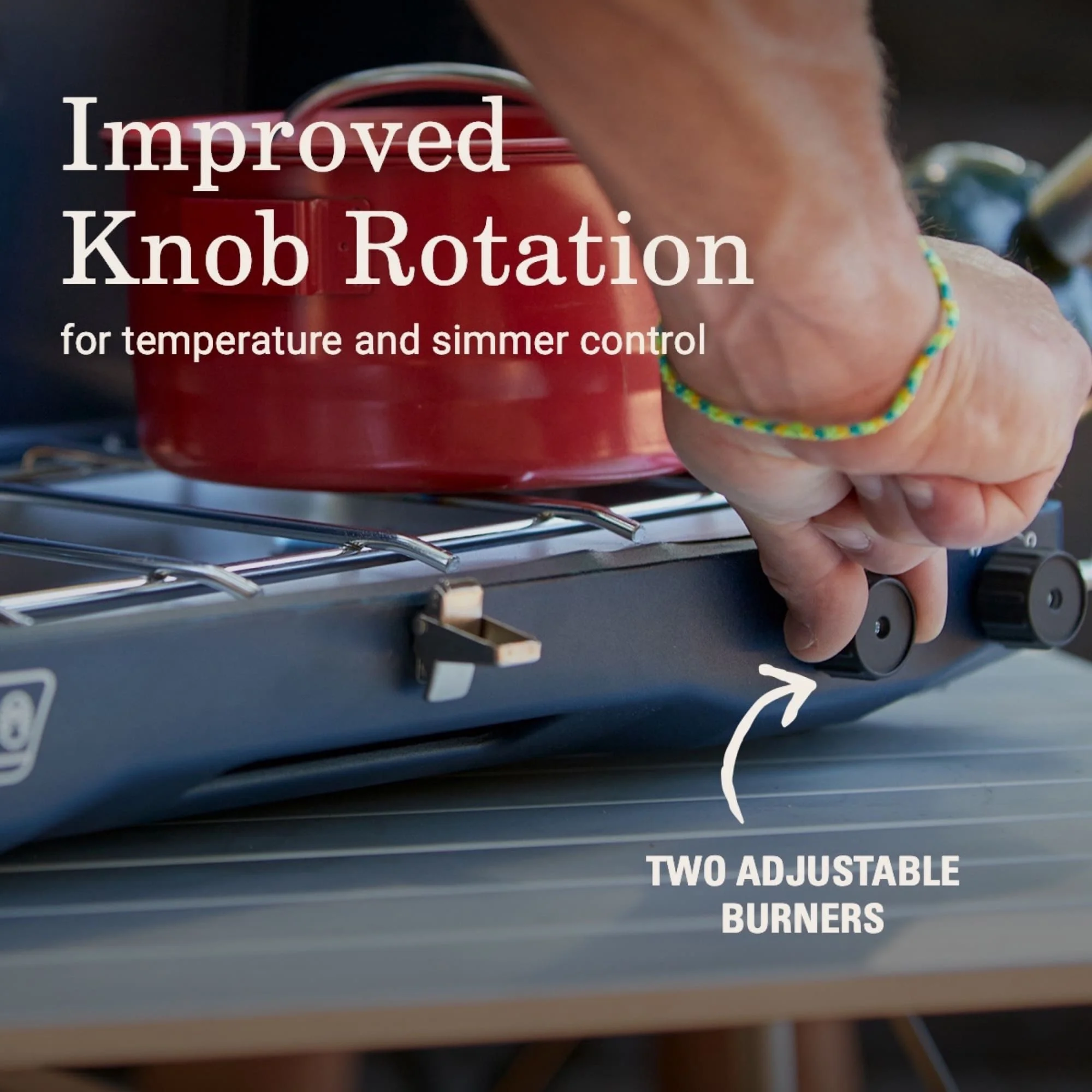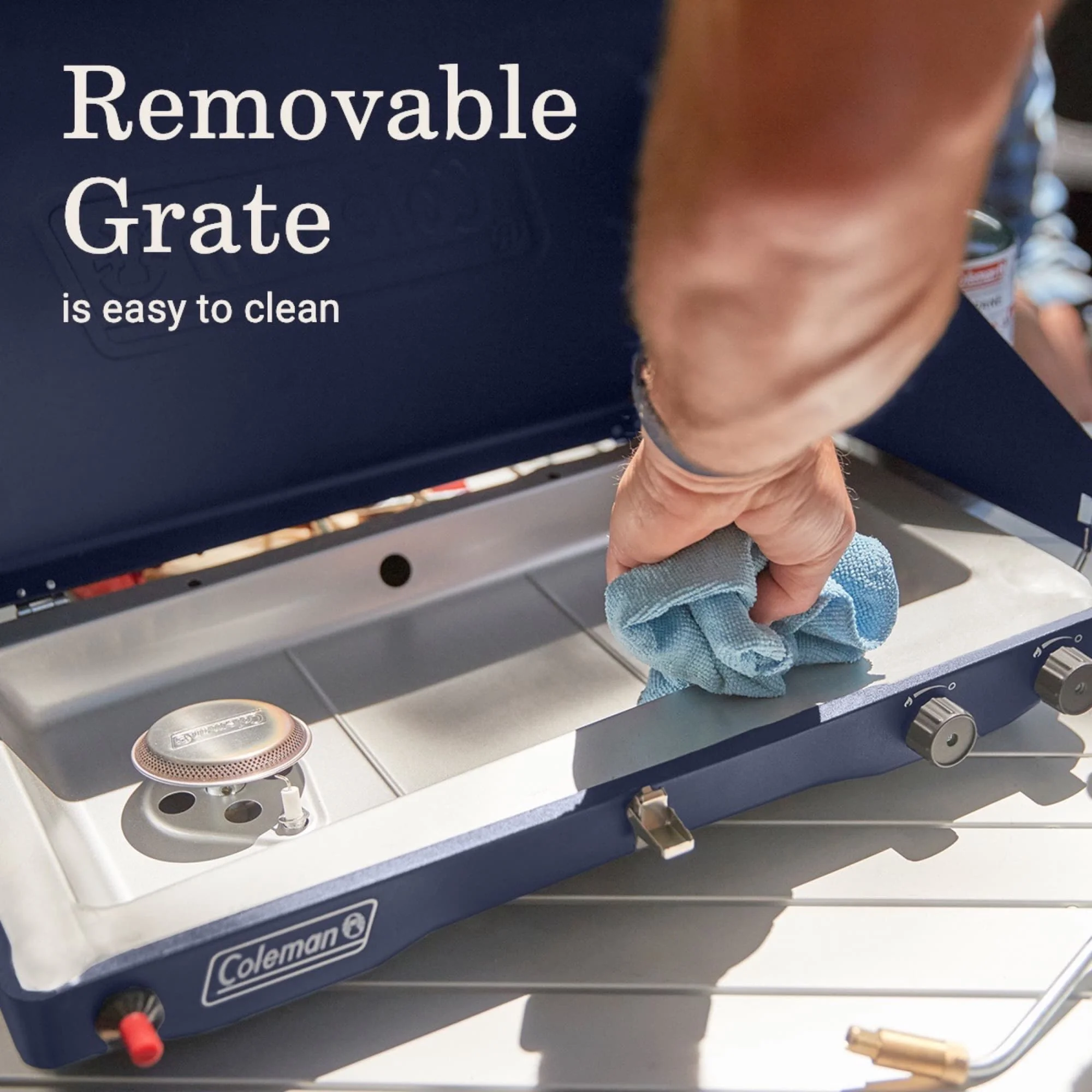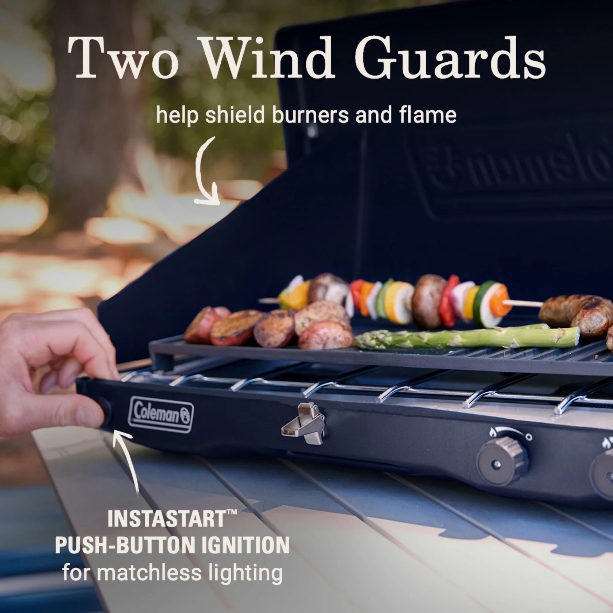 Coleman Classic 3-in-1 Camping Stove Removable cast-iron grill and griddle accessory helps you cook up a variety of seriously good food Compact design and storage space under the lid for accessory makes stove easy to move 2 independently adjustable burners with improved knob rotation for precise temperature control; push-button Instastart™ ignition for automatic, matchless lighting Removable chrome-plated grate for easy cleanup 20,000 total BTUs of cooking power Two wind guards help shield burners and flame from wind Fits 12-inch and 10-inch pan Burns up to 1 hour on high on one 16 oz. cylinder (sold separately)