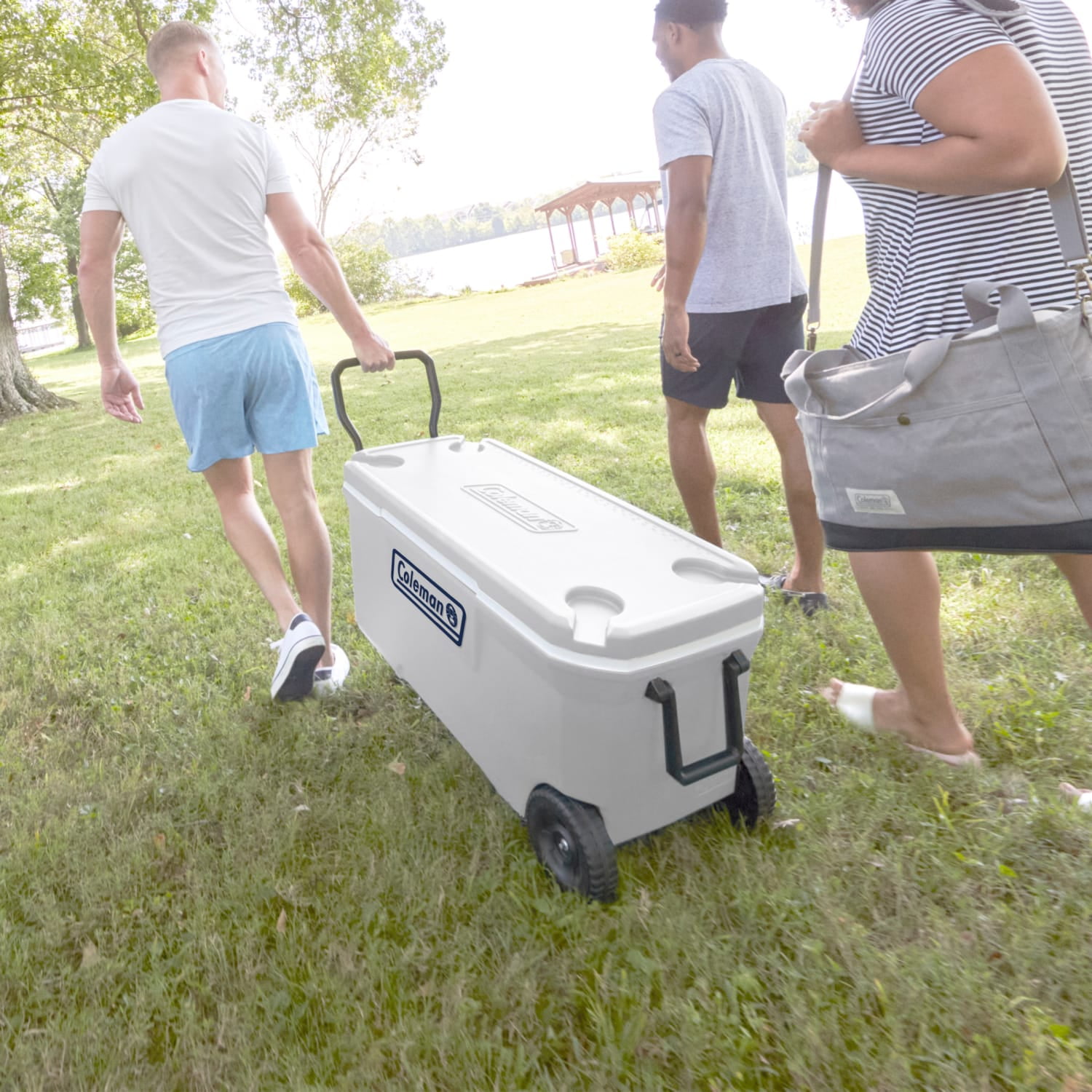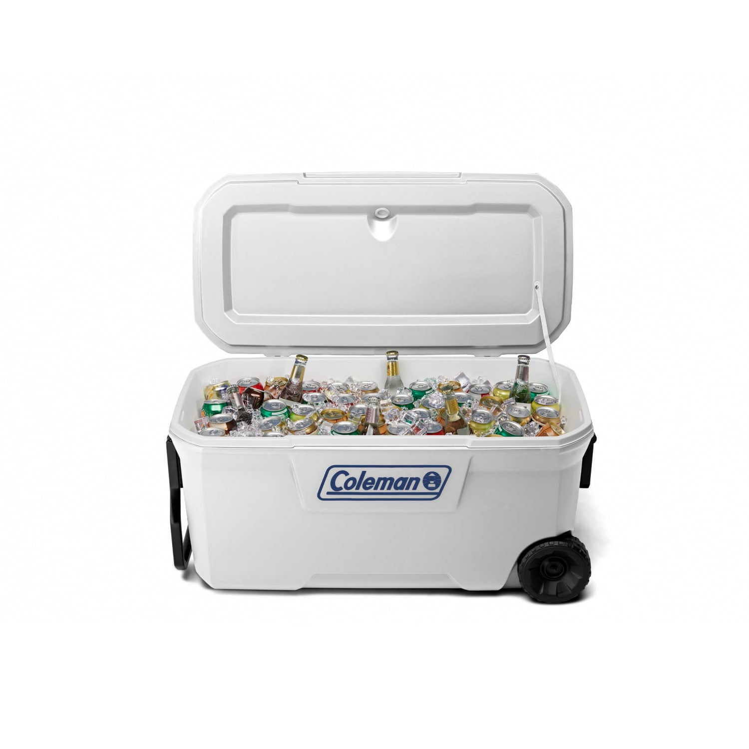 Coleman keeps the Ice up to 5 days with fully insulated lid and body in temperatures as high as 90°F UV coating helps protect the cooler from damaging sun rays Antimicrobial and stain-resistant liner resists odor, mold, and mildew from forming in between uses Rust-resistant stainless steel hardware prevents corrosion and extends life of cooler Heavy-duty 6-inch wheels and durable tow & swing-up handles designed for easy transport Have-A-Seat lid supports up to 250 lbs. Recessed lip for easier access to contents Holds up to 160 cans Cup holders with drain are molded into the lid to keep drinks from spilling; fit up to a 30-oz. tumbler Leakproof channel drain plug Built-in ruler on lid