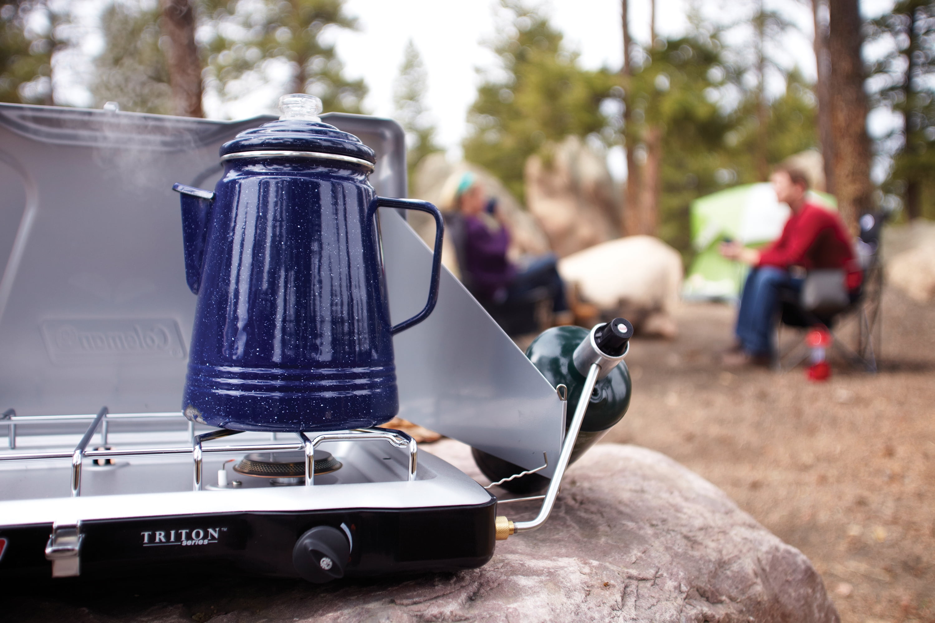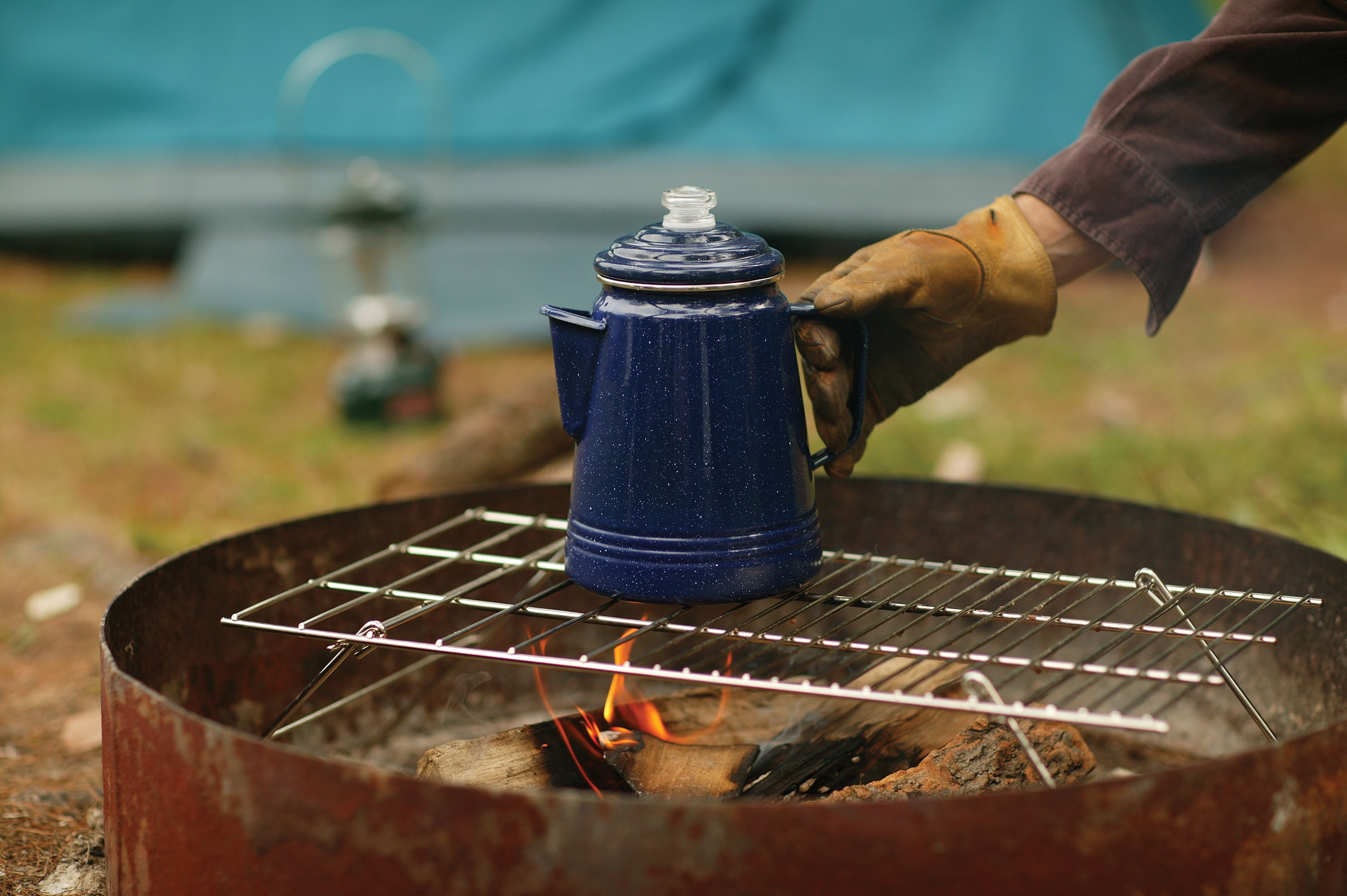 Camping percolator quickly brews up to 14 cups of coffee on a camping stove or grill Comes complete with wide base, tube, basket, and basket lid Lightweight and rugged design ideal for regular outdoor use Double-coated enamel resists cracks and is easy to clean Stainless steel rim prevents chipping for long-lasting use