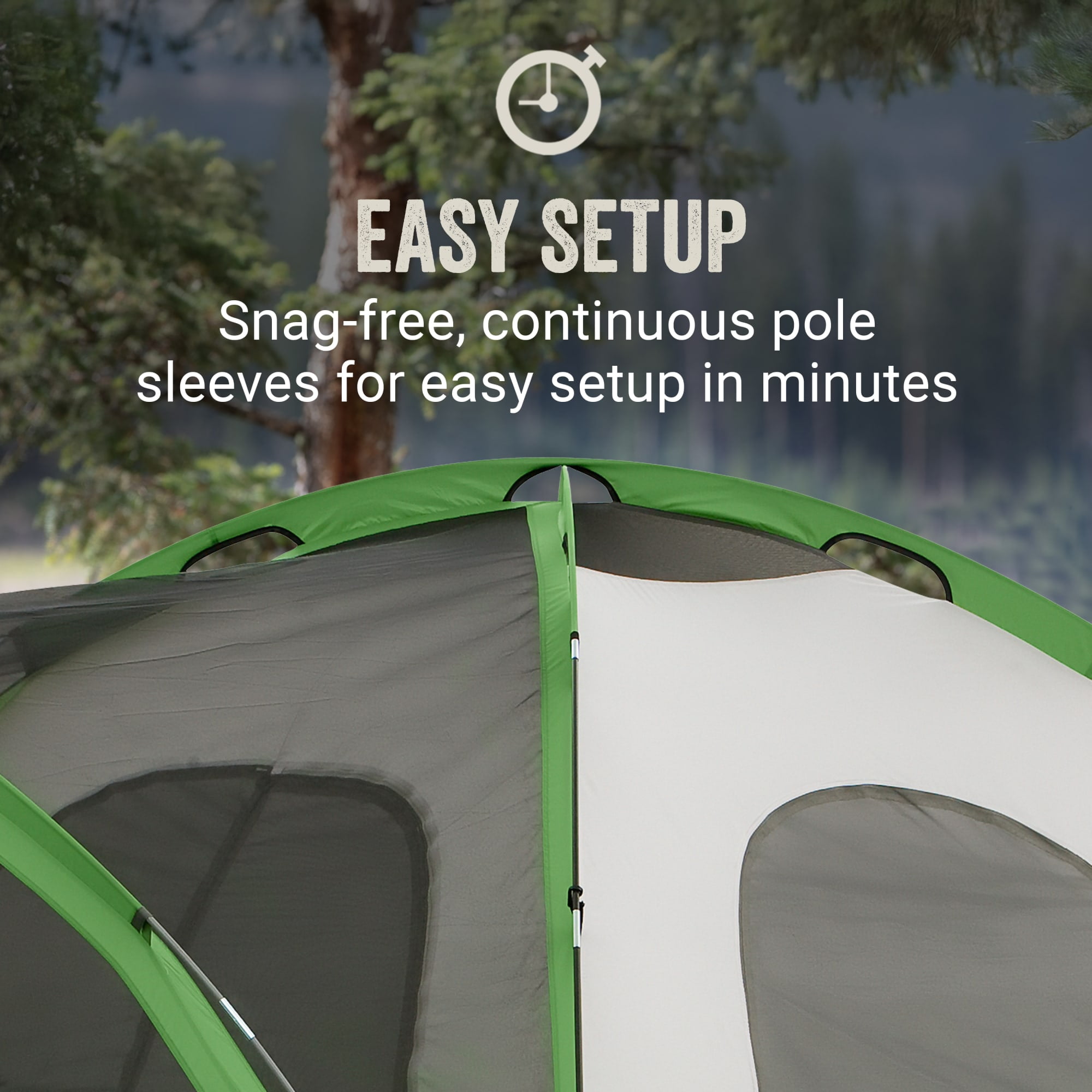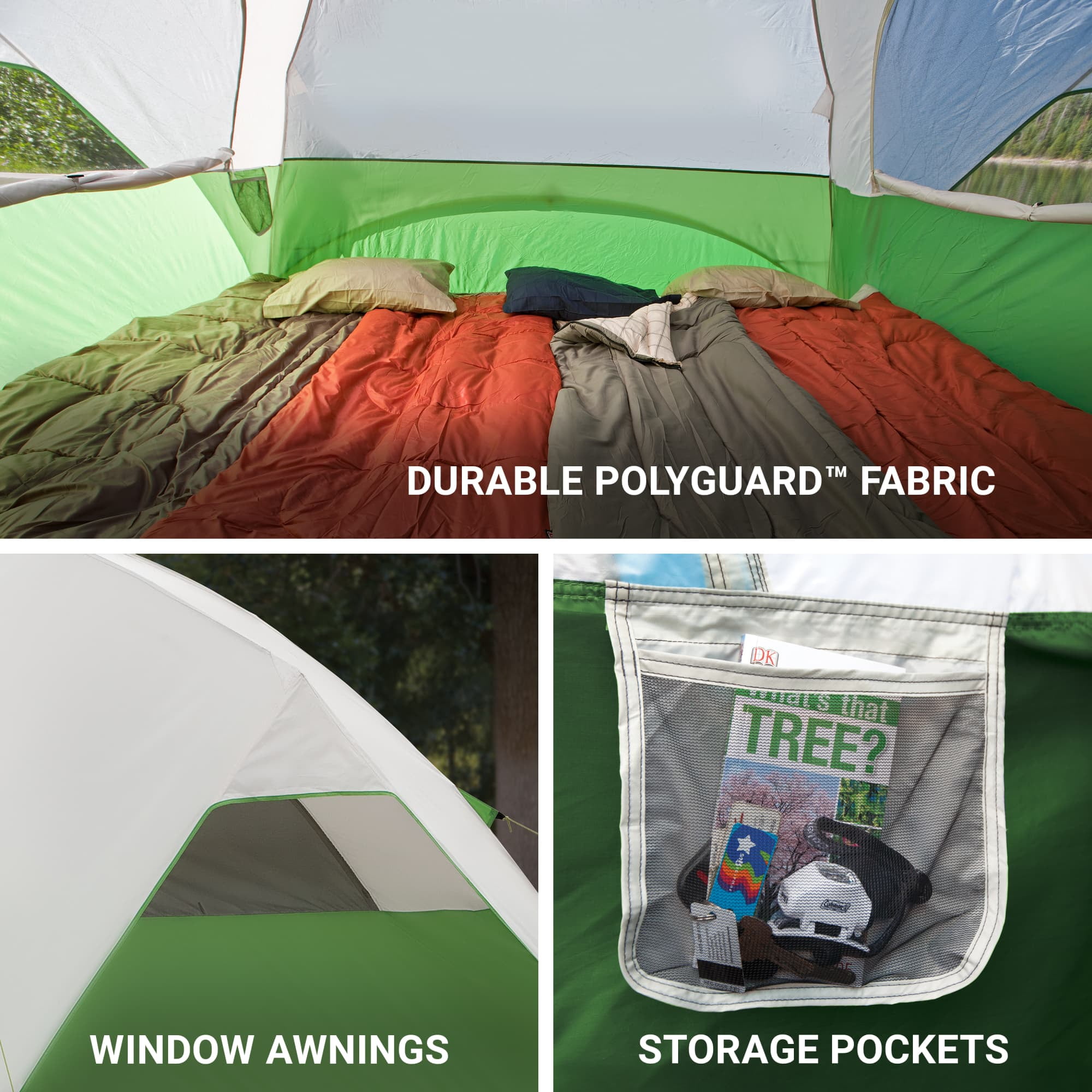 Enjoy everything nature has to offer without worrying about bugs with the Coleman Evanston 6-Person Dome Tent with Screen Room, 2 Rooms, Green. Great for car camping and extended camping trips, this outdoor tent has a separate floored screen room that offers extra ventilation and protected storage and can be slept in on warmer nights. This camping tent is designed with the WeatherTec system that features patented welded floors and inverted seams to keep the rain off you and your gear and comes with a rainfly for extra weather protection. Extended awnings let you keep the windows open for enhanced air circulation without letting water in. This backpacking tent offers enough room for two queen size air beds and comes with storage pockets to help you keep small items organized. Featuring a durable frame that can withstand 35+ mph winds and rugged Polyguard 2X double-thick fabric, this 6-person tent will last season after season. It sets up in about 15 minutes thanks to snag-free continuous pole sleeves, a patented pin-and-ring system, and snag-free Insta-Clip suspension. And when itâ’s time to go home, the tent packs away securely in the included carry bag.