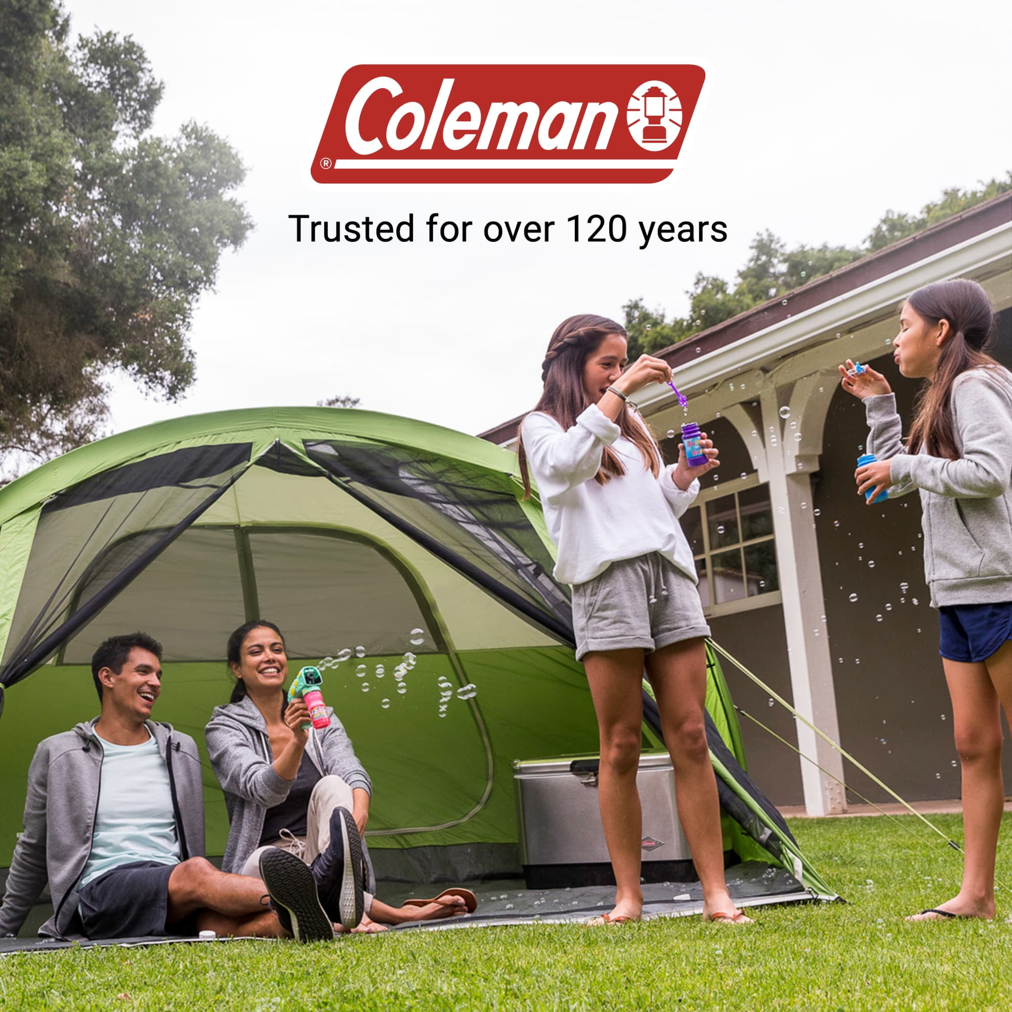 Coleman Evanston 6-Person Dome Tent with Screen Room, 2 Rooms, Green Spacious 6-person tent has enough room for 2 queen size air beds Separate screen room offers bug-free lounging WeatherTec system with patented welded floors and inverted seams to keep you dry Measures 10 x 9 feet with 5-foot 8-inch center height; screen room is 10 x 5 feet Sets up in 15 minutes with rainfly and carry bag included