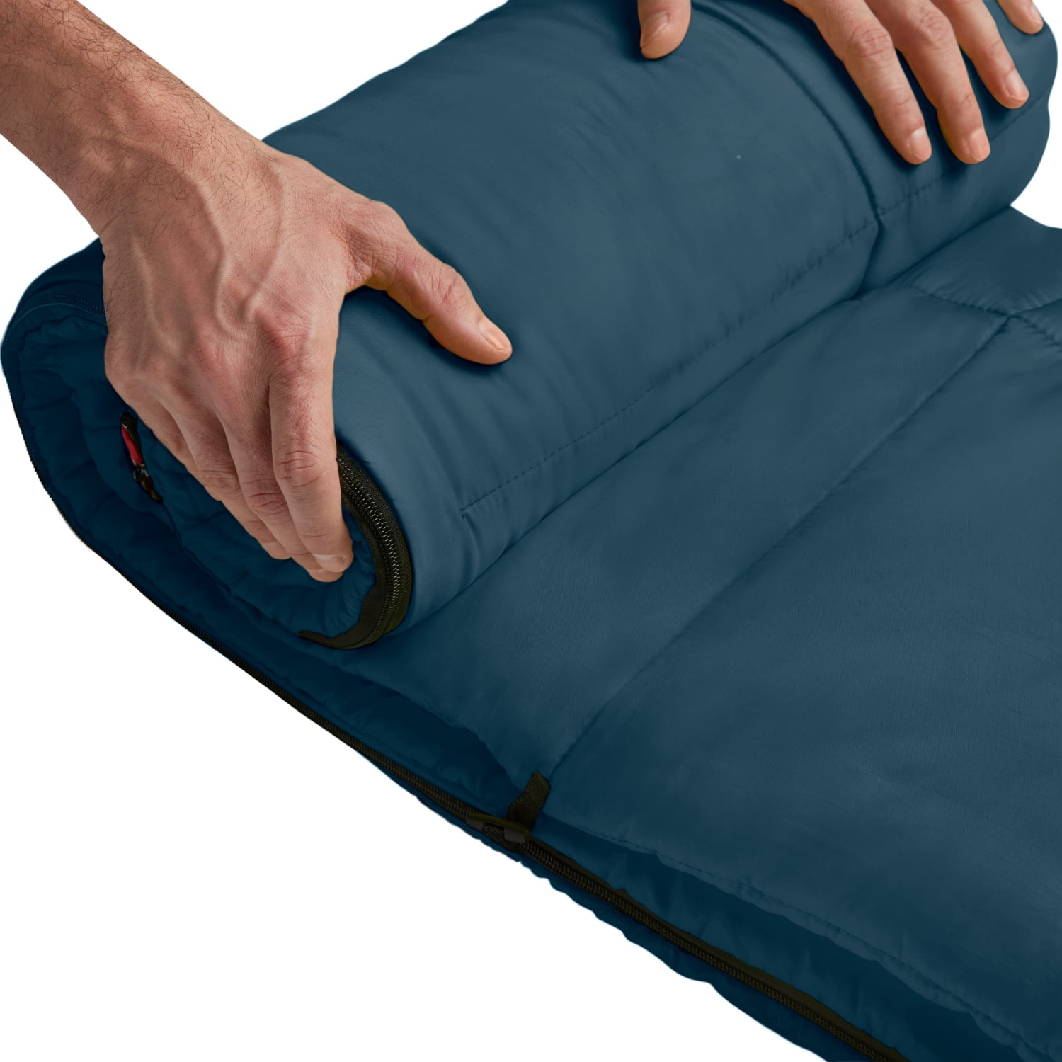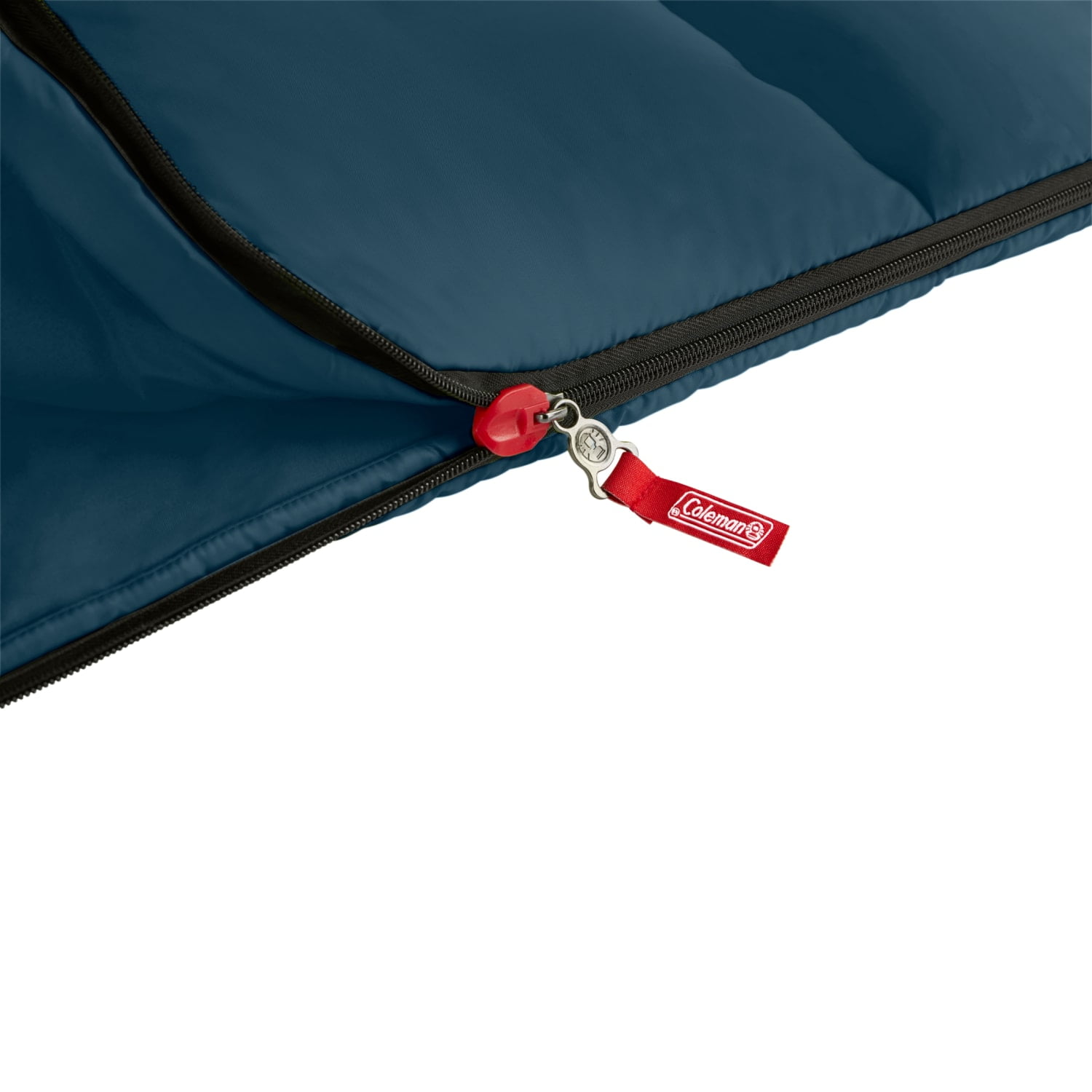 Stay warm in temperatures as low as 40 degrees Coletherm™ Max premium and lightweight fill provides better heat retention with less weight and allows bag to pack easily into stuff sack Compressible stuff sack with side straps that can be cinched to compress the bag; compact size packs up smaller than traditional Coleman® sleeping bags (9.4 x 9.4 x 18.1 in.) Contour shape keeps your head and pillow off the floor Big & tall size fits campers up to 6 ft. 5 in. Thermolock™ draft tube prevents heat loss through the zipper ZipPlow™ patented zipper for snag-free opening and closing Comfort Cuff™ patented design provides soft protection and comfort around face Roll Control™ patented design keeps your bag straight while rolling it up Quick Cord™ easy tying system secures bag once rolled Dimensions: 84 x 39 in. Machine washable for easy cleaning 5-year limited warranty