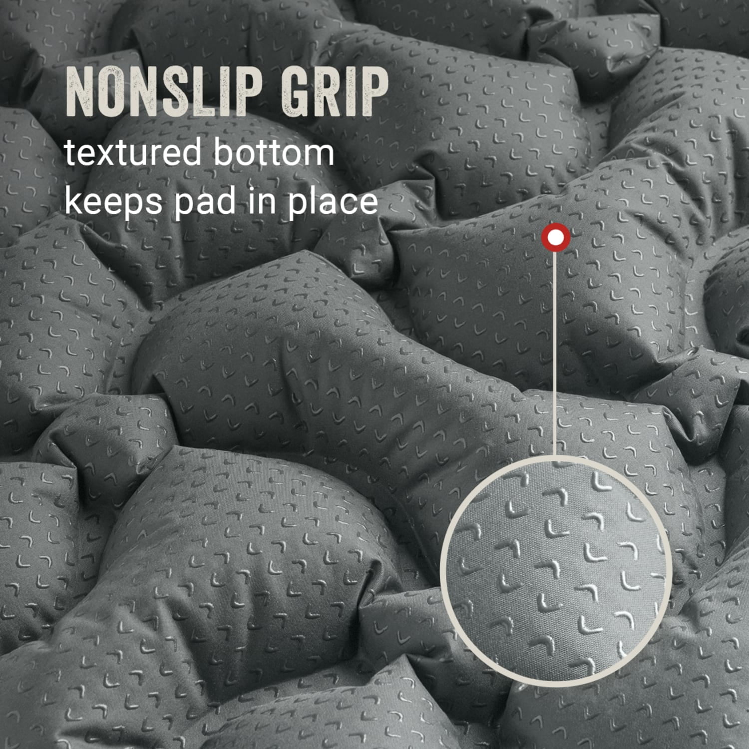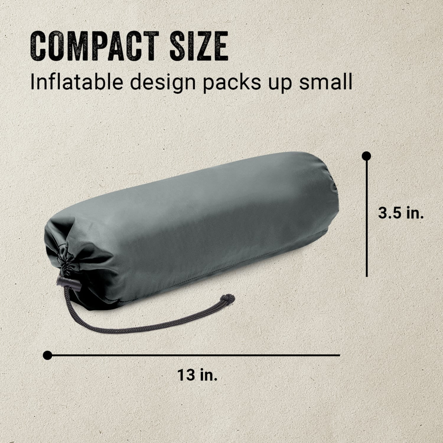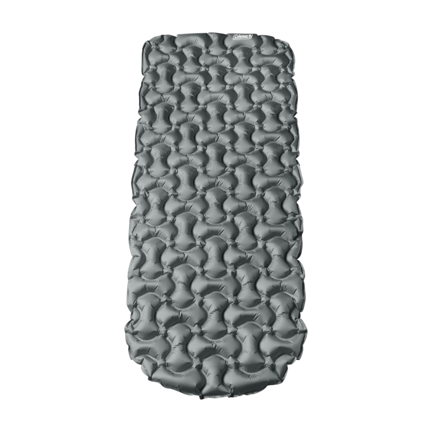 Compact pack size with inflatable design allows pad to pack up smaller (13 x 3.5 in.) than traditional Coleman® camp pads No pump needed—pad inflates in 20 breaths or less No-slip grip textured bottom keeps camp pad in place Nested valve is located on the underside of the pad for a comfortable sleep surface Convenient carry bag makes it easy to carry and store the pad Dimensions: 72 x 28 x 2.5 in. when pad is inflated 1-year limited warranty