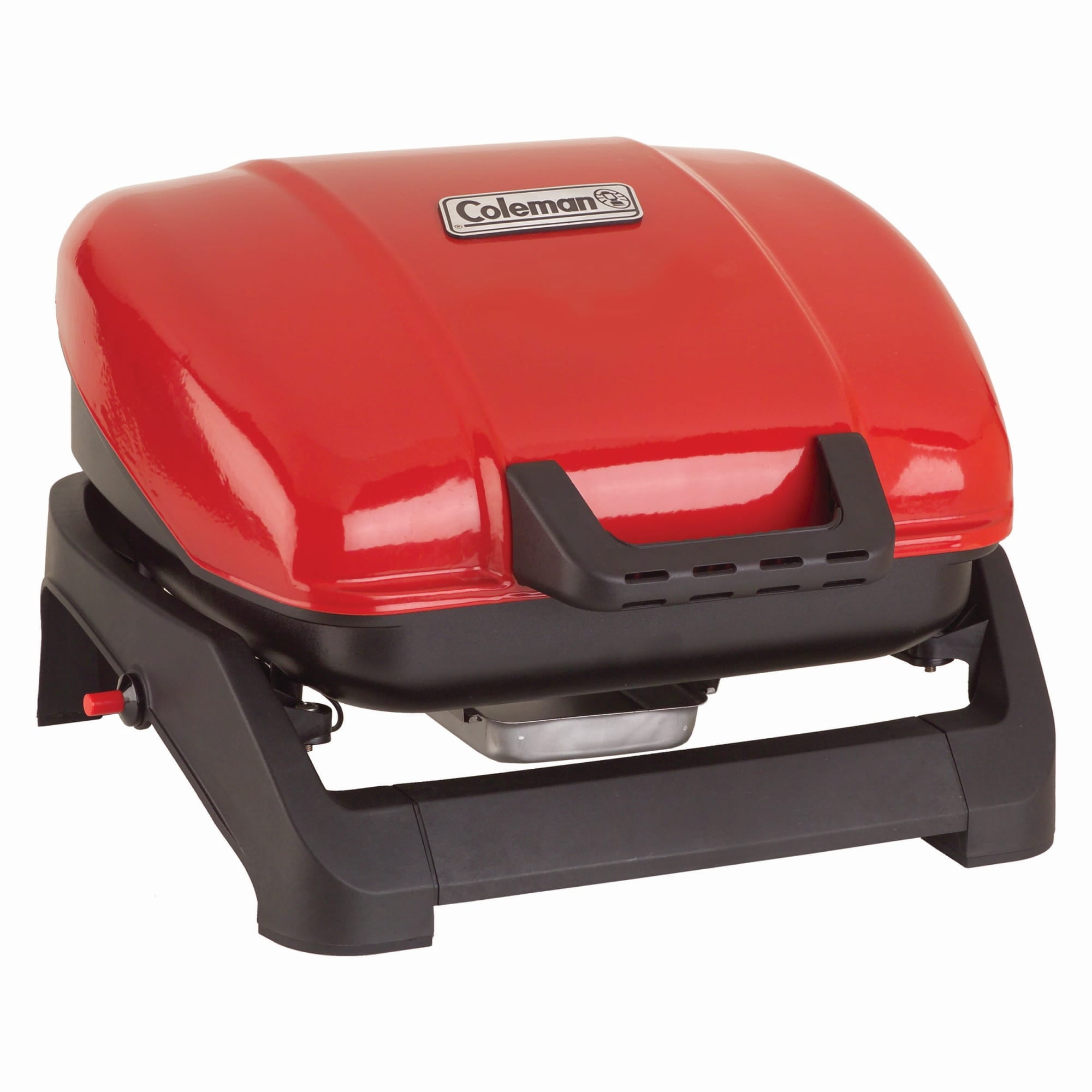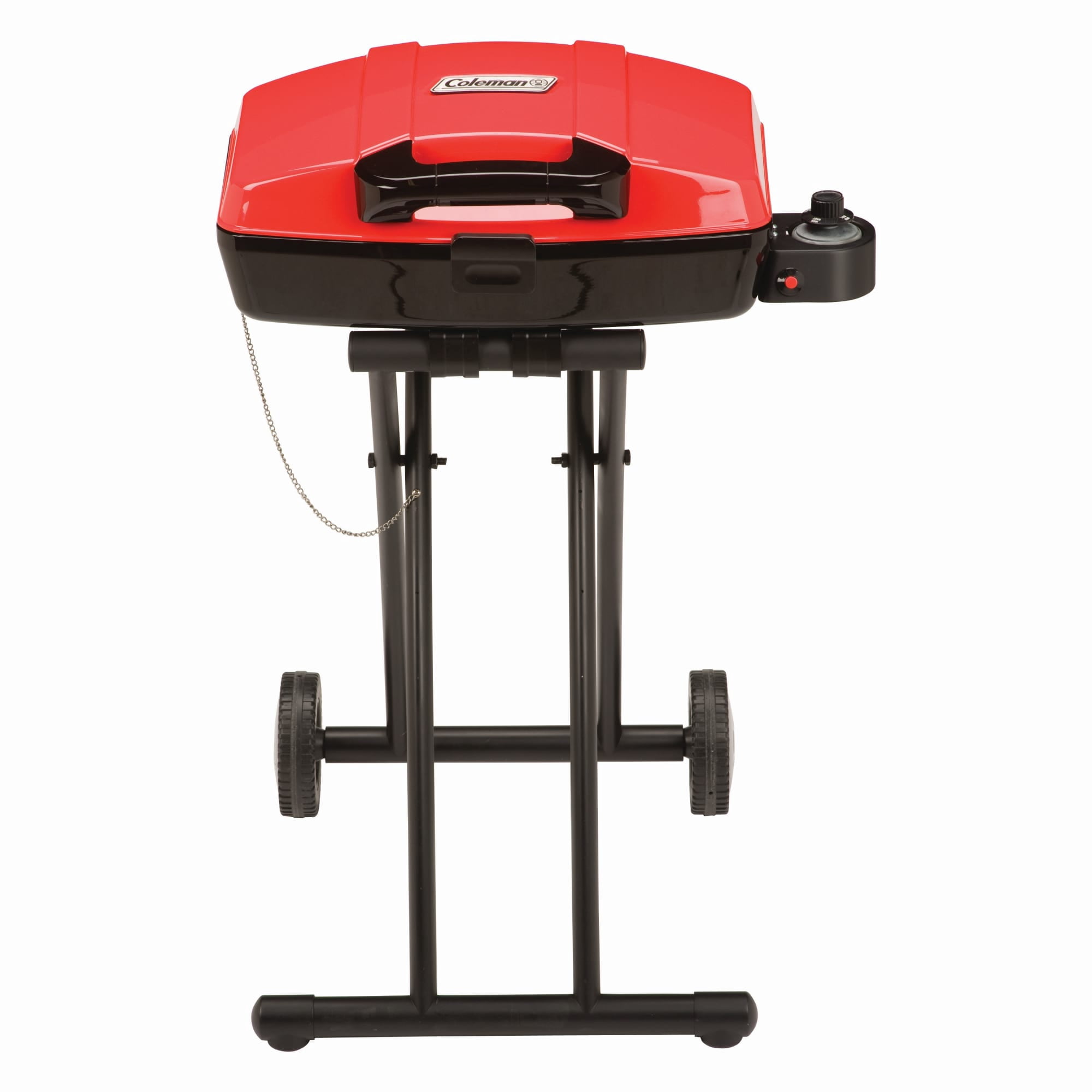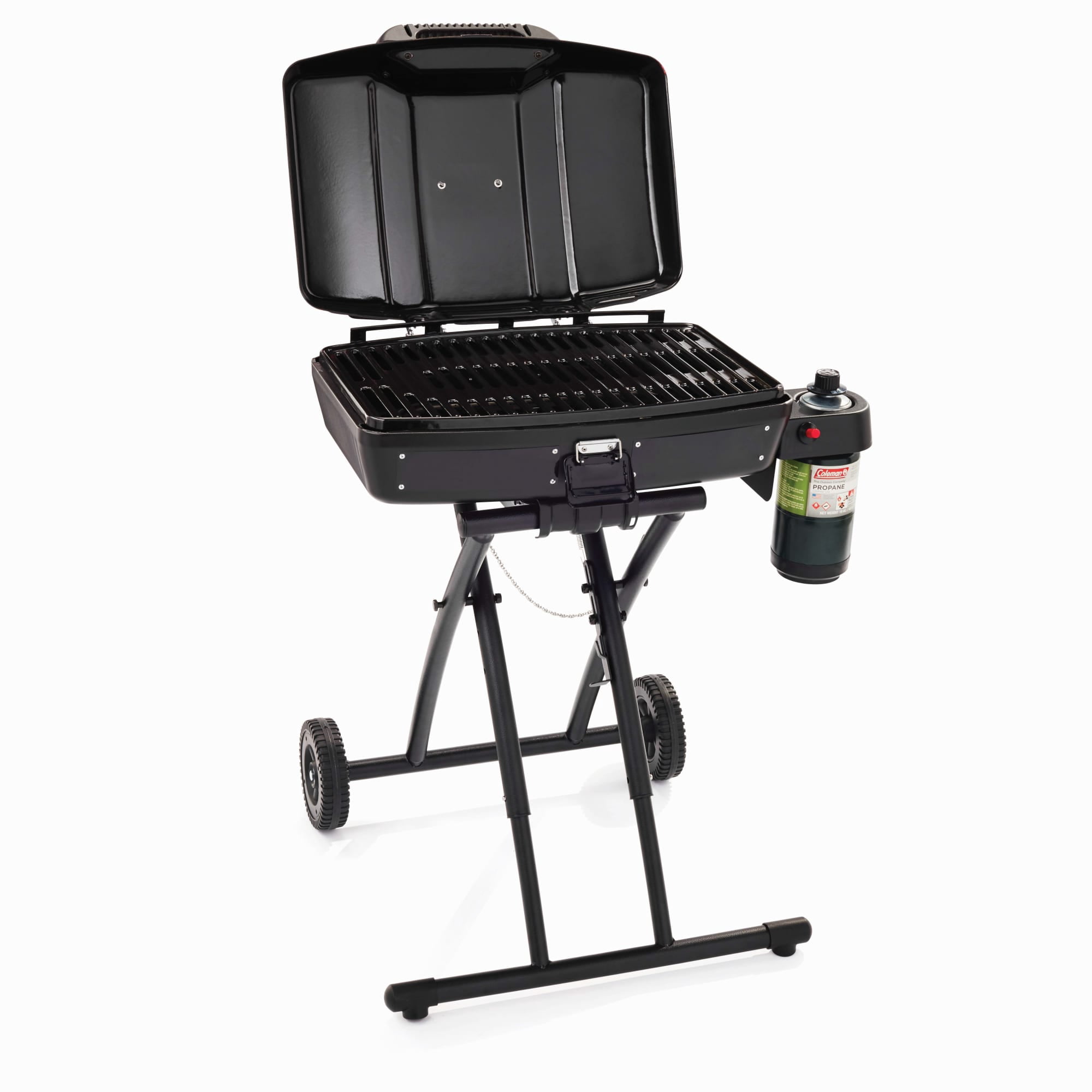 Portable Coleman Sport Roadtrip Propane Grill: 11,000 BTU Porcelain-coated, stamped-steel grate Wheeled stand for easy transport Lift and lock system Insta-start push button ignition Removable tray collects grease while you cook Coleman propane grill is collapsible