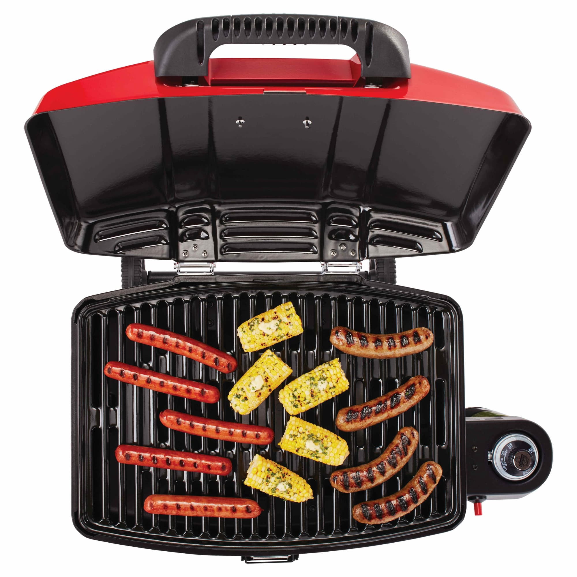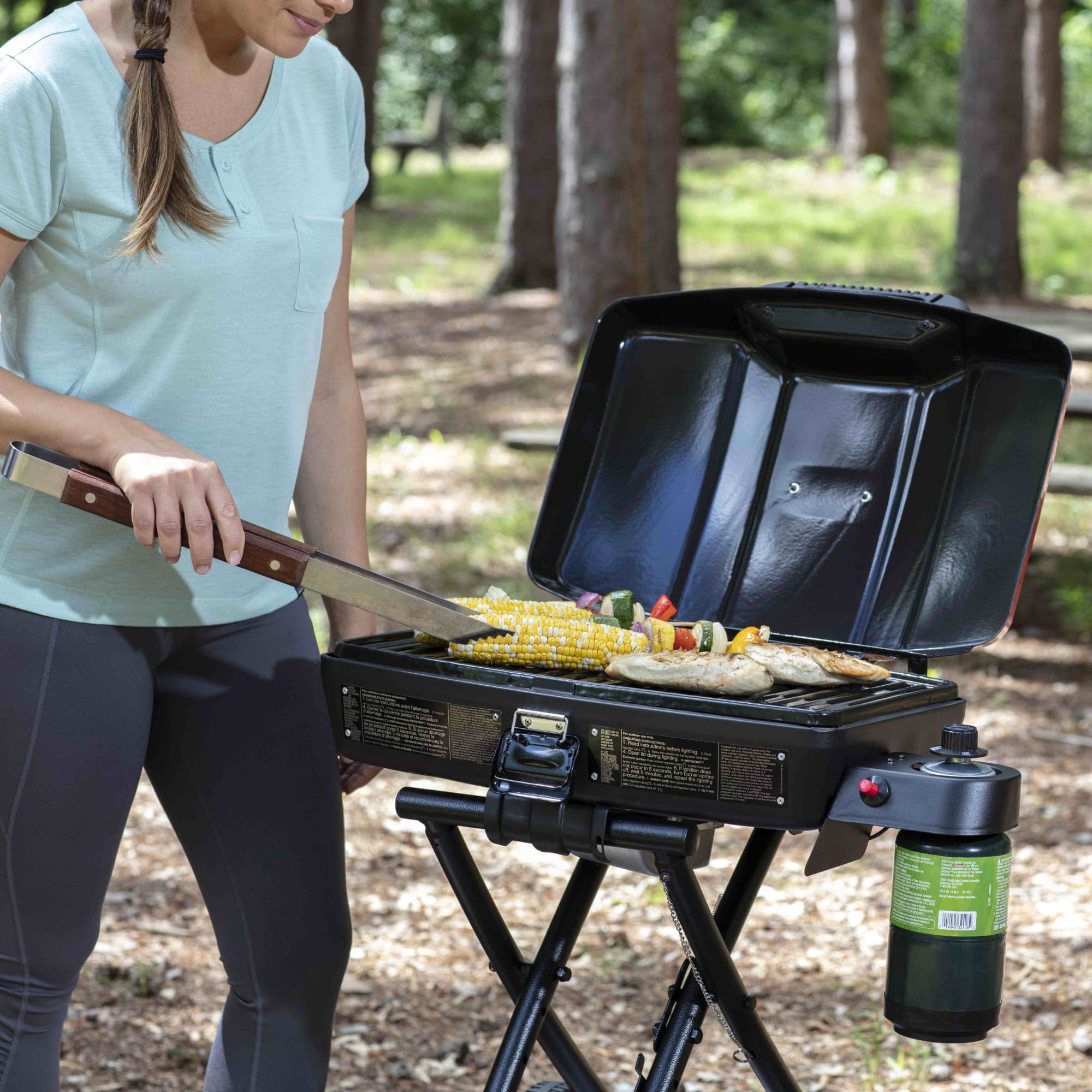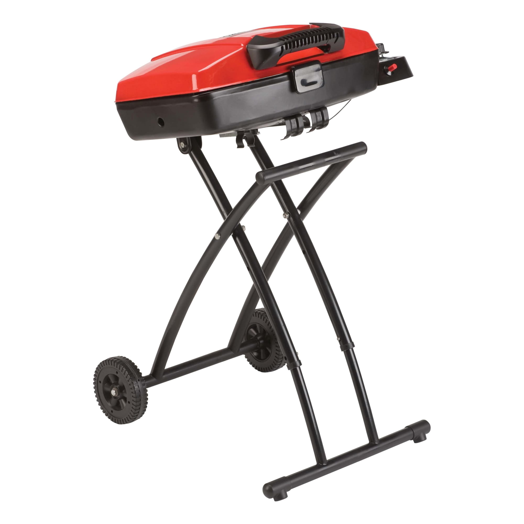 Portable Coleman Sport Roadtrip Propane Grill: 11,000 BTU Porcelain-coated, stamped-steel grate Wheeled stand for easy transport Lift and lock system Insta-start push button ignition Removable tray collects grease while you cook Coleman propane grill is collapsible