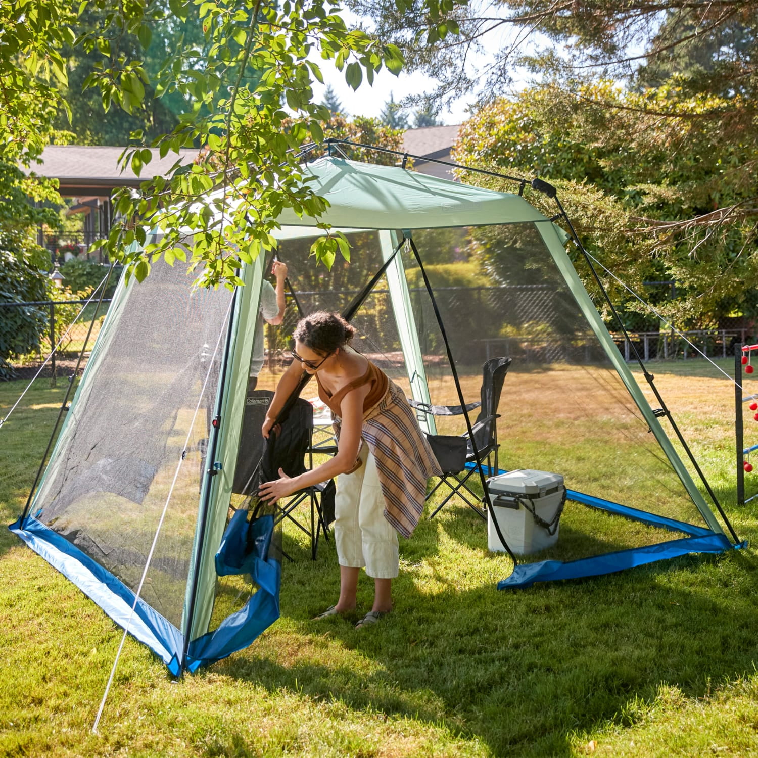 Coleman Skylodge 10 x 10 Instant Screen House Sets up in 1 minute with lightweight hub, attached telescoping poles, and pinch-free buttons Bug-free lounging: Enclosed mesh walls with 2 entryways makes it easy to bring gear in and out UPF 50+ sun protection helps block sun’s harmful UV rays; shade area is 30.2 sq. ft. Carry bag for easy transport Dimensions & Weight: 10 x 10 ft; 7 ft. center height; 6 ft. entry height, 14.9 lbs. 1-year limited warranty