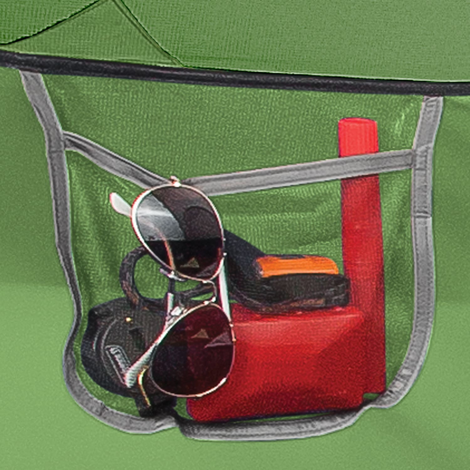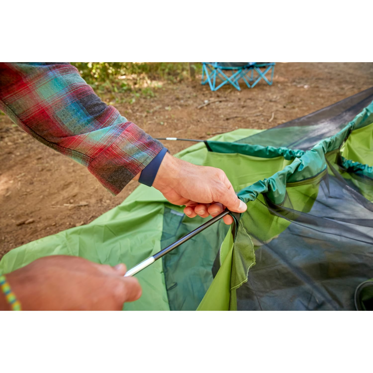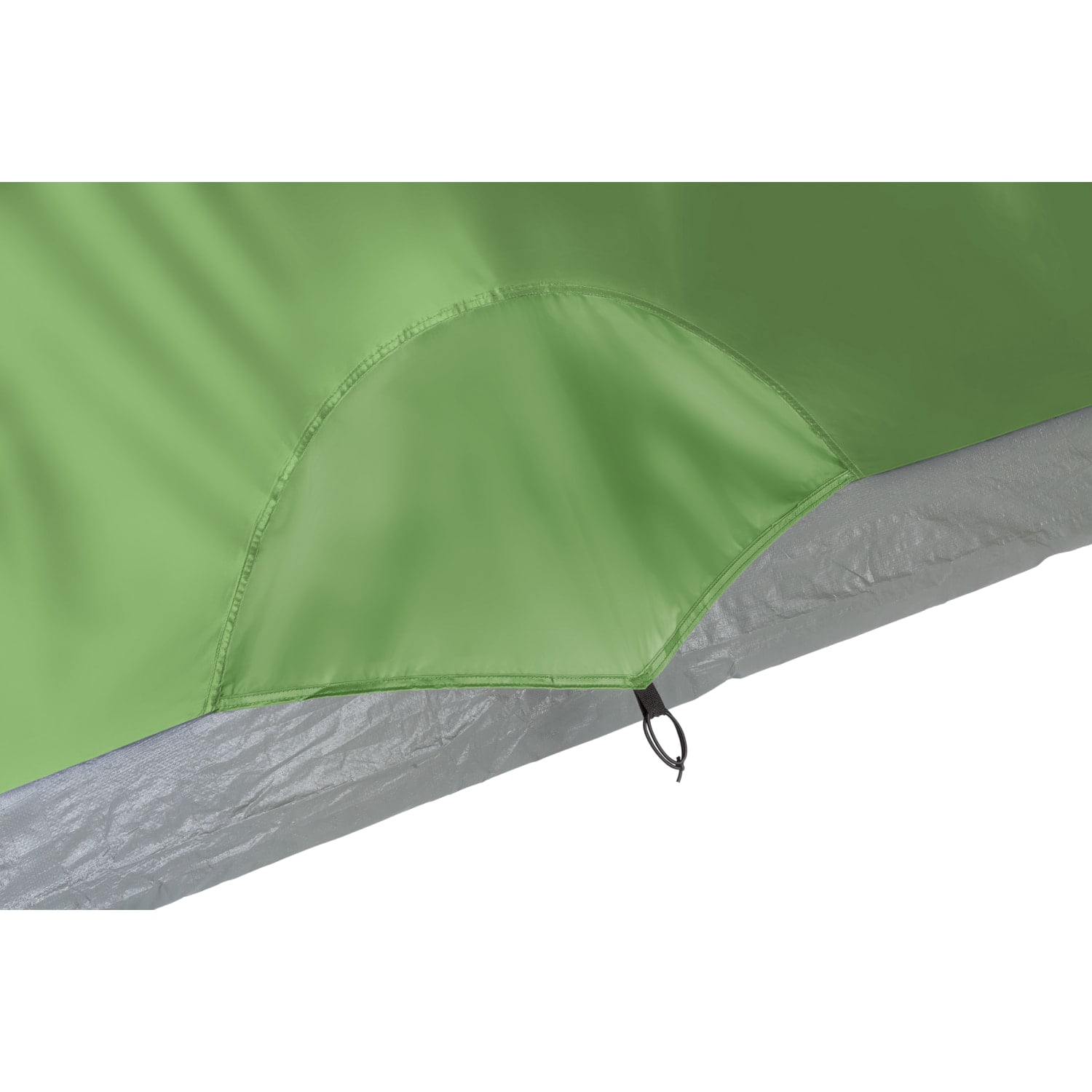 WeatherTec™ system’s tub-like floor, welded corners, inverted seams and taped seams on rainfly and tent body help keep water from getting in; strong frame has been tested to withstand up to 35 mph winds Easy to set up using snag-free, continuous pole sleeves 2 windows and 1 ground vent allow for cool air to flow in and hot air to flow out. E-Port makes it easy to bring electrical power inside 2 awnings offer additional weather protection over front door and back window Gear pockets keep small items stored away and organized Dimensions: 9 x 7 ft. with 4 ft. 11 in. center height; fits 1 queen-size airbed 1-year limited warranty