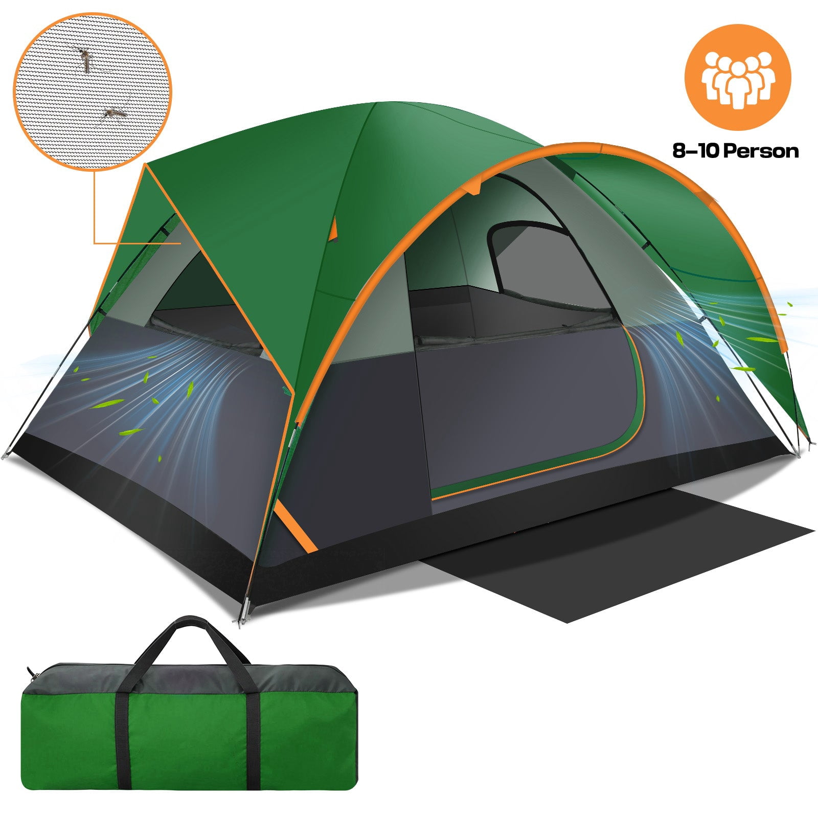 Spacious 6 person tent sets up in under 5 minutes with pre-attached poles Nearly vertical walls offer 20-percent more headroom space than traditional dome tents WeatherTec system features welded corners and inverted seams to help keep your gear dry Strong frame has been tested to withstand up to 35 mph winds Wider door makes it easier to move air beds, sleeping bags, and other gear in and out of the tent Includes a mesh storage pocket and a gear loft to keep small items organized Fits 2 queen-size air beds Carry bag included for easy storage Center height: 6 feet Dimensions (L x W): 10 feet x 8 feet 6 inches Weight: 16.3 pounds Manufacturer warranty: 1-year warranty
