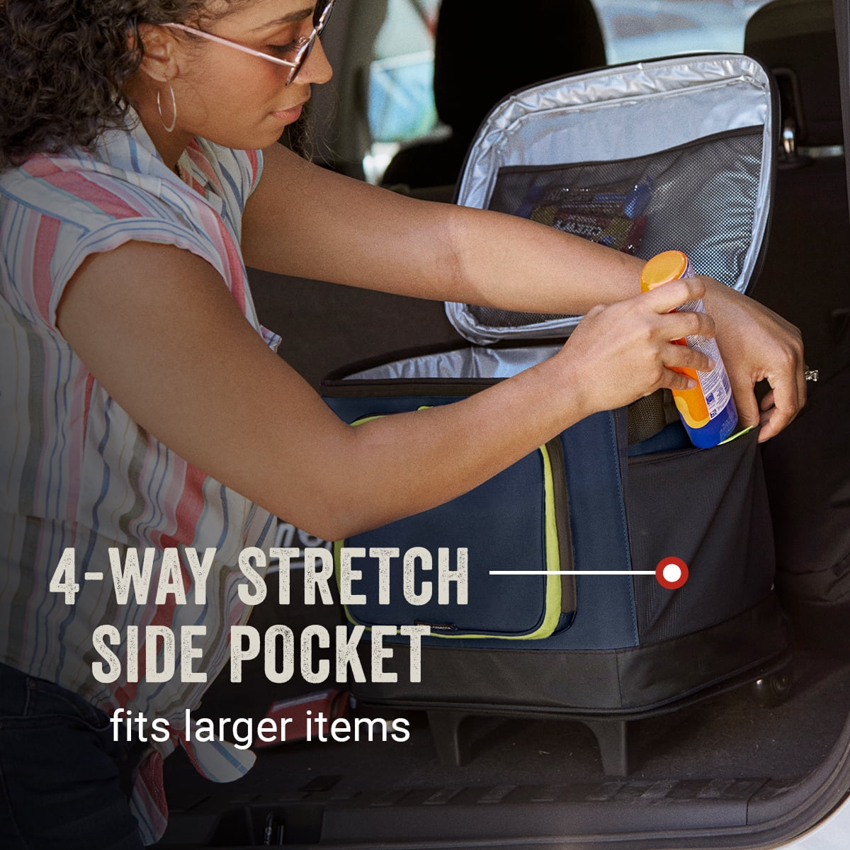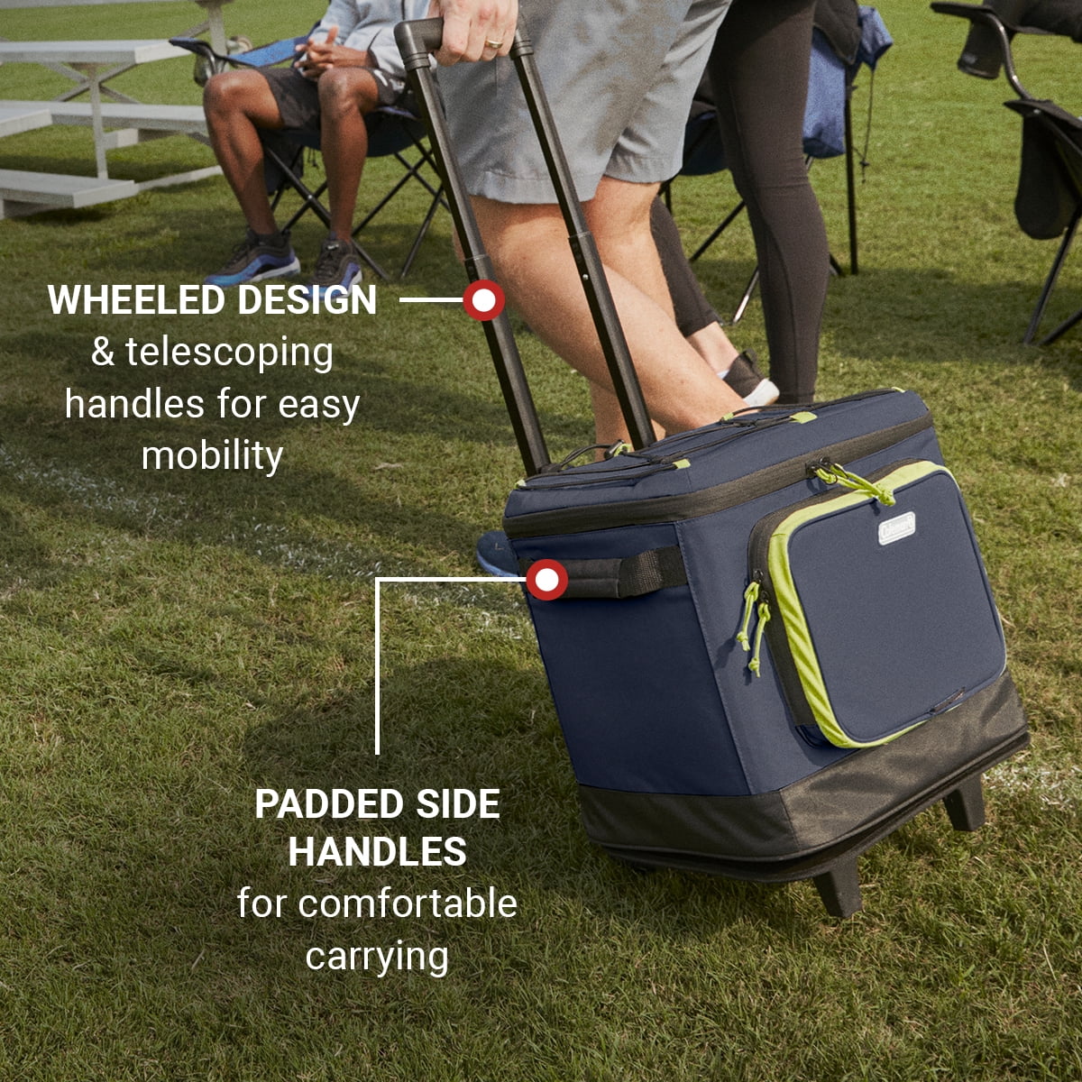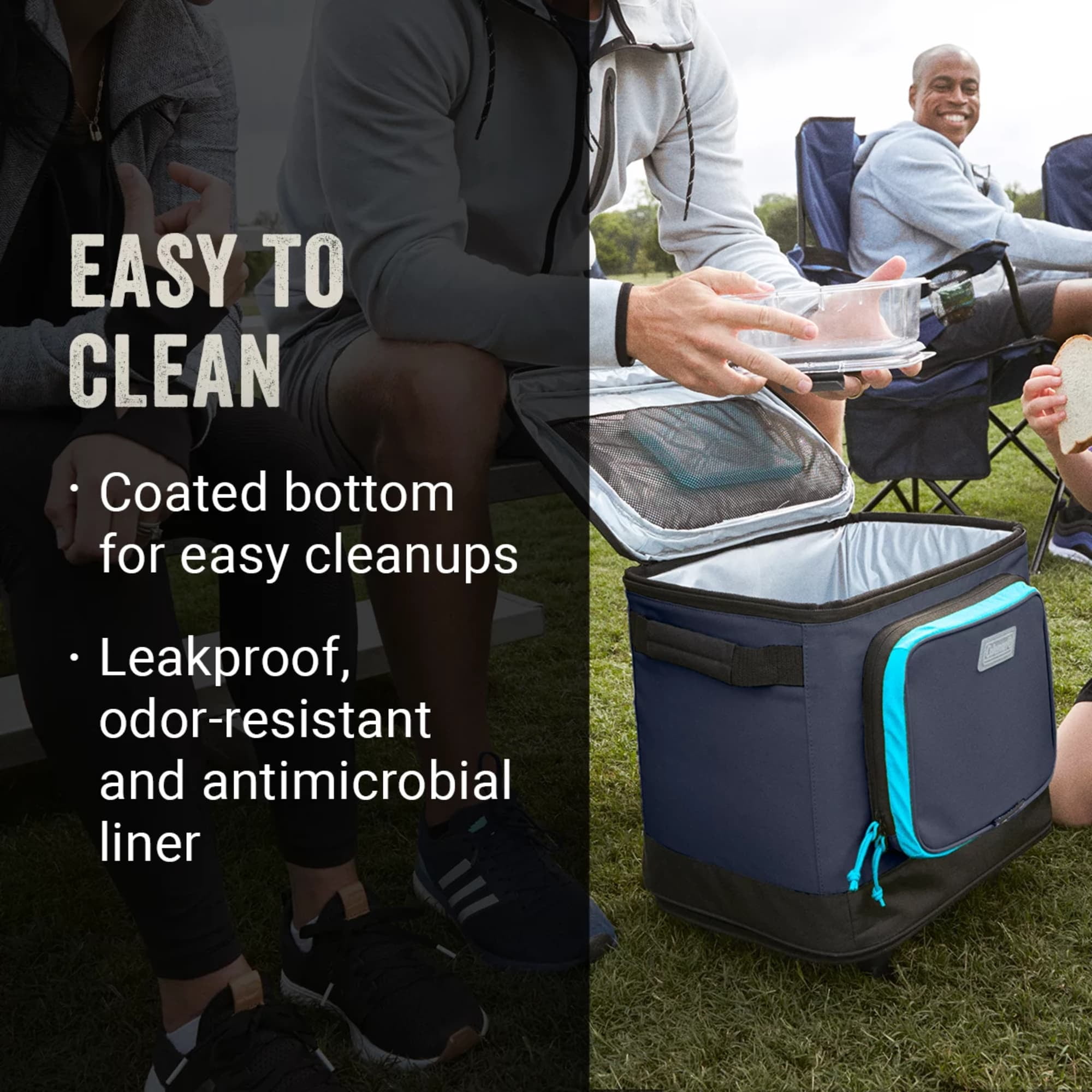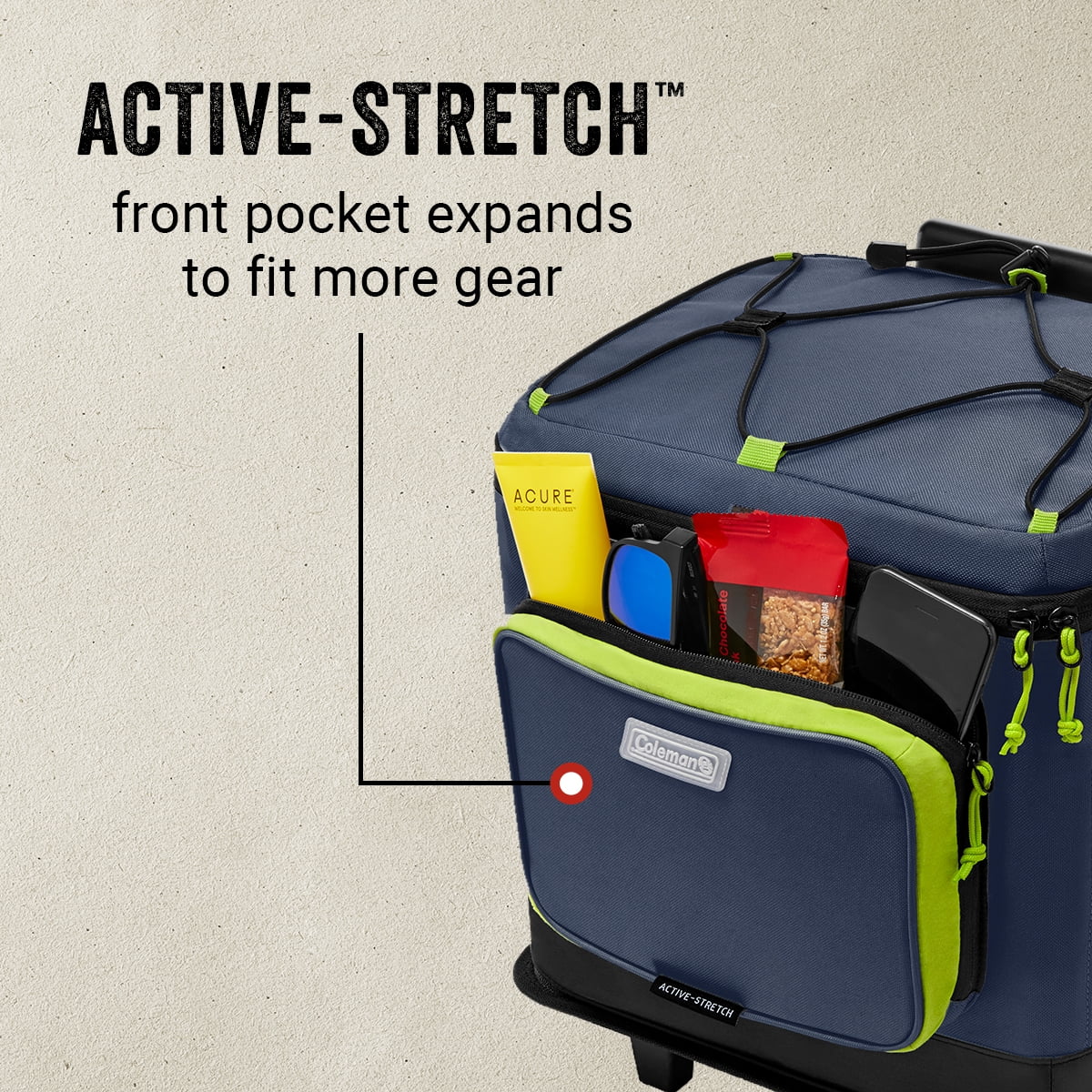 Coleman XPAND 42 cans Soft Thermocooler with Wheels, Spider Mum Blue Active-Stretchâ„¢ front pocket expands so you cans pack more gear throughout the day such as phone, keys, or wallet 4Way stretch side mesh pocket easily fits a water bottle Wheeled design and telescoping handle for easy pulling across different terrain Padded handles for comfortable carrying Welded seams and coated bottom make cleanup easy Bungee cord for additional storage such as a blanket, towel, or jacket Insulated to keep food and drinks cold up to 34 hours Antimicrobial liner helps prevent odor, mildew, mold, and fungus from forming; heat-welded seams prevent leaks Holds up to 42 cans