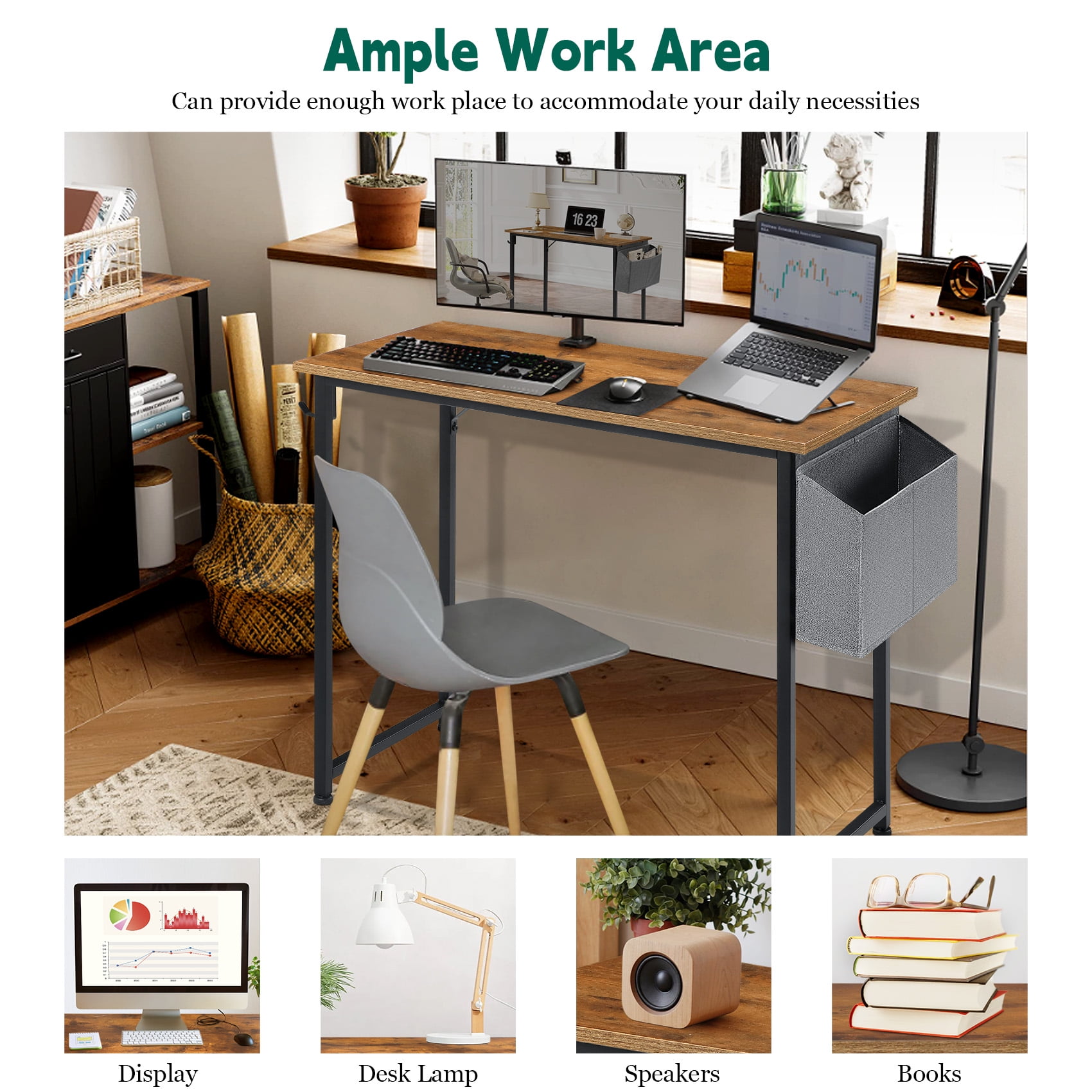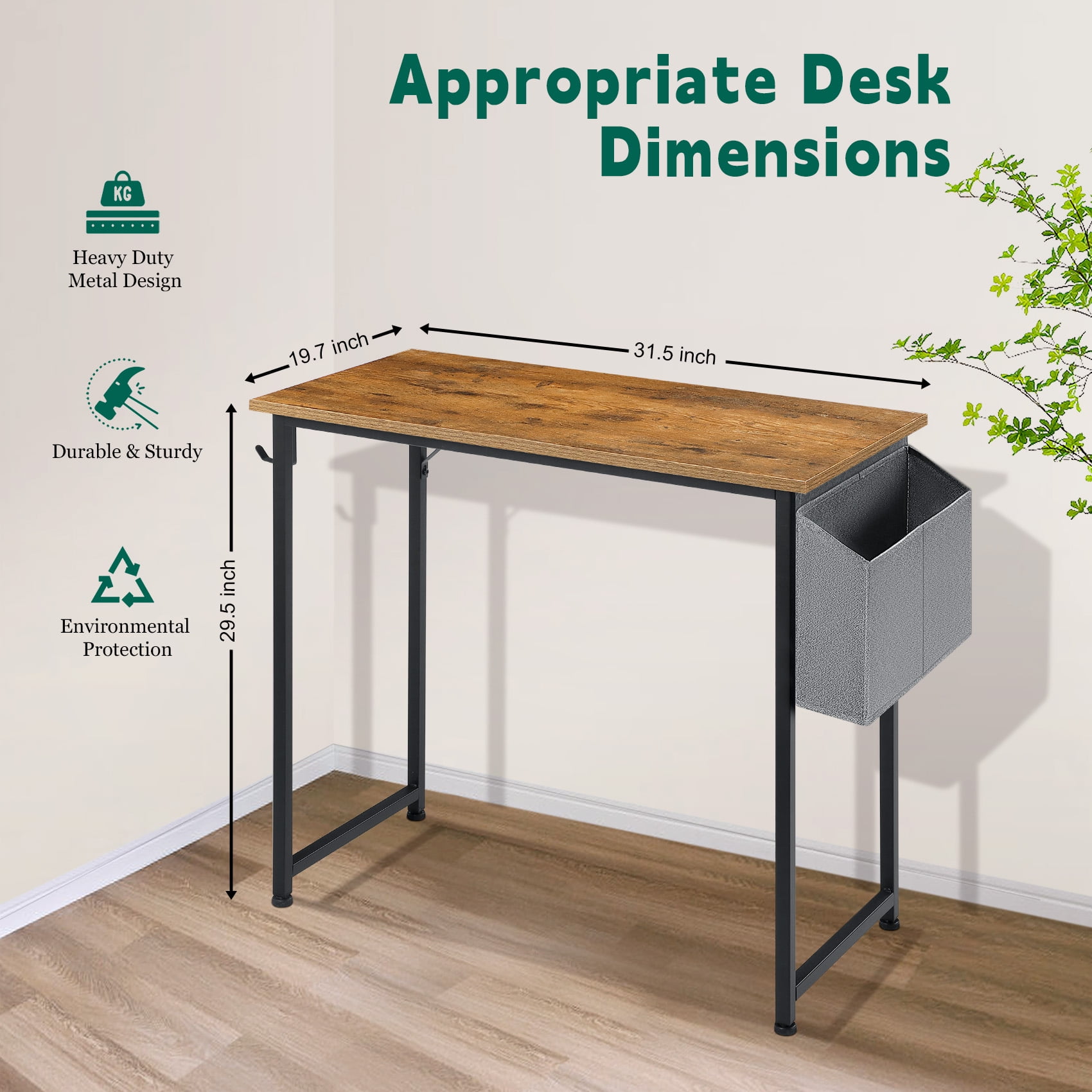 【PREMIUM DESKTOP MATERIAL】 The computer desk is made of 0.7” thick environmental E1 standard particle wood which meets the safe air standard, safe for adults and toddlers, The computer desk also features scratch-resistance, anti-collision and waterproof for easy to clean and protect the home office desk surface from daily wear and tear, Is smooth with little texture providing you a more comfortable touch 【DURABLE & SPACIOUS】 The compact gaming desk bracket is reinforced with the strong steel material and a triangular connecting design which ensure the stability of the home office desk, and provide reliable support for all day use, The anti-shake construction guarantees long-lasting performance and a sleek appearance that complements various interior styles, The spacious desktop is large enough to accommodate your work and study essentials 【CONVENIENT ACCESSORIES】 The storage pocket can bu used to organize various items such as miscellaneous items, books and files that organizes your working space more efficiently and keeps your supplies organized and easily accessible, The multifunctional hook provides convenience for hanging headphones, umbrellas, etc, effectively ensuring a clean and orderly desktop, Rubber foot pads prevents the table from moving and reduces movable noise 【SUITABLE SIZE & MULTIPURPOSE USAGE】 The space saving dimension of the computer desk is 31.5 x 19.7 inch that allow the desk can be placed in different locations or corners according to needs, creating a functional workspace in small areas, The height is 29.5 inch that provides plenty of legroom, Is suitable for different styles of scenes that can be placed in your home study and office to serve as a computer desk, office workstation or gaming desk 【EXCELLENT APPEARANCE & CONVENIENT ASSEMBLY】 The modern simple style of the home office desk matches well with various furniture style, and adds elegance and practicality to your living space, so you simply cannot go wrong with this addition to your home or office decor, Detailed instruction manual and included hardware make assembly quick and hassle-free, Just please pay attention that you choose the right parts an screws in assembling