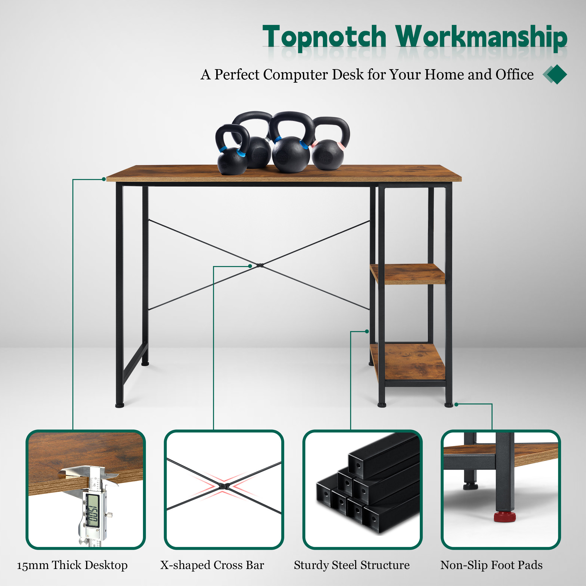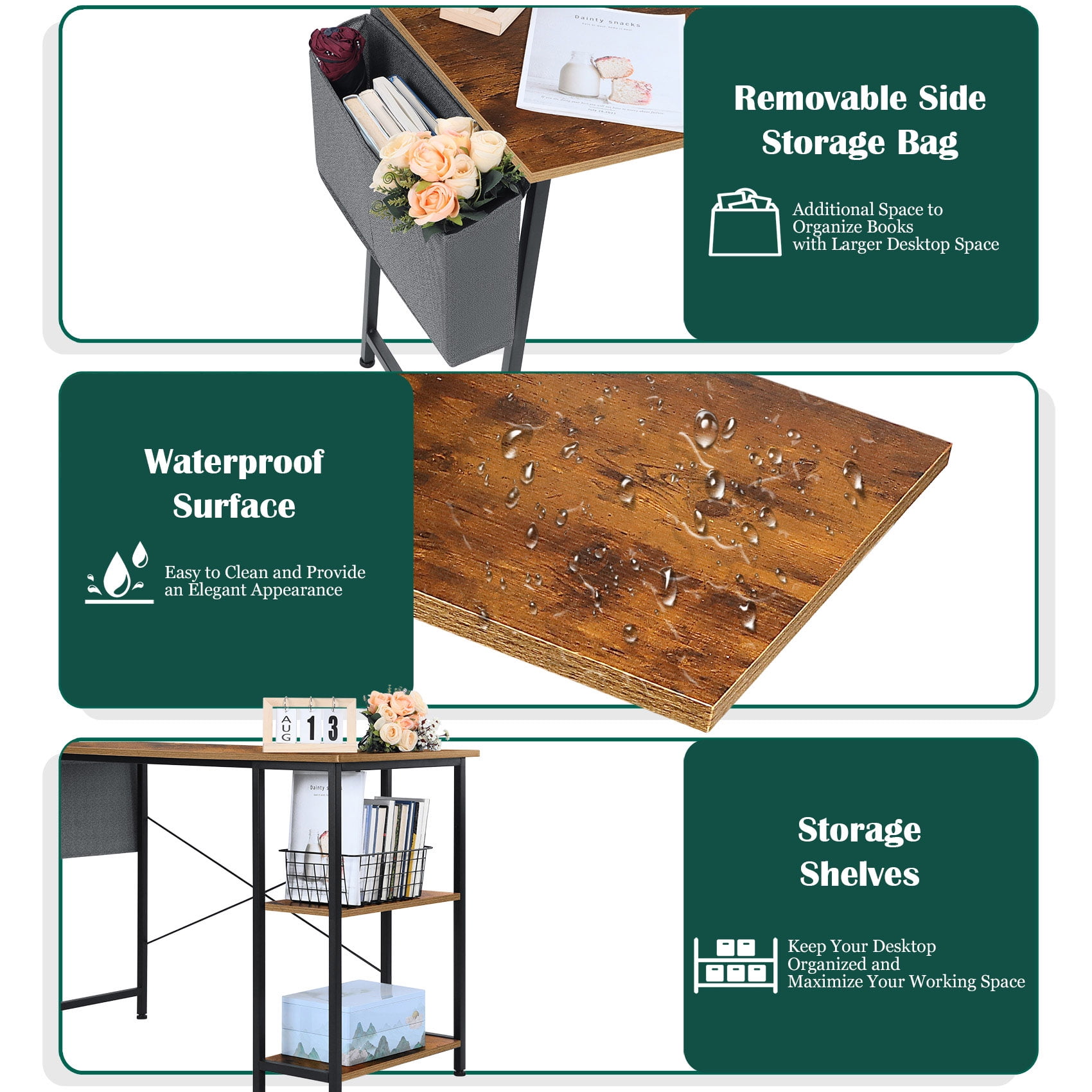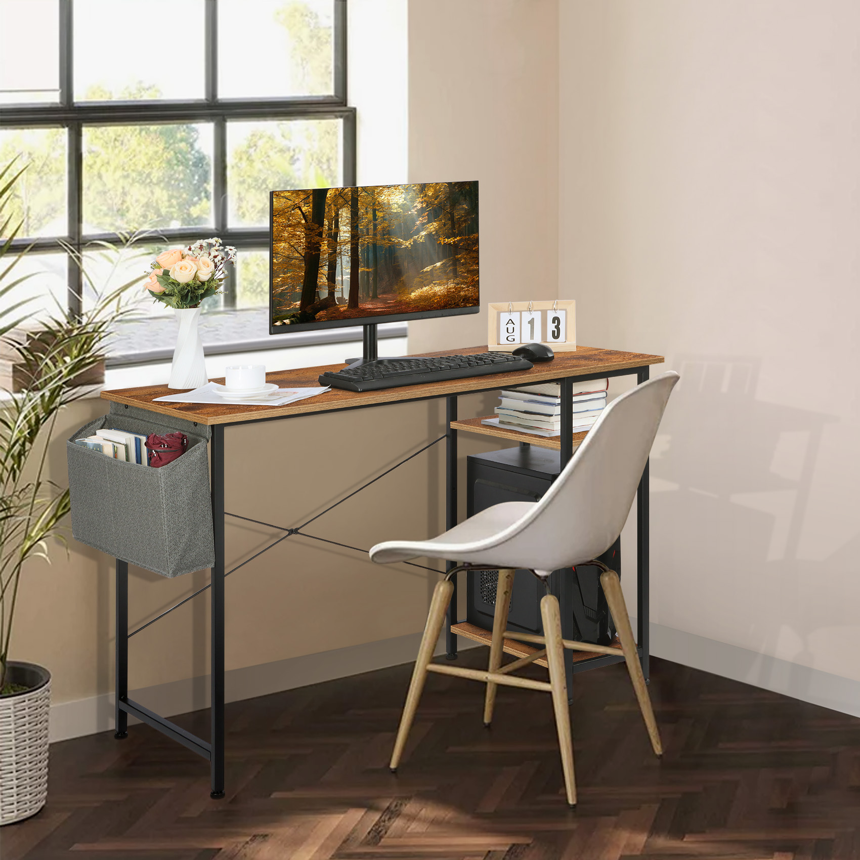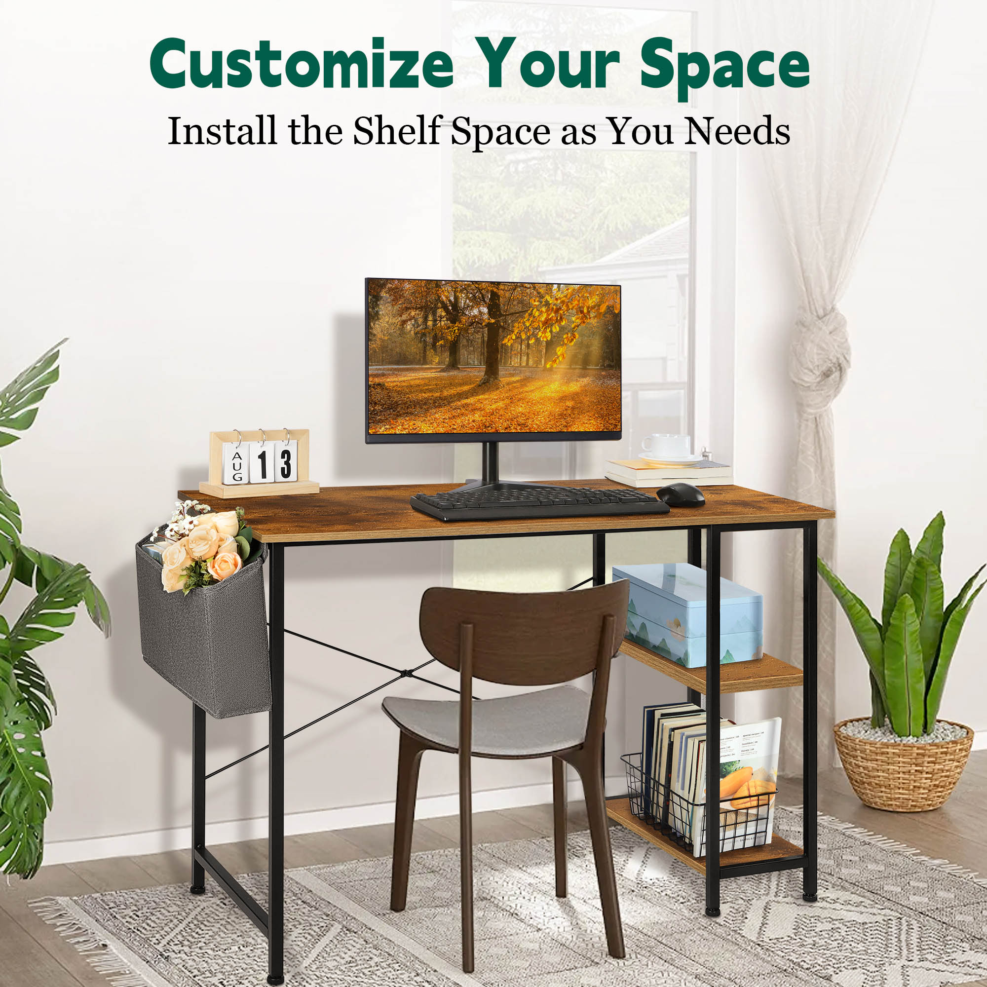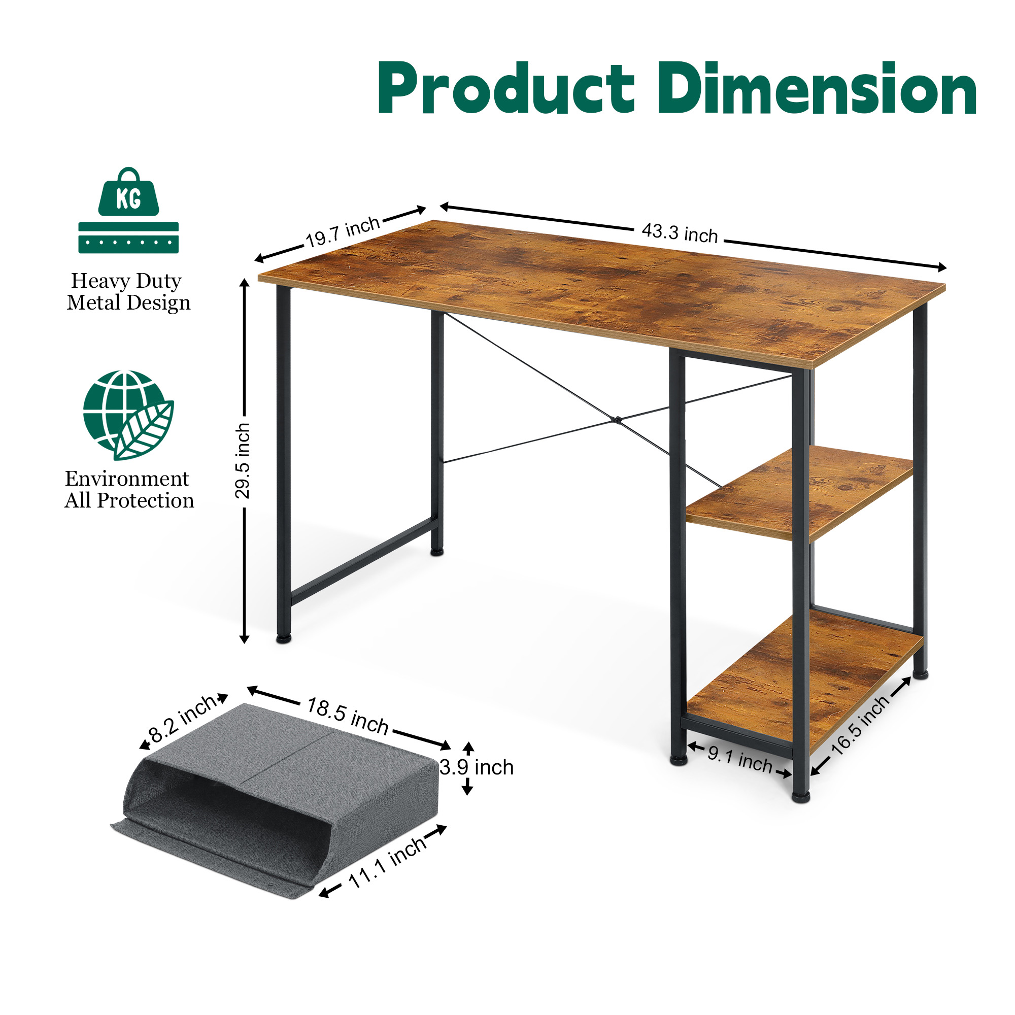 Coliware 43.3 inch Home Office Study Work Gaming Computer Desk Coliware work study PC desk with extra storage space and capacious desktop offers ample space for your computer, offices documents and other supplies, Proper size make the desk definitely fit to small corner space, great for home or office in need of a space-saving desk maximizing space of limited room, With an industrial charm appearance, Coliware modern simple style desk will become a beautiful decor in your living room and office About the Item: Multipurpose Storage Design: Additional storage space keep your workstation organized Premium & Durable Work Desk:Premium material guarantees a convenient and long-term use Ergonomic Design: Topnotch workmanship ensure the stability Modern & Simple Style:Proper size and elegant appearance make the desk suitable for various scenarios Fast Installation Study Writing Table: Clear instructions and included hardware make assembly quick and hassle-free Suitable for all age group such as Adult, Children, Teenage, etc. Product Information: Base Material: Metal Top Material: Particle Board Color: Basic Rustic Brown Dimension(D x W x H): 19.7 x 43.3 x 29.5 inch Packing List: Computer Desk x 1 Storage Bar x 1