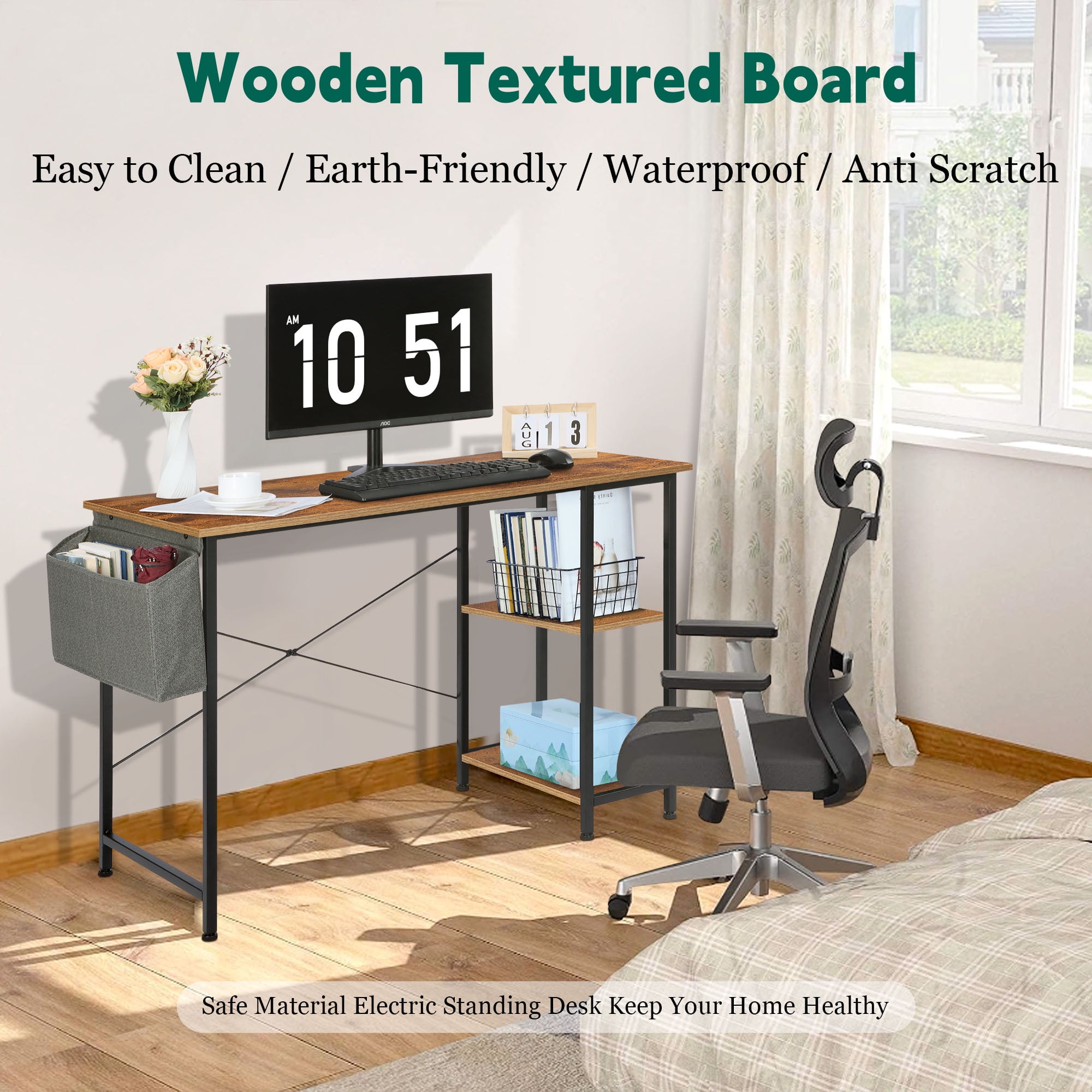 【PREMIUM DESKTOP MATERIAL】 The computer desk is made of 0.7” thick environmental E1 standard particle wood which meets the safe air standard, safe for adults and toddlers, The computer desk also features scratch-resistance, anti-collision and waterproof for easy to clean and protect the home office desk surface from daily wear and tear, Is smooth with little texture providing you a more comfortable touch 【DURABLE & SPACIOUS】 The compact gaming desk bracket is reinforced with the strong steel material and a triangular connecting design which ensure the stability of the home office desk, and provide reliable support for all day use, The anti-shake construction guarantees long-lasting performance and a sleek appearance that complements various interior styles, The spacious desktop is large enough to accommodate your work and study essentials 【CONVENIENT ACCESSORIES】 The storage pocket can bu used to organize various items such as miscellaneous items, books and files that organizes your working space more efficiently and keeps your supplies organized and easily accessible, The multifunctional hook provides convenience for hanging headphones, umbrellas, etc, effectively ensuring a clean and orderly desktop, Rubber foot pads prevents the table from moving and reduces movable noise 【SUITABLE SIZE & MULTIPURPOSE USAGE】 The space saving dimension of the computer desk is 31 x 19.7 inch that allow the desk can be placed in different locations or corners according to needs, creating a functional workspace in small areas, The height is 29.5 inch that provides plenty of legroom, Is suitable for different styles of scenes that can be placed in your home study and office to serve as a computer desk, office workstation or gaming desk, Suitable for all age group such as Adult, Children, Teenage, etc. 【EXCELLENT APPEARANCE & CONVENIENT ASSEMBLY】 The modern simple style of the home office desk matches well with various furniture style, and adds elegance and practicality to your living space, so you simply cannot go wrong with this addition to your home or office decor, Detailed instruction manual and included hardware make assembly quick and hassle-free, Just please pay attention that you choose the right parts an screws in assembling