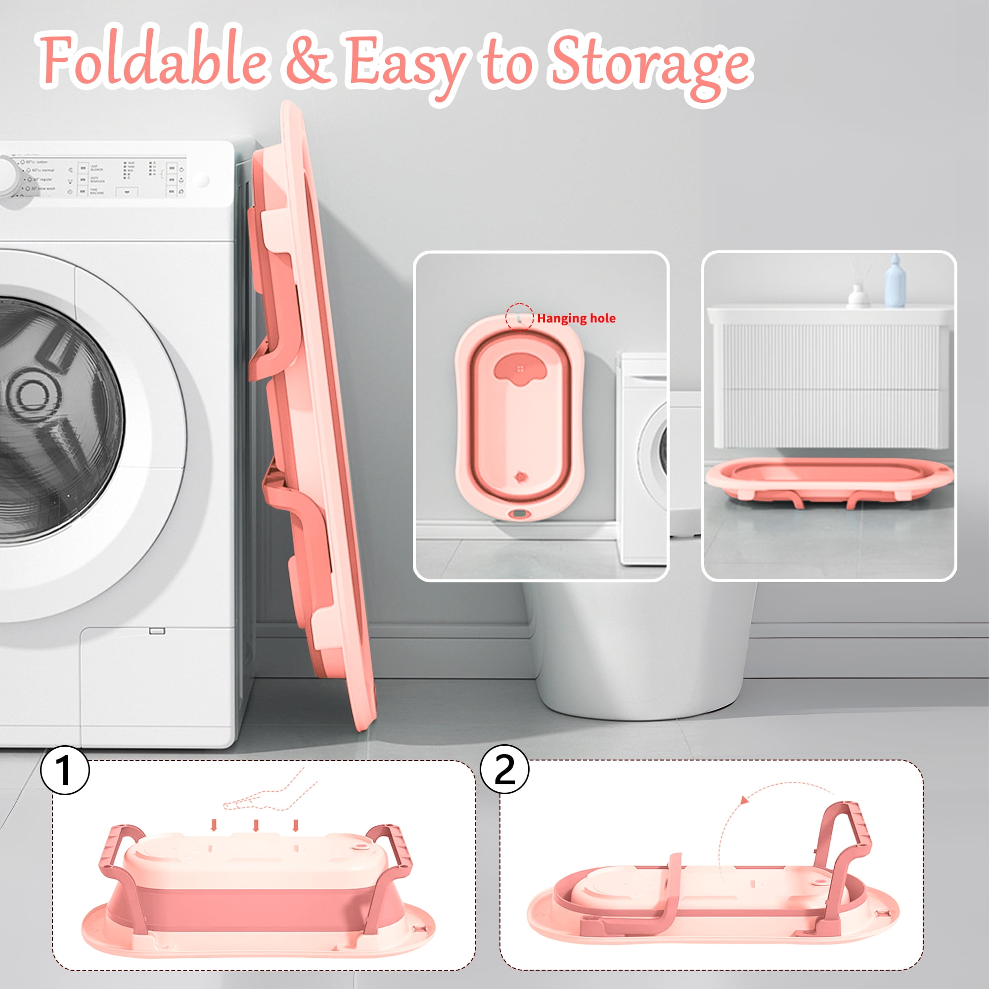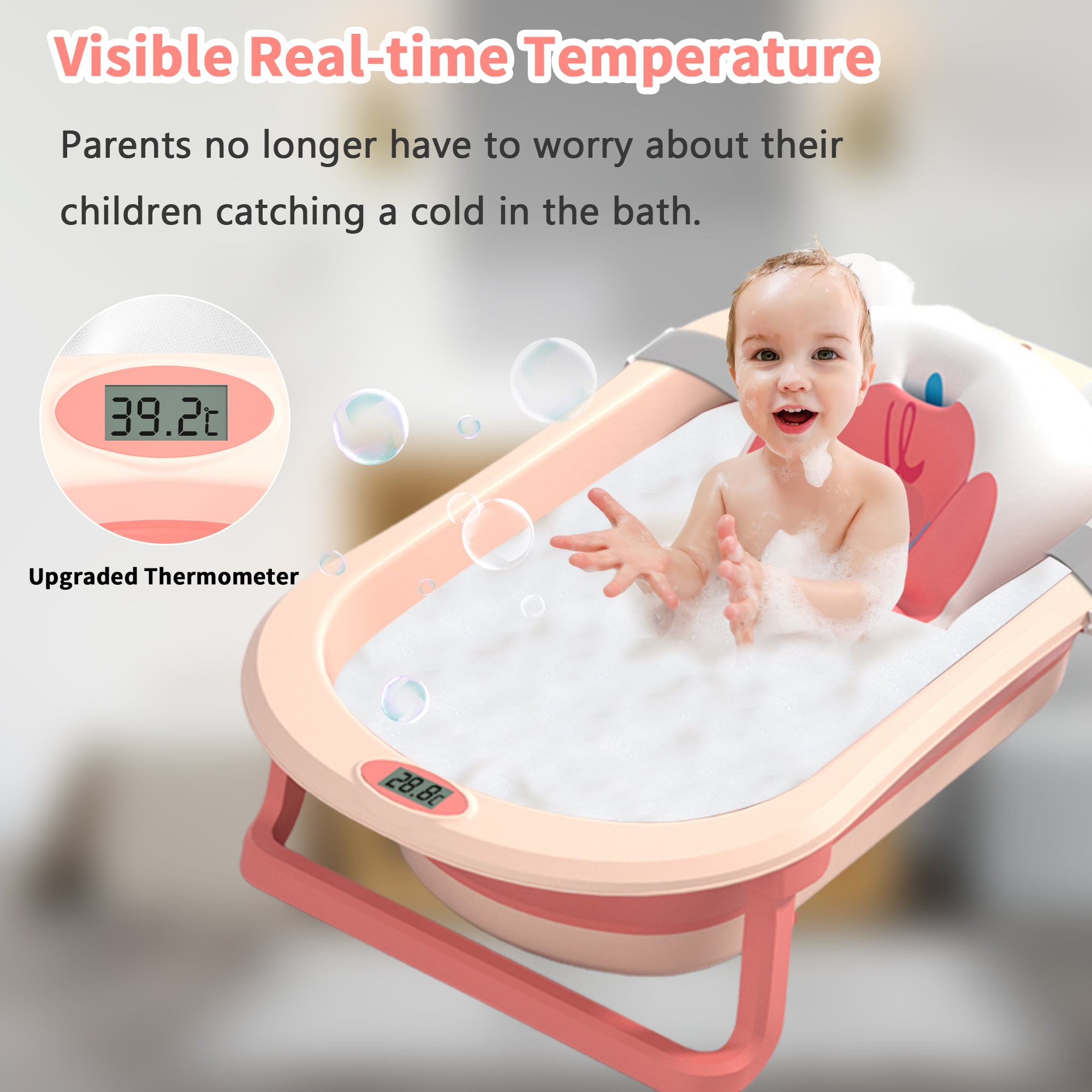 Collapsible Baby Bath Tub, Baby Bathtub for Infants to Toddler, Portable Travel Foldable Baby Bathtub & Thermometer, Drain Hole, Pink