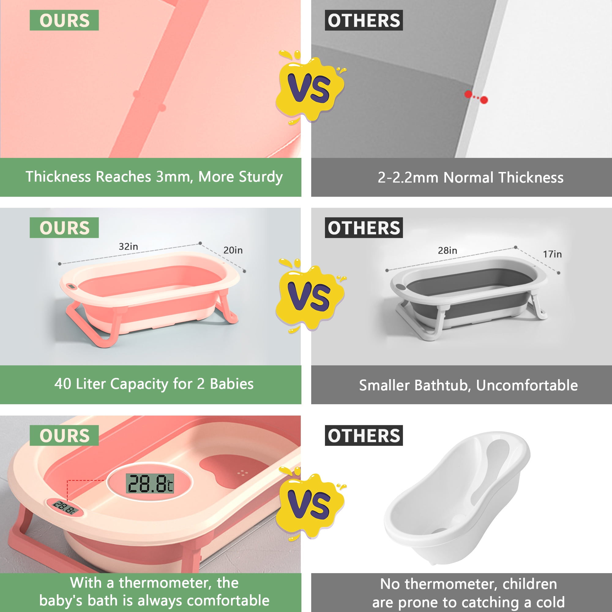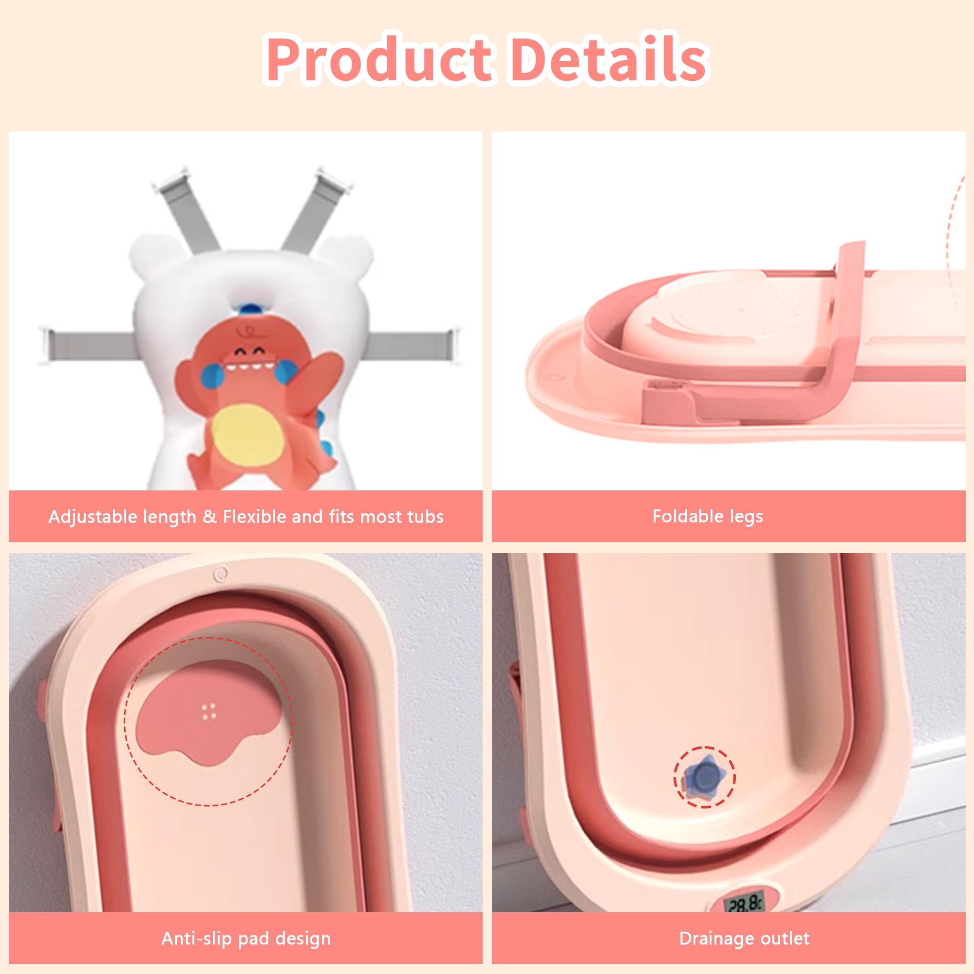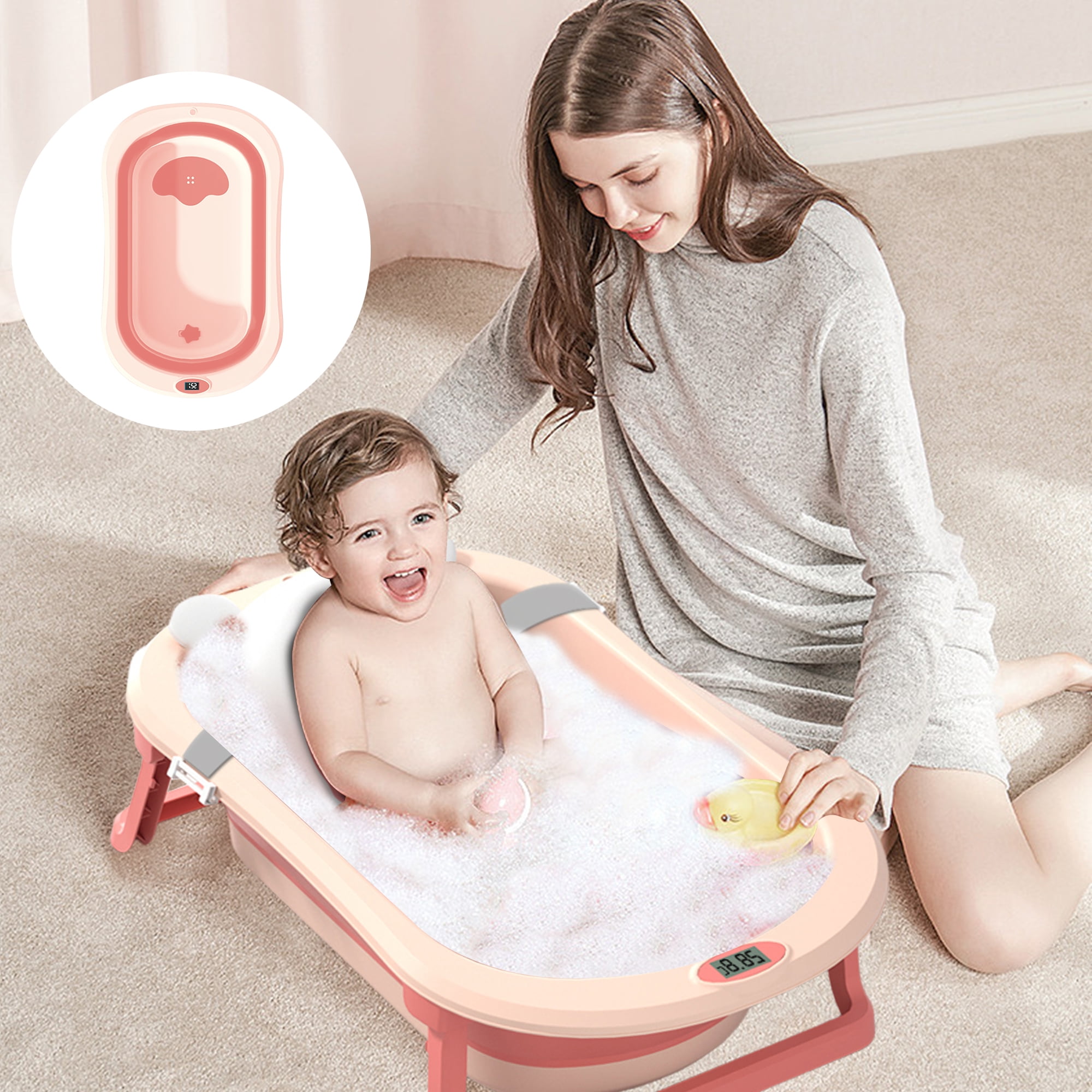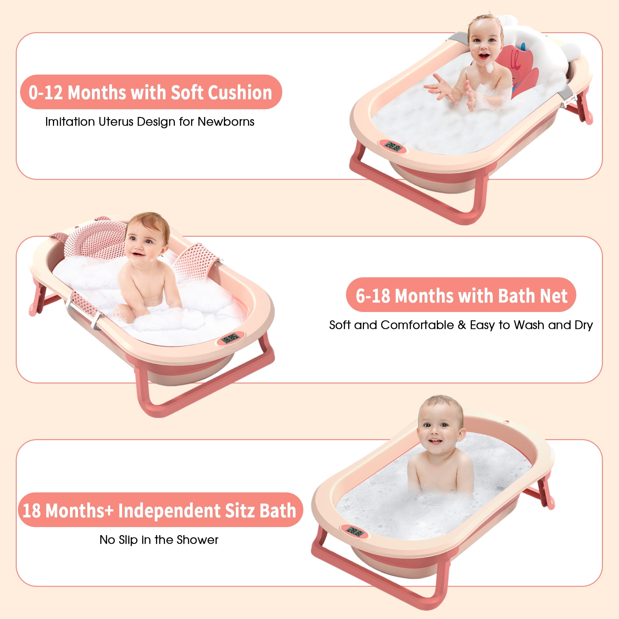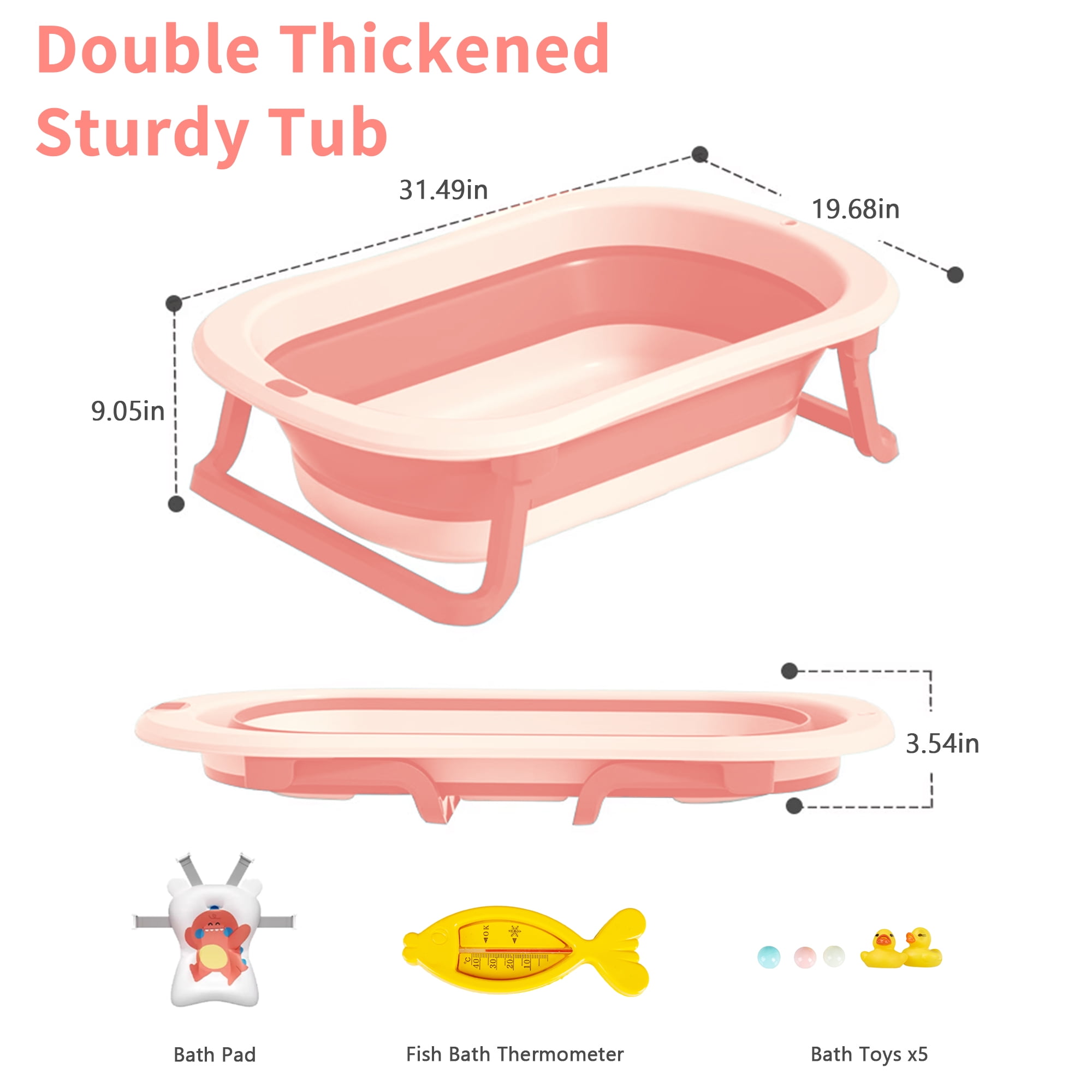 Smart Real-Time Thermometer: The baby bathtub is equipped with a real-time thermometer, making it convenient for parents to adjust the water temperature in time. Foldable & Space Saving: It folds to 3 inches thick in just two easy steps. It can be hung on the wall or placed in a cabinet, easy to carry when travelling or camping. Large Capacity for 2 Babies: The baby bath has a capacity of 40 litres, which makes babies to fully enjoy the fun of bathing. Drainage Hole Design: The bath is equipped with drainage holes to facilitate drainage and prevent water accumulation, keeping the bath clean and hygienic. 3 Collocations, 3 Stages of Growth: Designed to accompany babies from newborn to toddler, the foldable bath comes with a floating mat for babies aged 0-12 months and floating net for babies aged 6-18 months. After 18 months, baby can enjoy sitz baths independently. Package Includes: Baby Bath Tub*1+ Bath Pad*1+ Fish Bath Thermometer*1+ Bath Toys*5 Brand:RICHYOUNG Color: Pink; Green Gender: Unisex Kids, Baby Girls, Baby Boys Material: TPE & PP Special Features:Smart Thermometer; Foldable; Drainage Hole Capacity: 40L Age Range: 0-8 years old