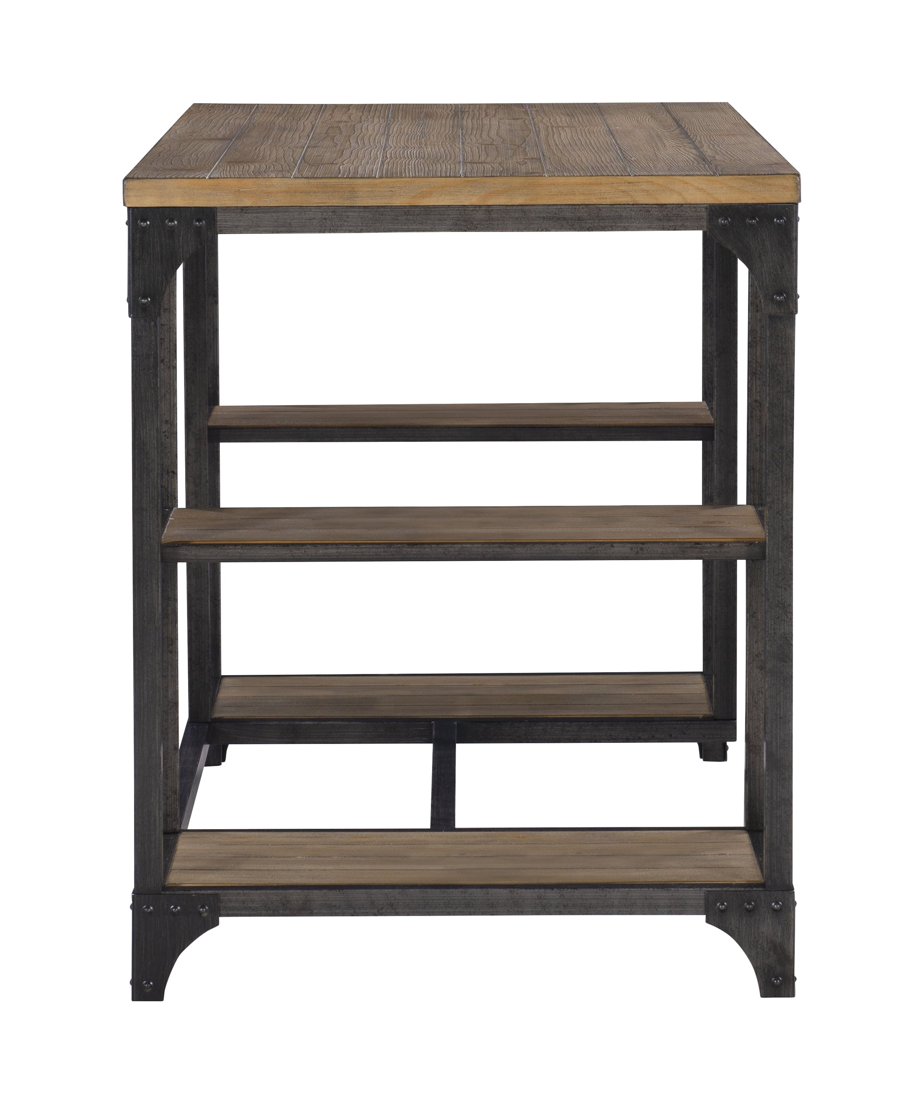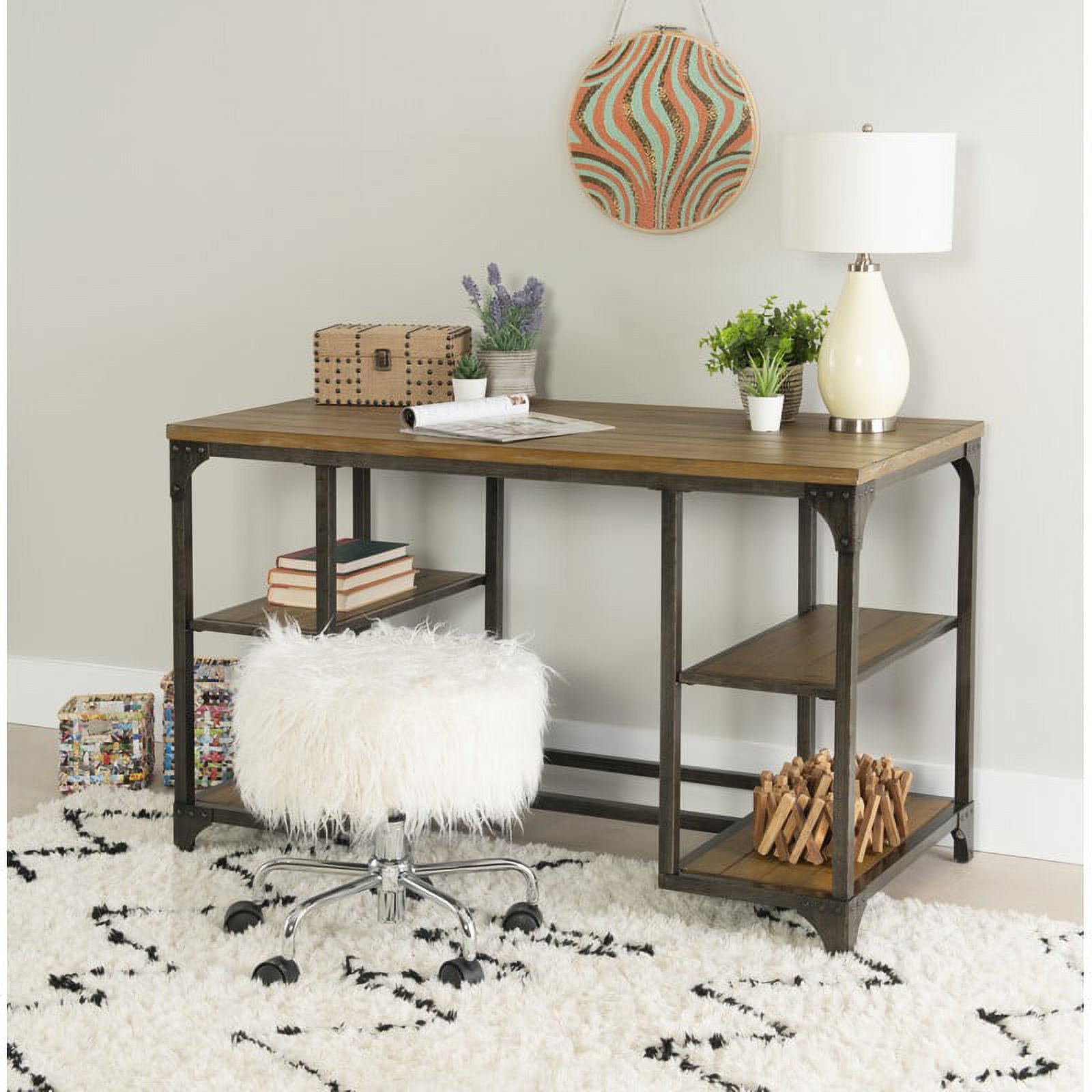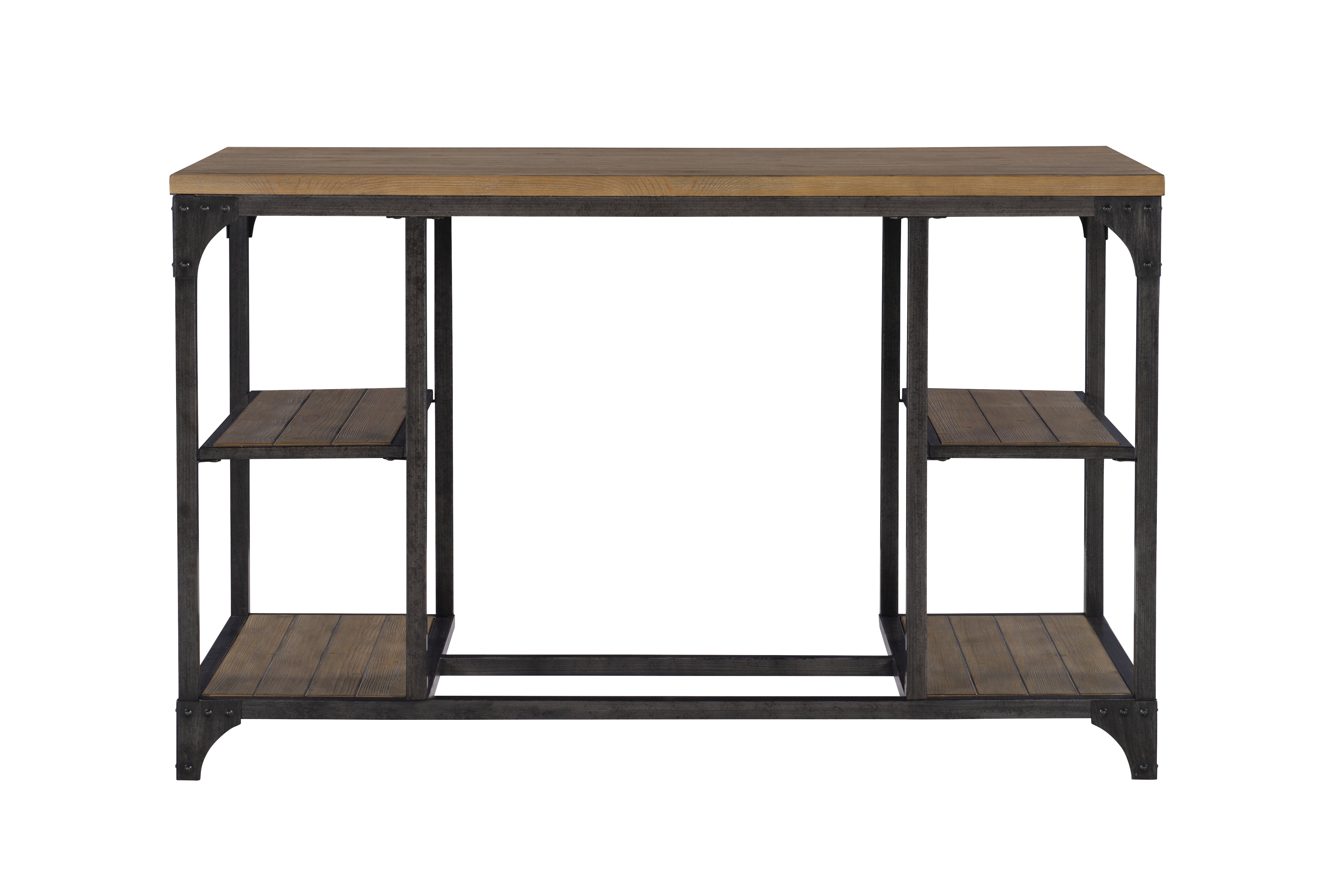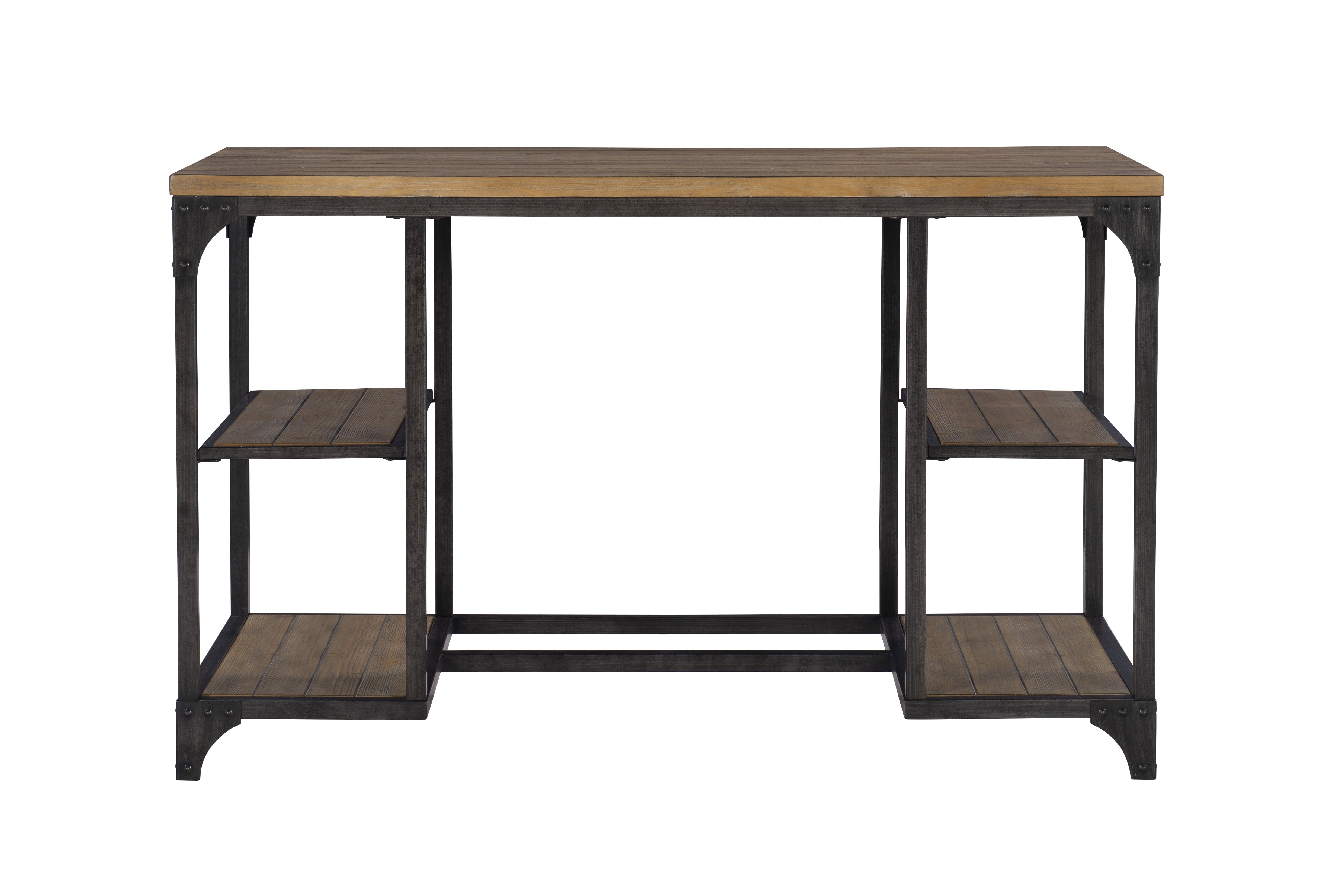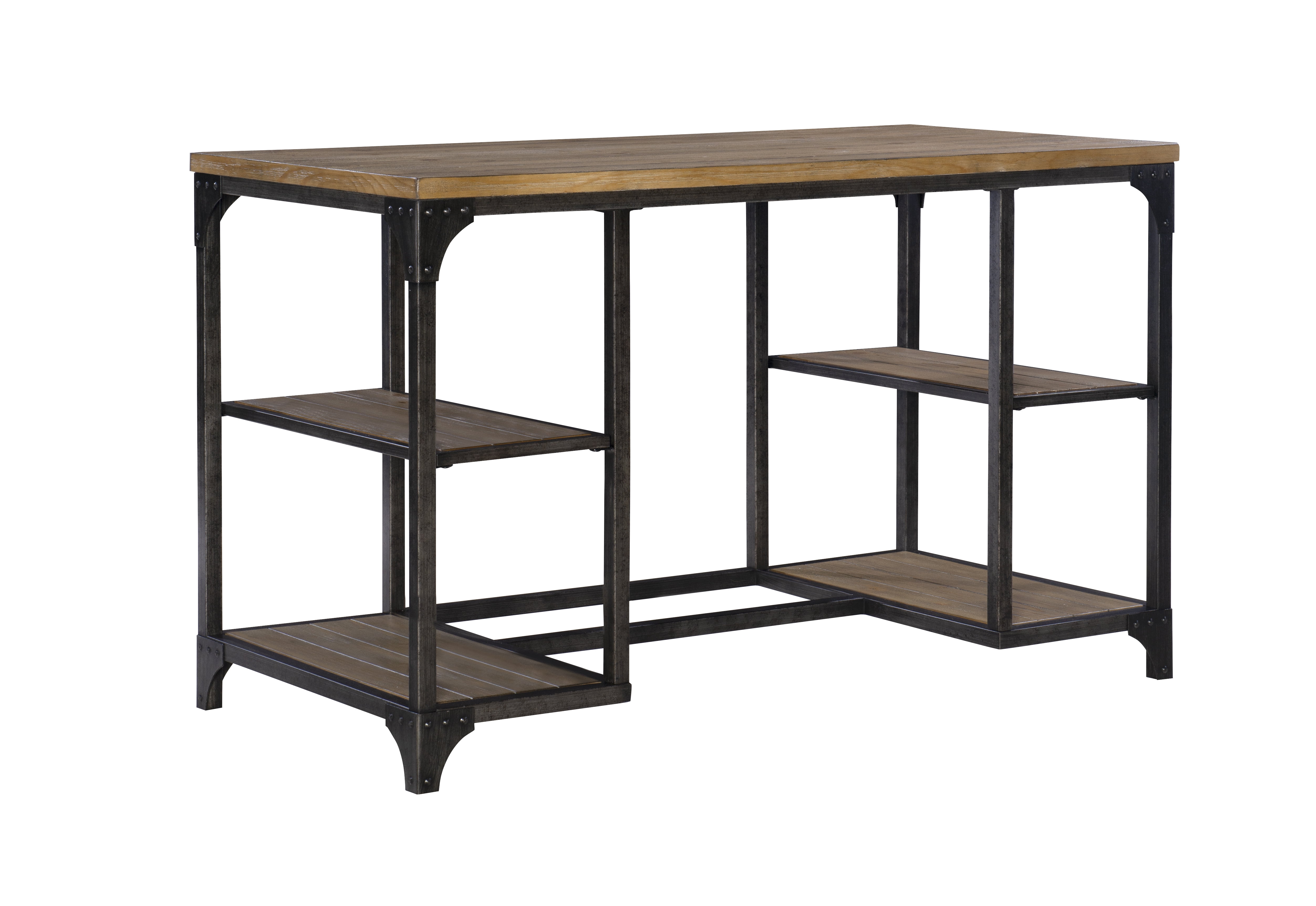 Features a spacious desktop Features a metal base with a planked weathered driftwood veneer four open shelves perfect for storage Features industrial touches with corner brackets and rivet details Some assembly required Assembled Dimensions: 48″ W x 24″ D x 30″ H Ships in one box
