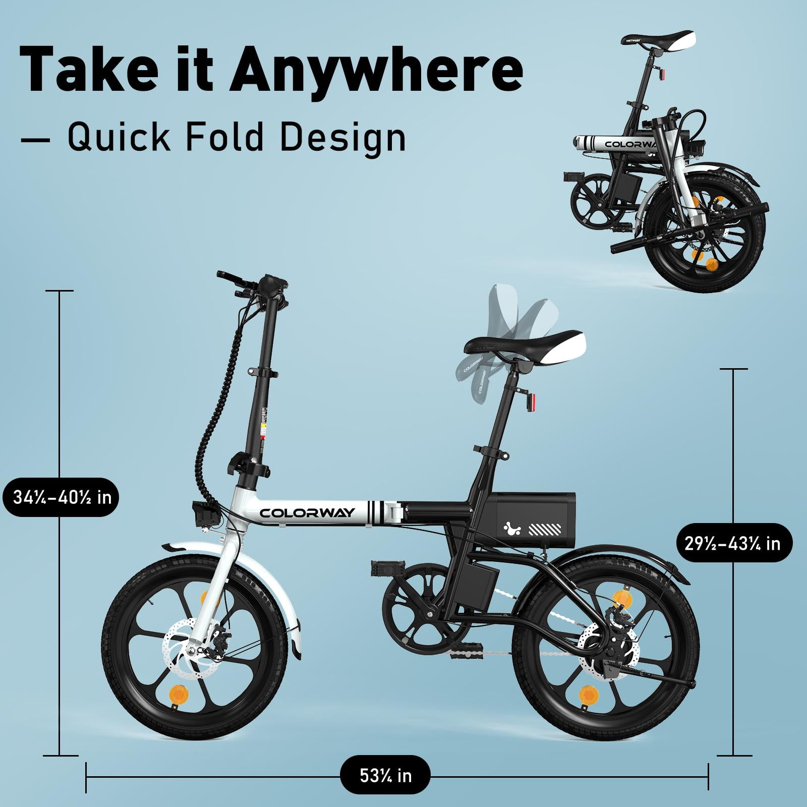 ????Ride like a breeze: COLORWAY BK35M Foldable Electric Bike is the ultimate solution for effortless commuting, whether you’re cruising in the city or exploring the countryside. Say goodbye to traffic jams and hello to smooth rides in style! ????Perfect performance:BK35M electric bikes comes with a reliable lithium-ion battery that charges in just 4-5hours. With a max.speed of 15MPH and max.range of up to 16-37MILE, you’ll have the freedom to discover new places and create lifelong memories. ????Portable & Practical: With its lightweight and foldable design, electric bike is perfect for urban dwellers and adventurers on the go. Easily stow it away in your car trunk, office, or even carry it on public transportation. It’s your versatile companion for any adventure! ????Unleash your inner explorer: Whether you choose the throttle mode or the pedal-assist mode, COLORWAY e Bike guarantees an enjoyable and efficient ride every time. Confidently navigate through city streets, all while enjoying the thrill of the journey. ????Quality and durability: Crafted from high-quality aluminum alloy, BK35M e-bicycle is built to last. Designed to withstand various weather conditions and equipped with an IP54 waterproof rating, it’s ready to accompany you on all your outdoor escapades, rain or shine!We offer exceptional customer support and a 100% satisfaction guarantee. Purchase your new favorite mode of transportation today and experience the joy of effortless and eco-friendly commuting!